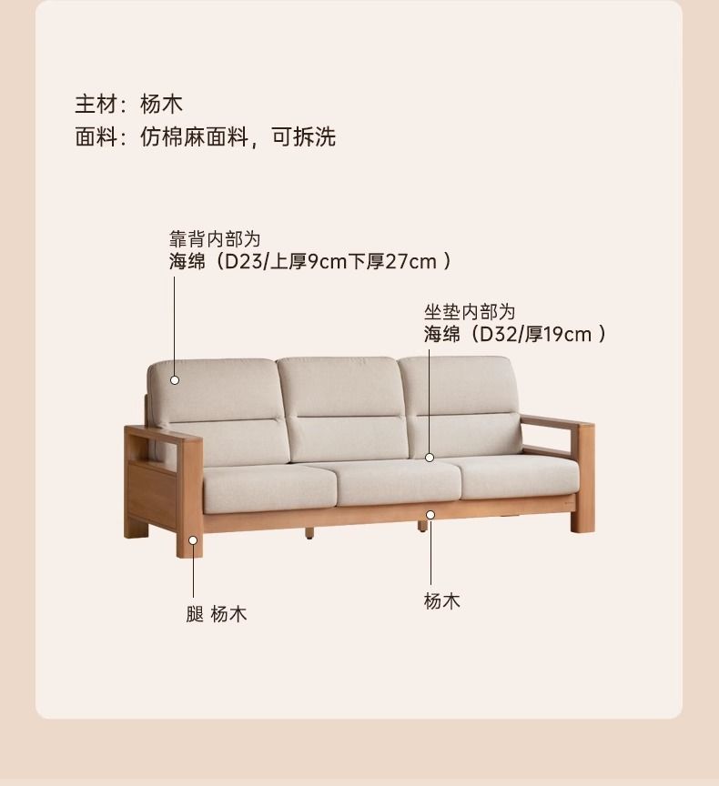 모든 단단한 나무 소파 새로운 중국 스타일의 포플러 패브릭 소파 간단한 대형 거실 통나무 가구