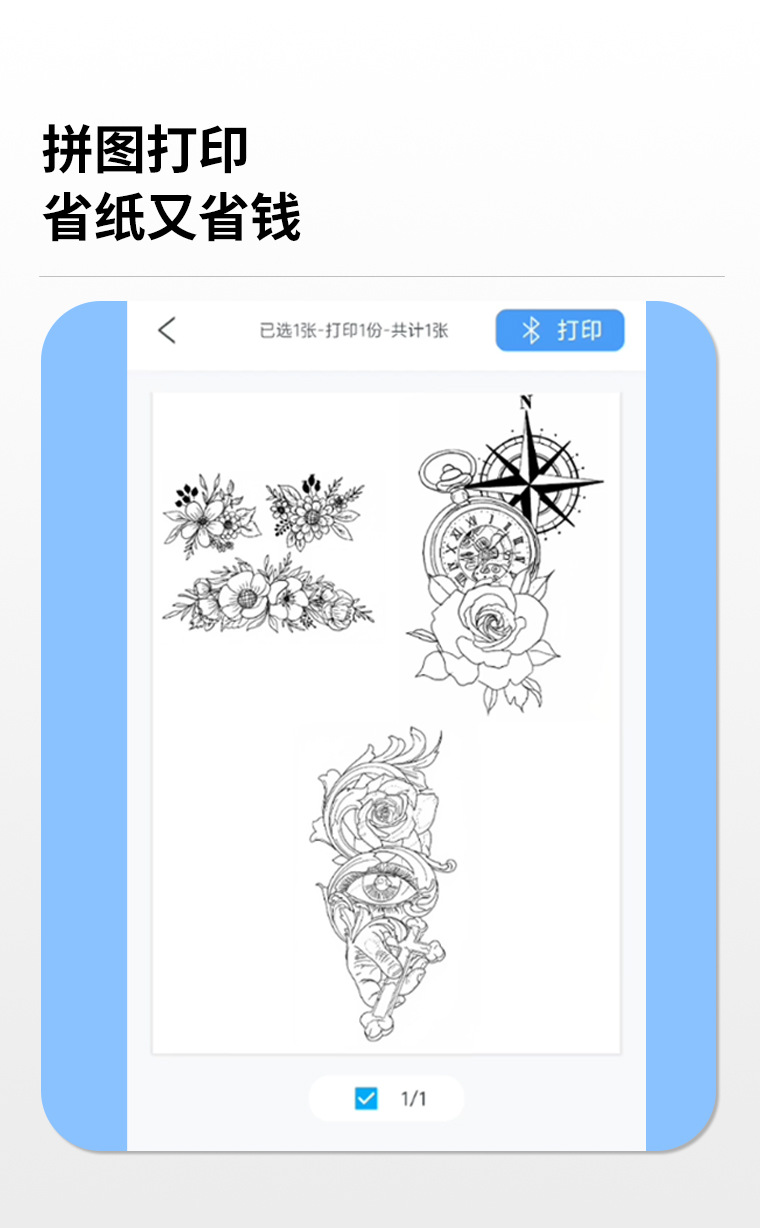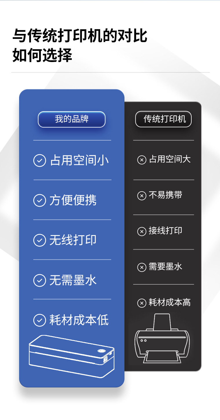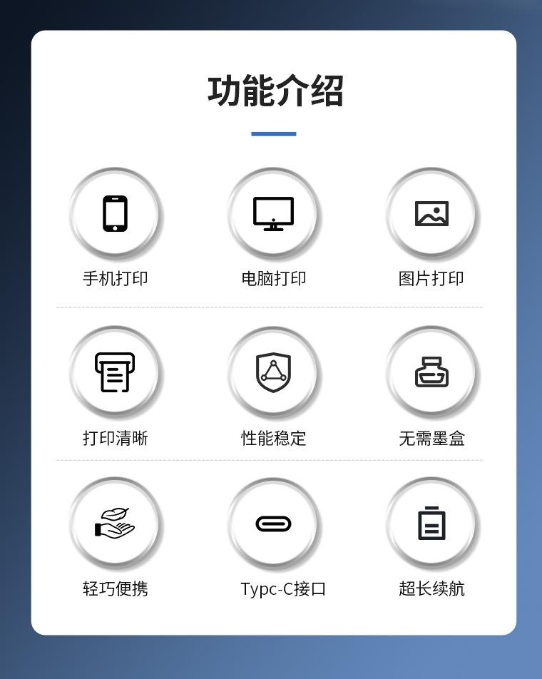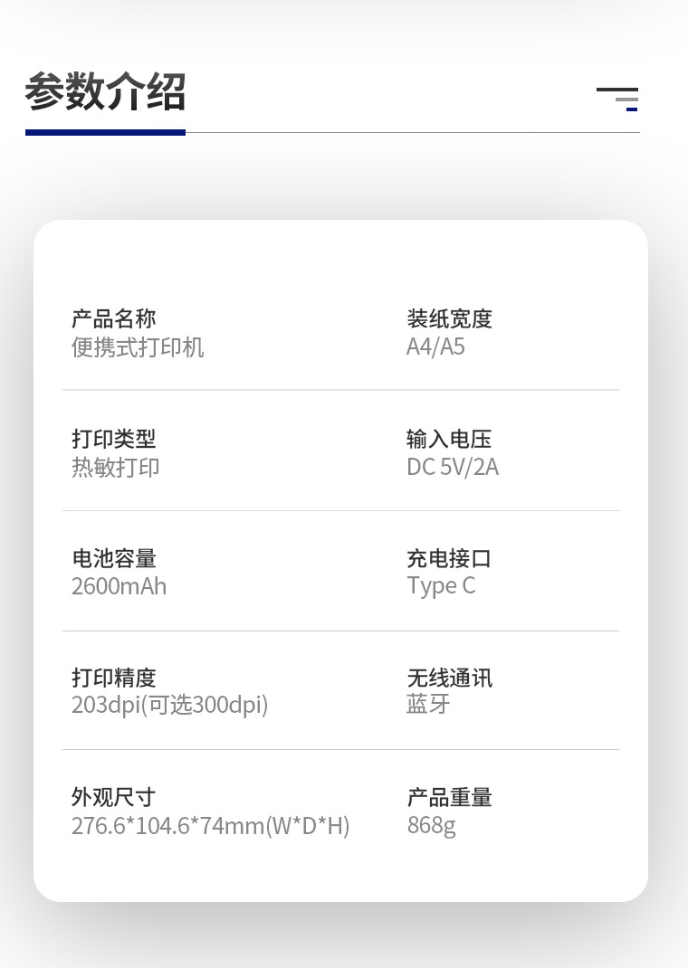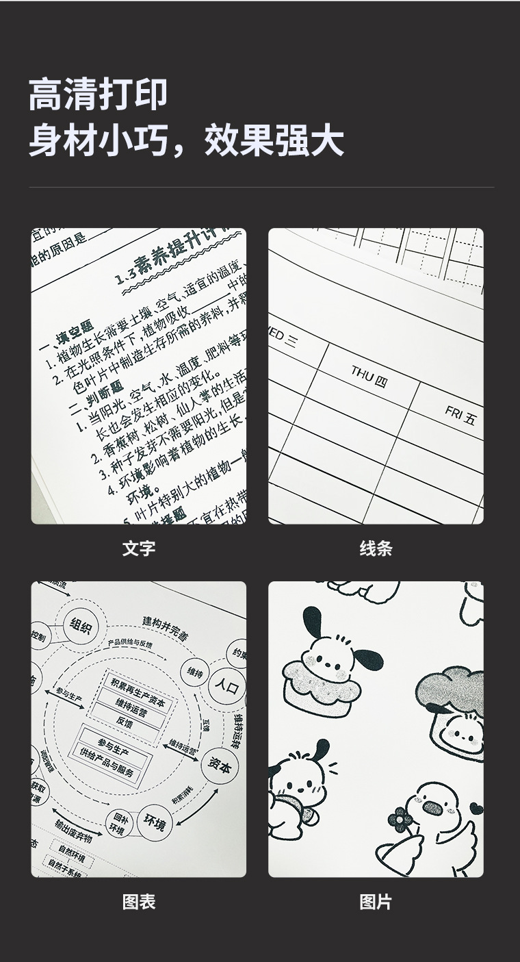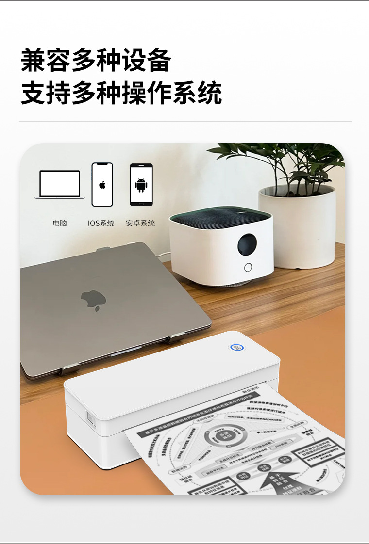 小巧便携,携带方便,随时打印,203dpi分辨率,先进的热敏技术,字迹清晰,保存时间长(5年以上),可锂电池供电,待机时间长,满电的情况状态下连续打印约200张A4纸,随机出厂配套可下载IOS和安卓系统APP,可打印PDF.word.网页.照片,合同.试卷等