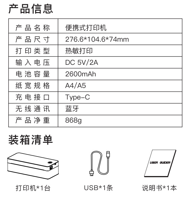 包装清单:A4打印机.USB数据线(Type-c).说明书