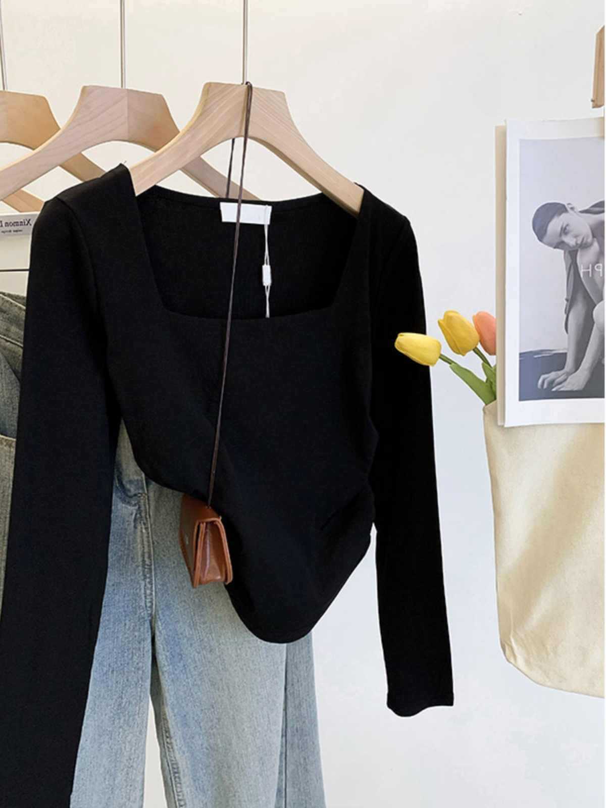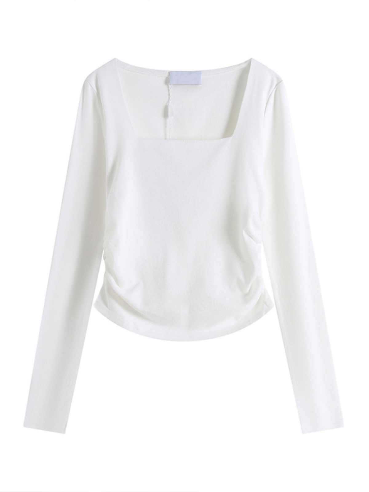 화이트 스퀘어 칼라베이스 셔츠 여성 내부 2024 새로운 봄과 가을 짧은 긴팔 잘린 트렌디 탑스토어 가기