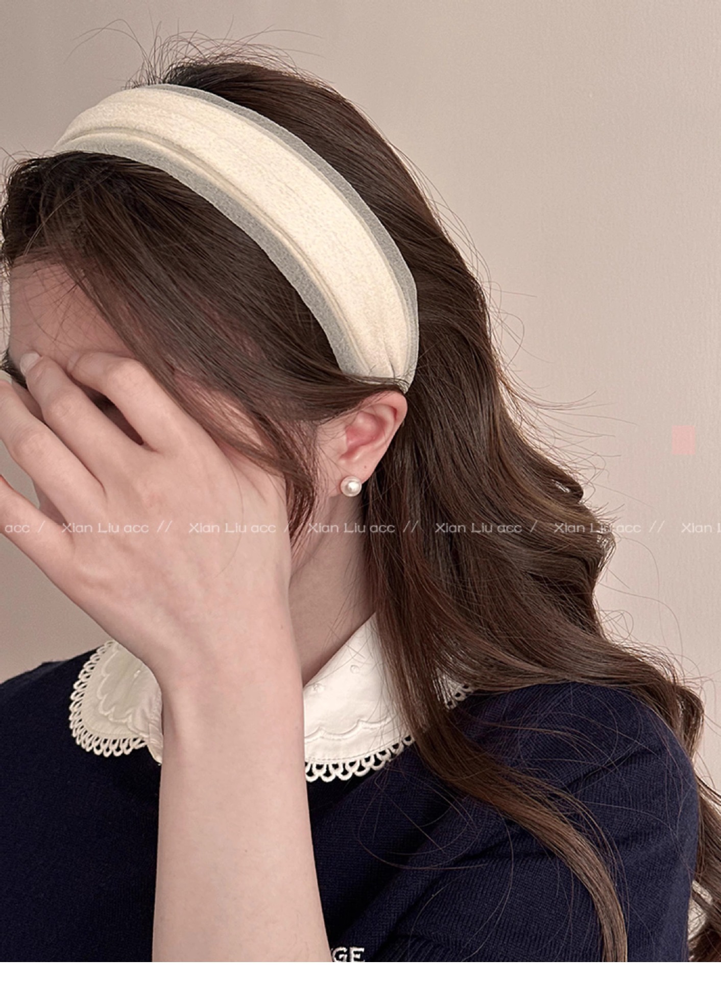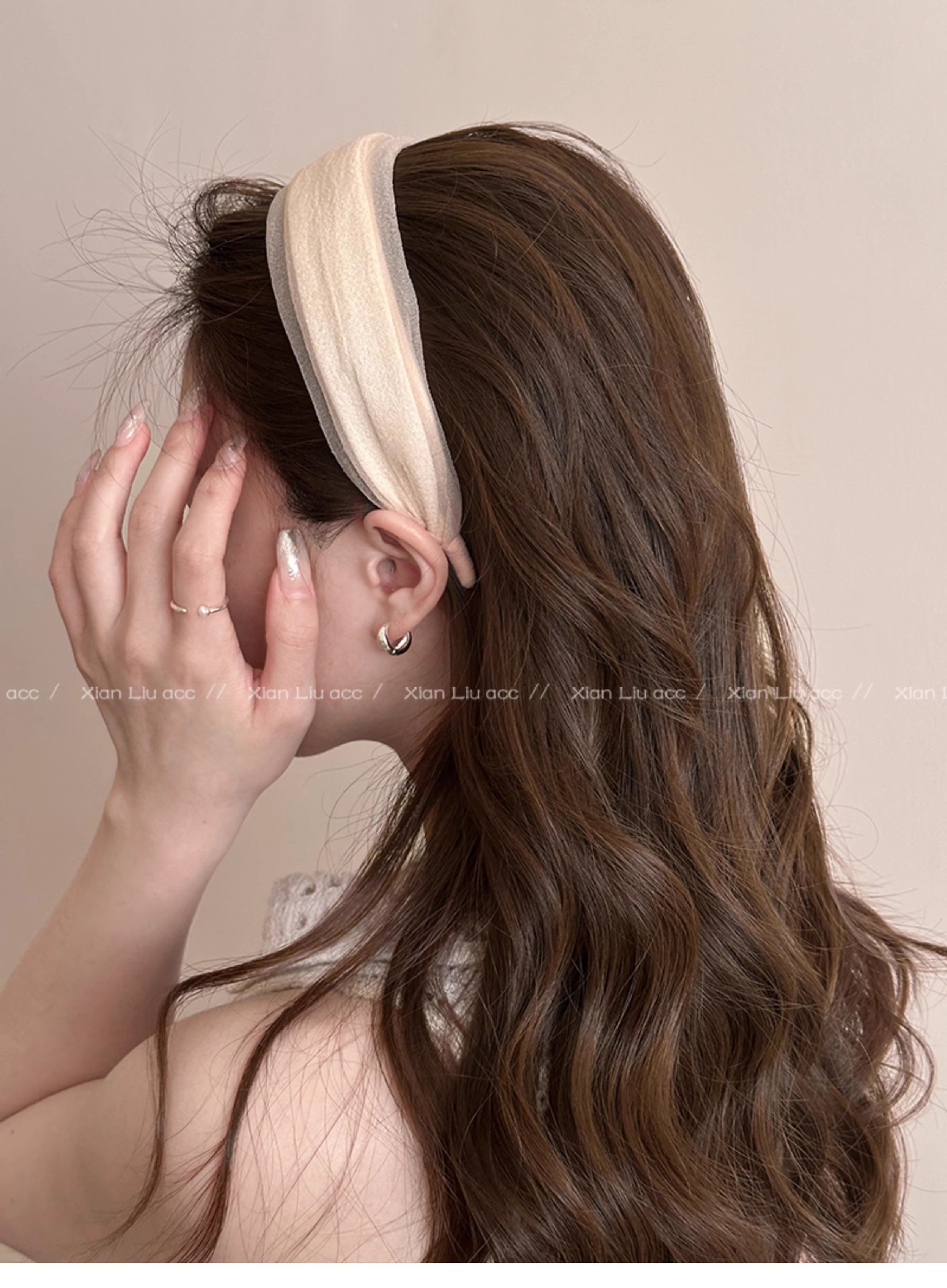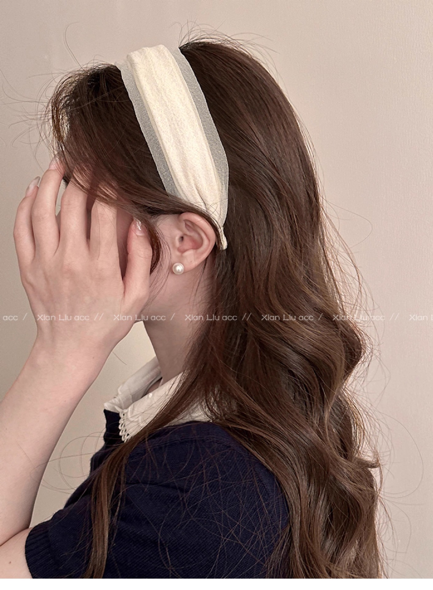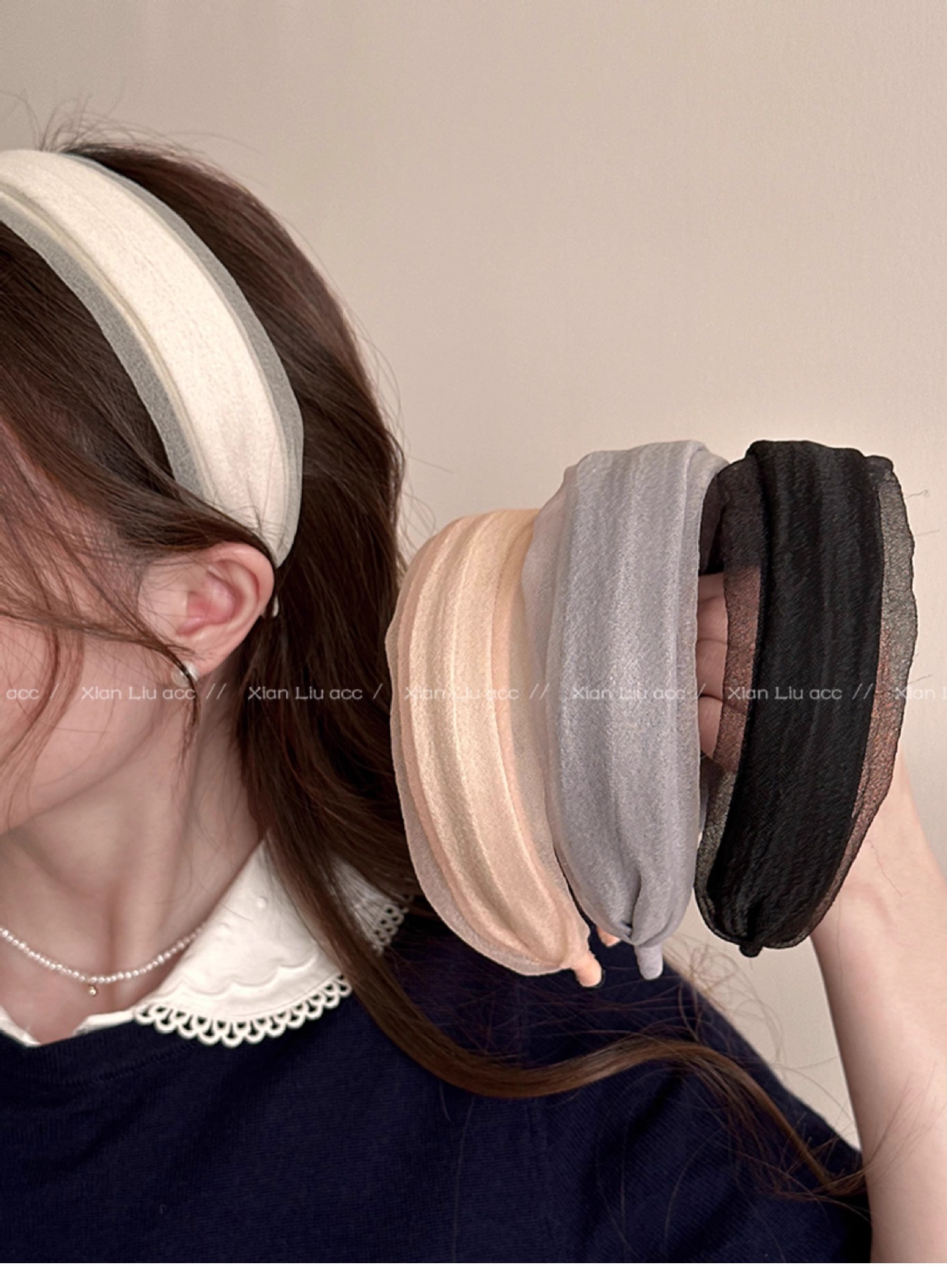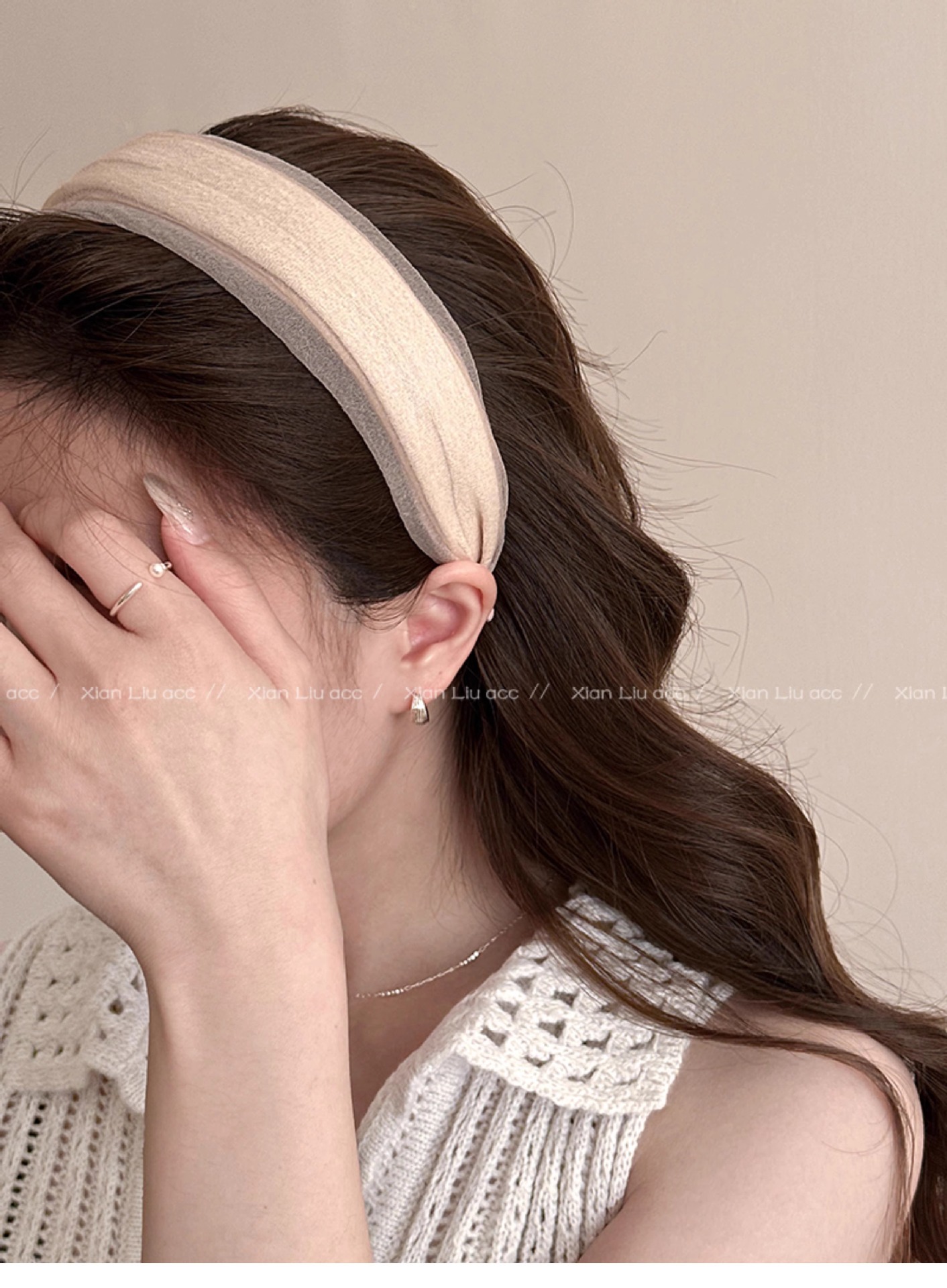 • 오프 화이트 메쉬 주름 머리띠