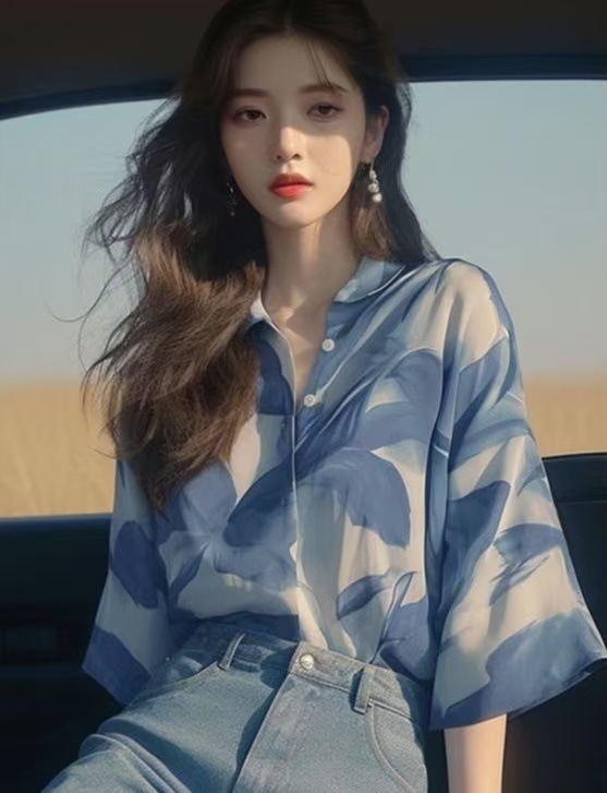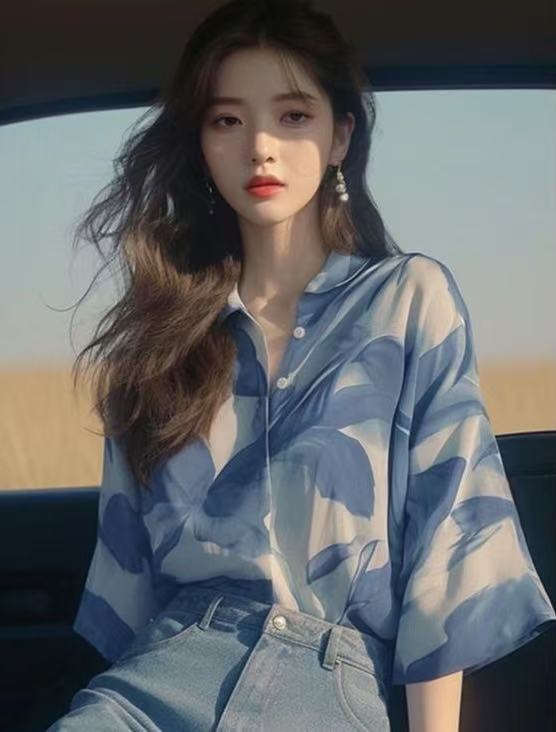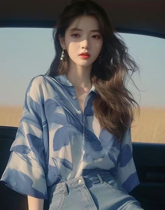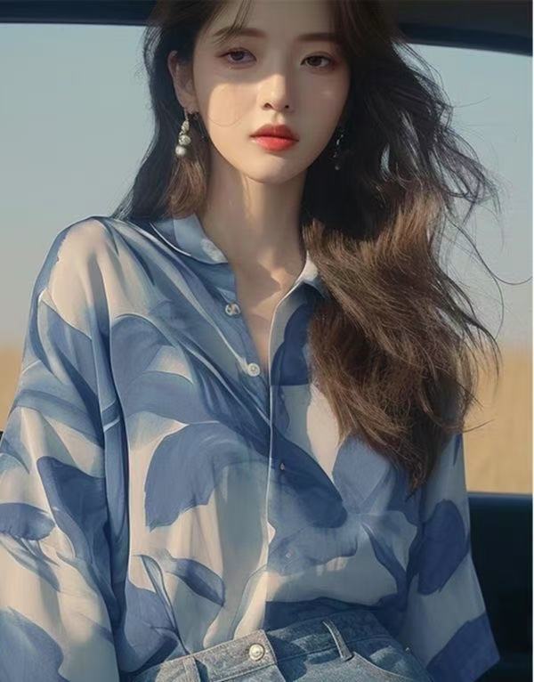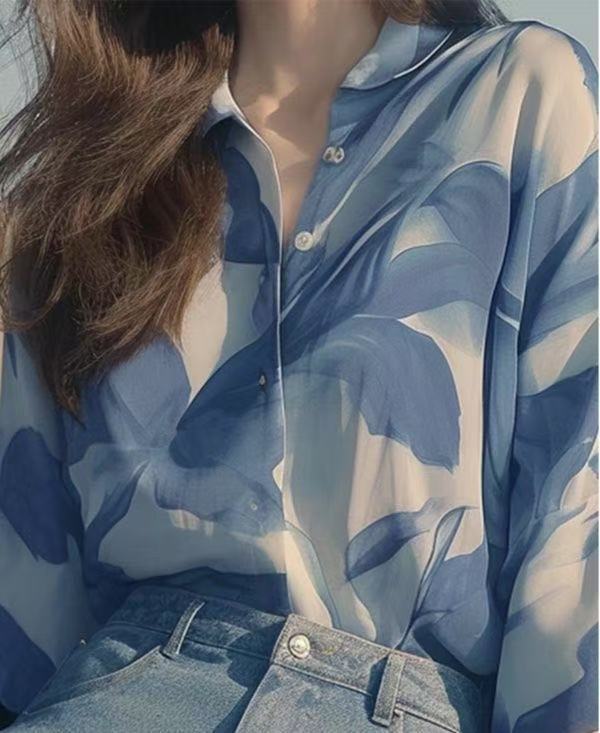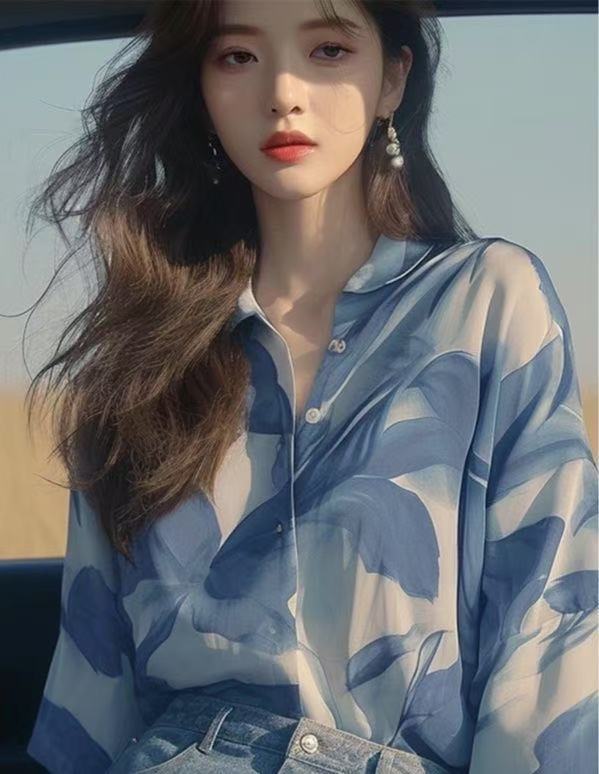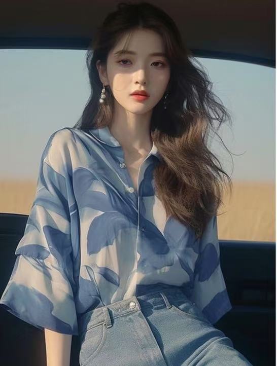 프렌치 스위트 스타일 탑, 독특하고 아름다운 셔츠, 고급스럽고 아름다운 블루 타이다이 쉬폰 셔츠, 여성 여름복스토어 가기
