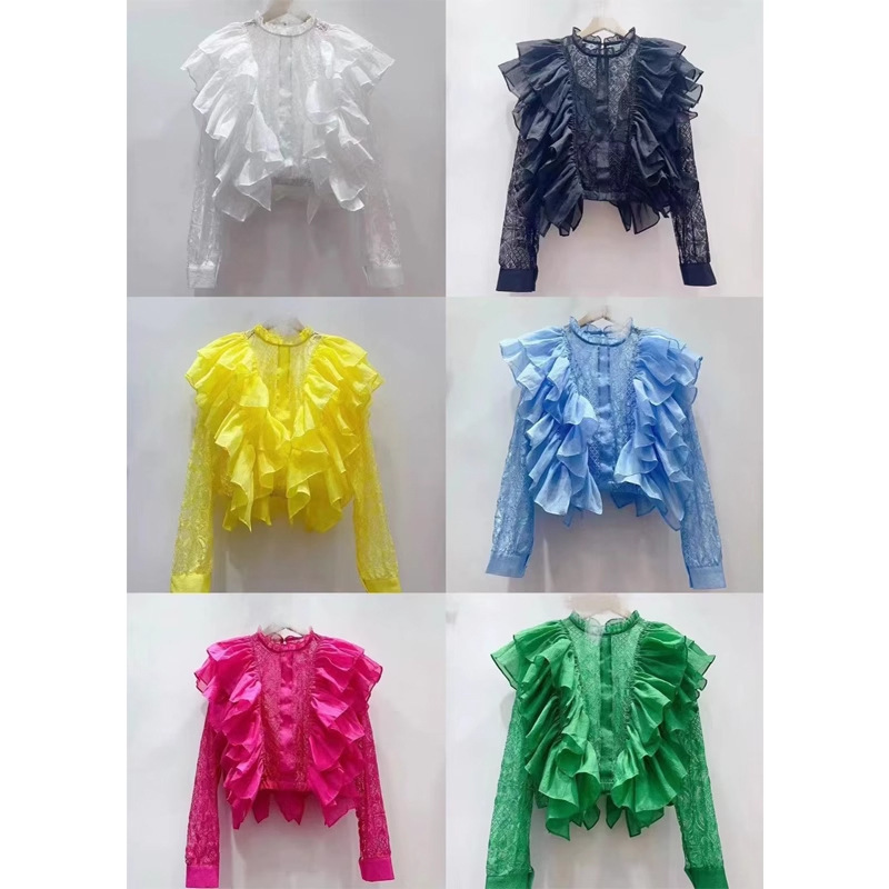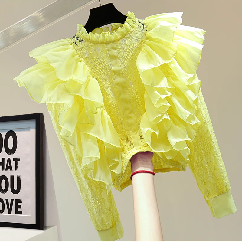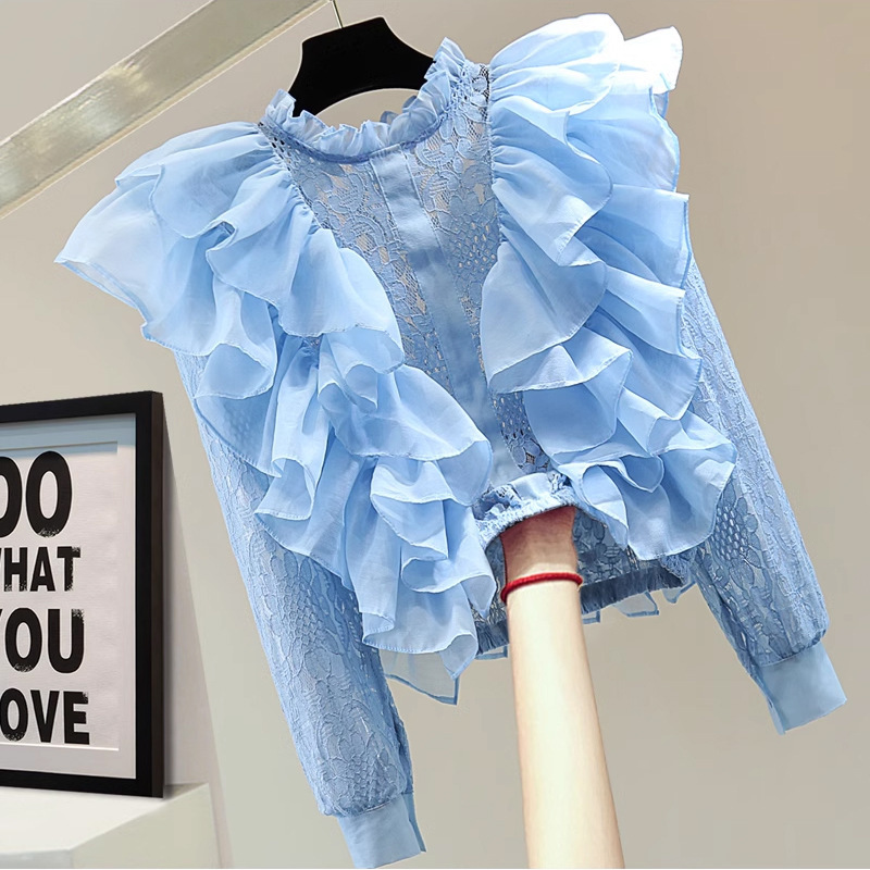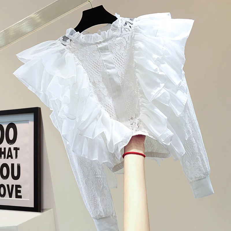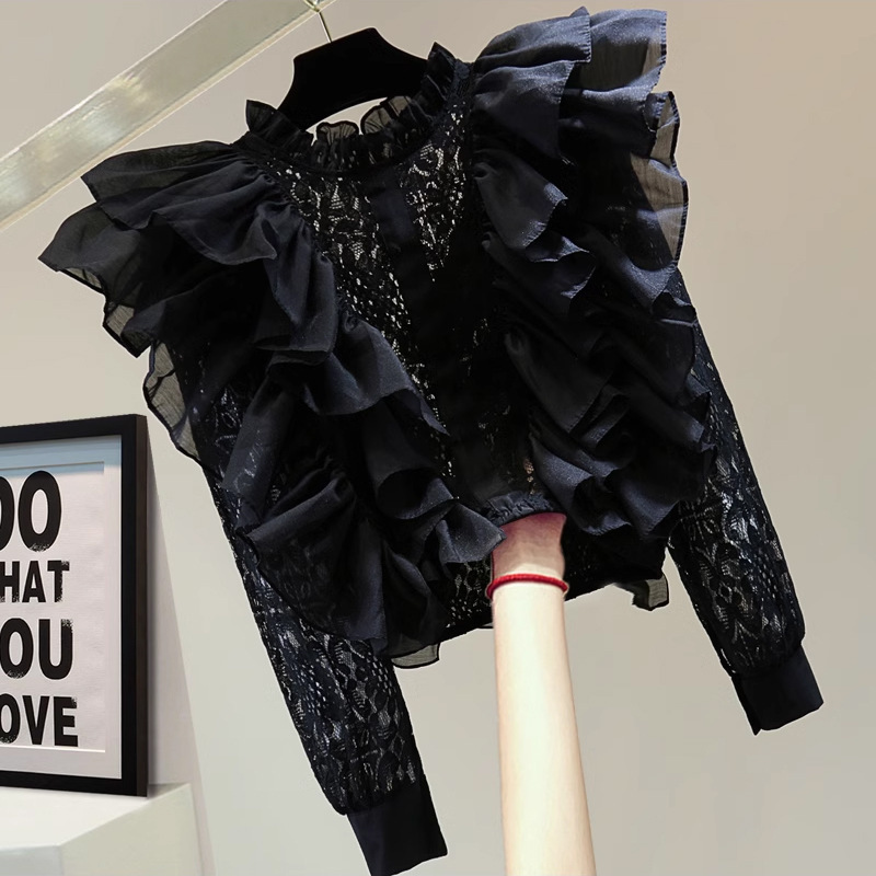 작은 허리를 위한 쉬폰 버진 헤어 스플리싱 긴팔 레이스 셔츠, 여성용 짧은 하이웨이스트 중공 러플 자외선 차단 셔츠스토어 가기