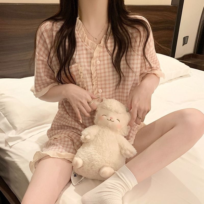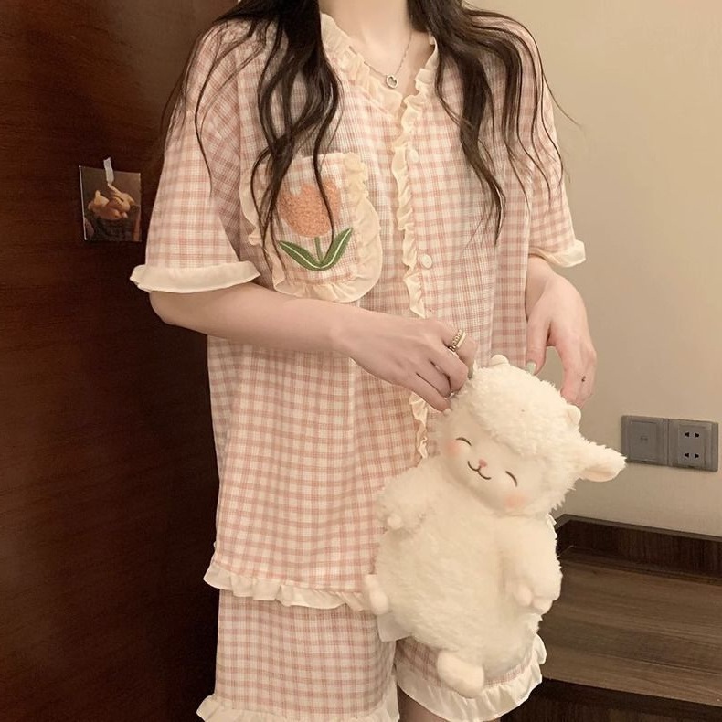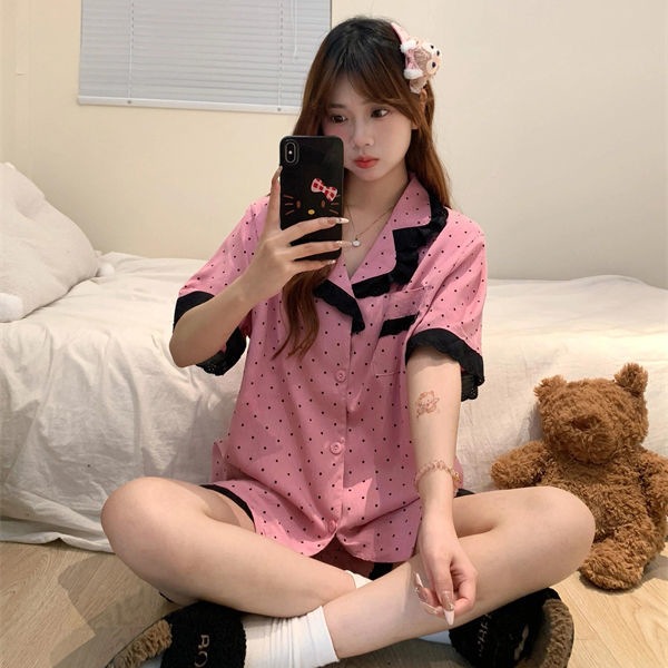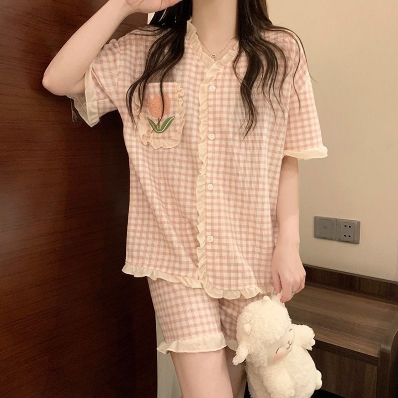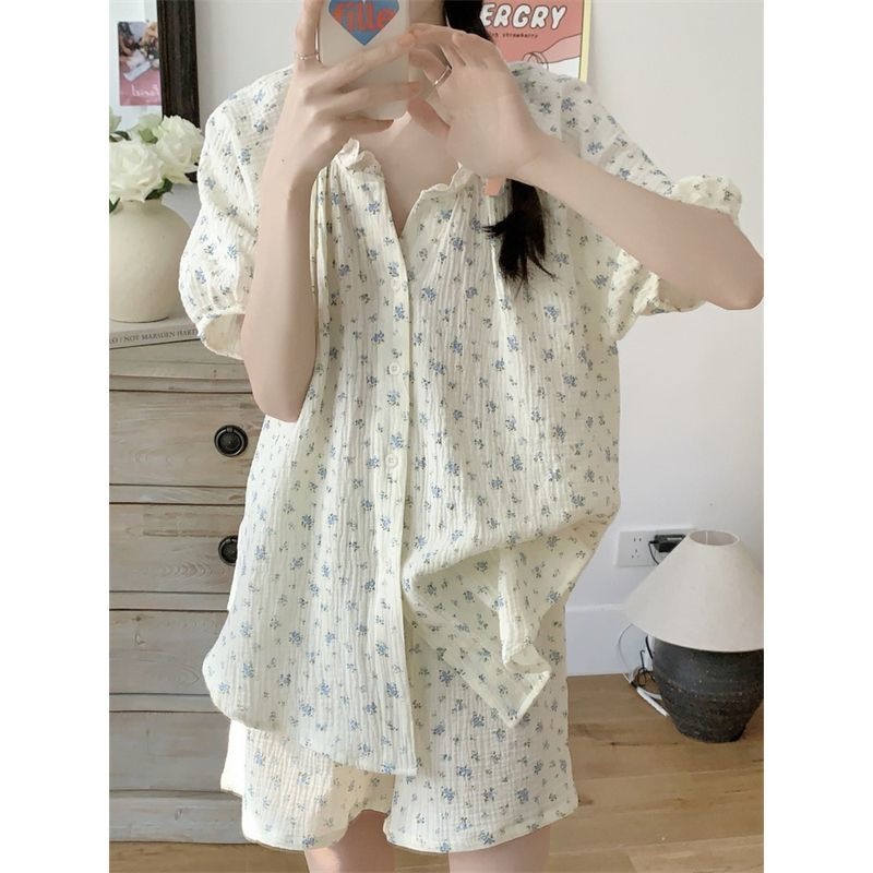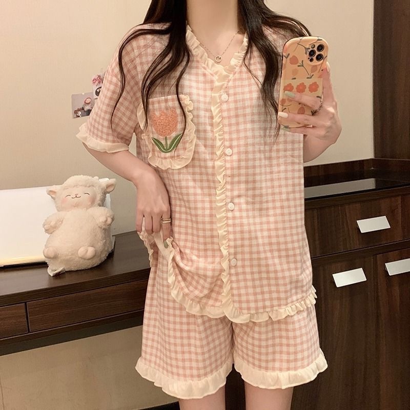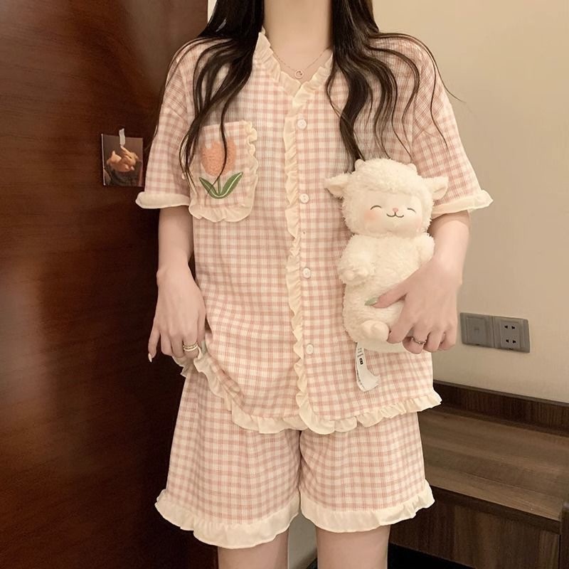 붉은 꽃 잠옷 여성 여름 신인스타일 일본식 반팔 반바지 학생 홈 의류 세트 외복