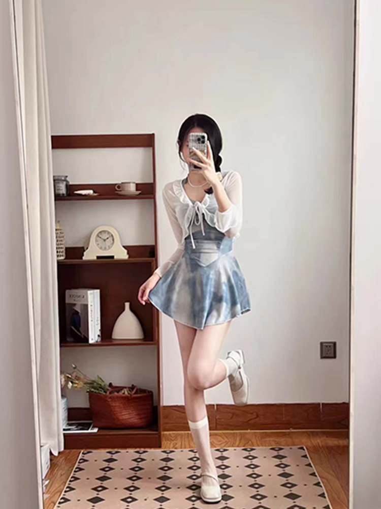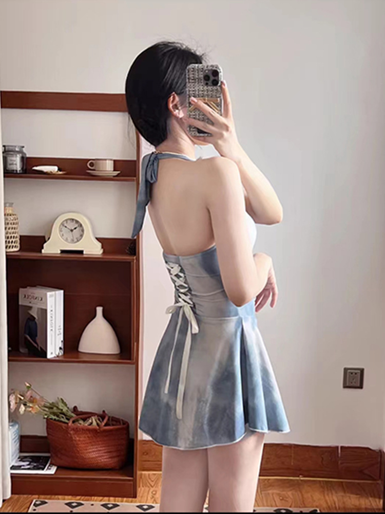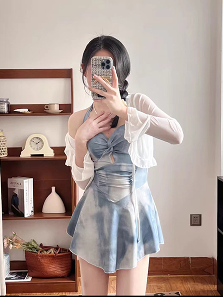 장미 같은 스타일의 수영복 넥타이-염료 블루 스파이스 소녀 스타일 목 스커트 스타일 벨리 커버 슬리밍 수영복 여성 이야기스토어 가기