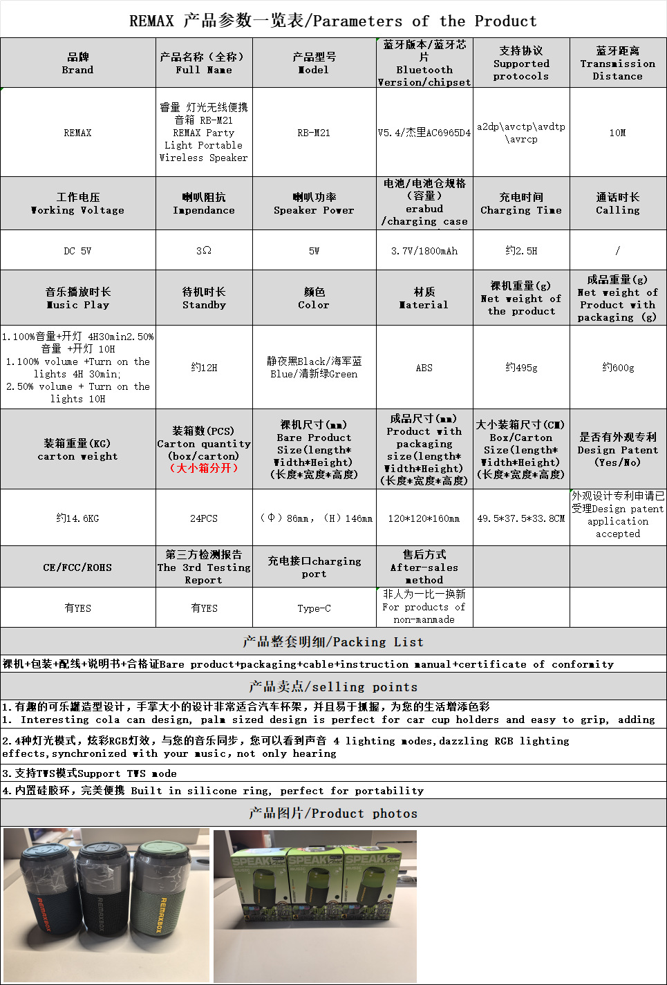 REMAX 화려한 RGB 조명 무선 휴대용 블루투스 스피커 휴대용 야외 분위기 오디오 RB-M21