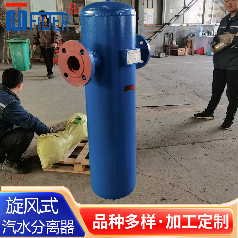 旋风式(也称离心式):大量含水的蒸汽或压缩空气进入汽水分离器,并在其中以旋流向下倾斜式运动;旋流的气体中夹带的水份由于速度降低,在已有的离心力作用下,被分离出来水汽在汽水分离器内壁上聚集;在分离的液体汇集到一定程度后流入集水槽中,经自动疏水阀排出,干燥清洁的蒸汽从分离器出口排出。