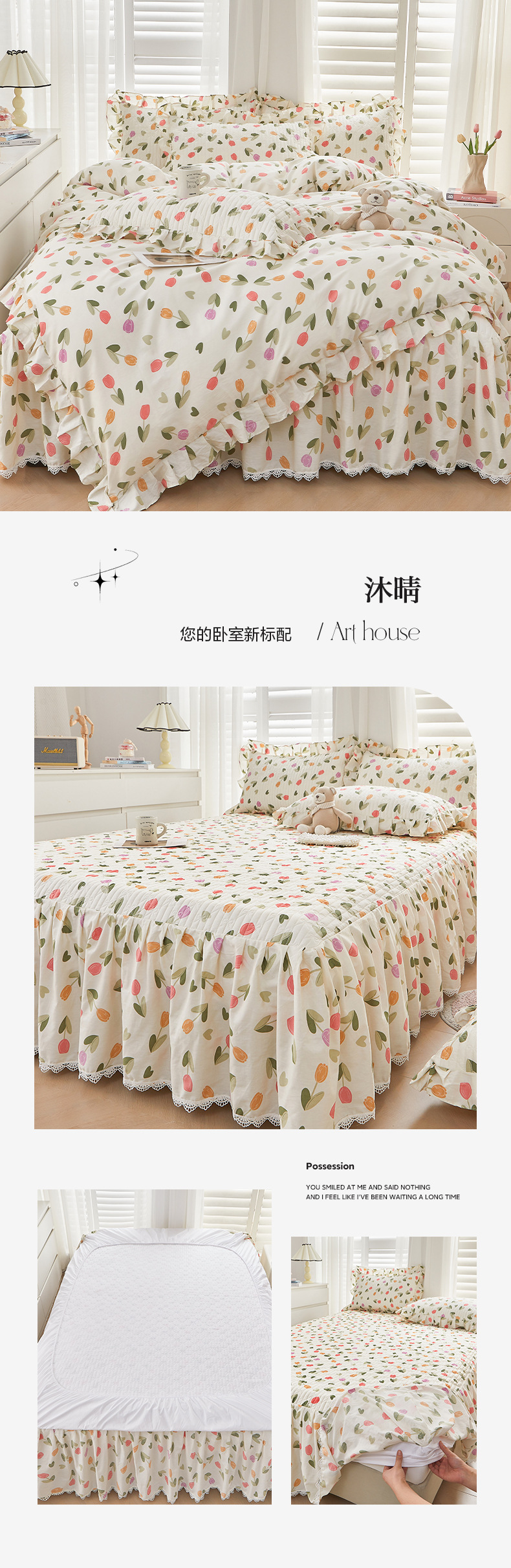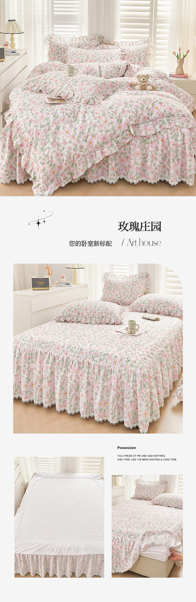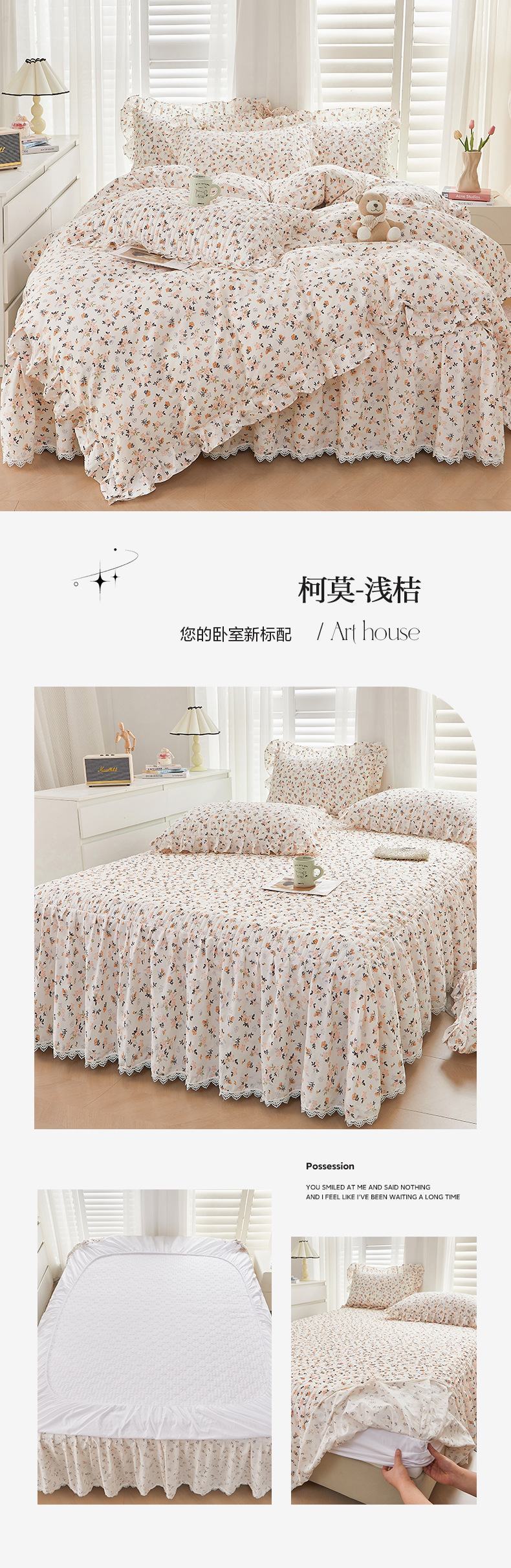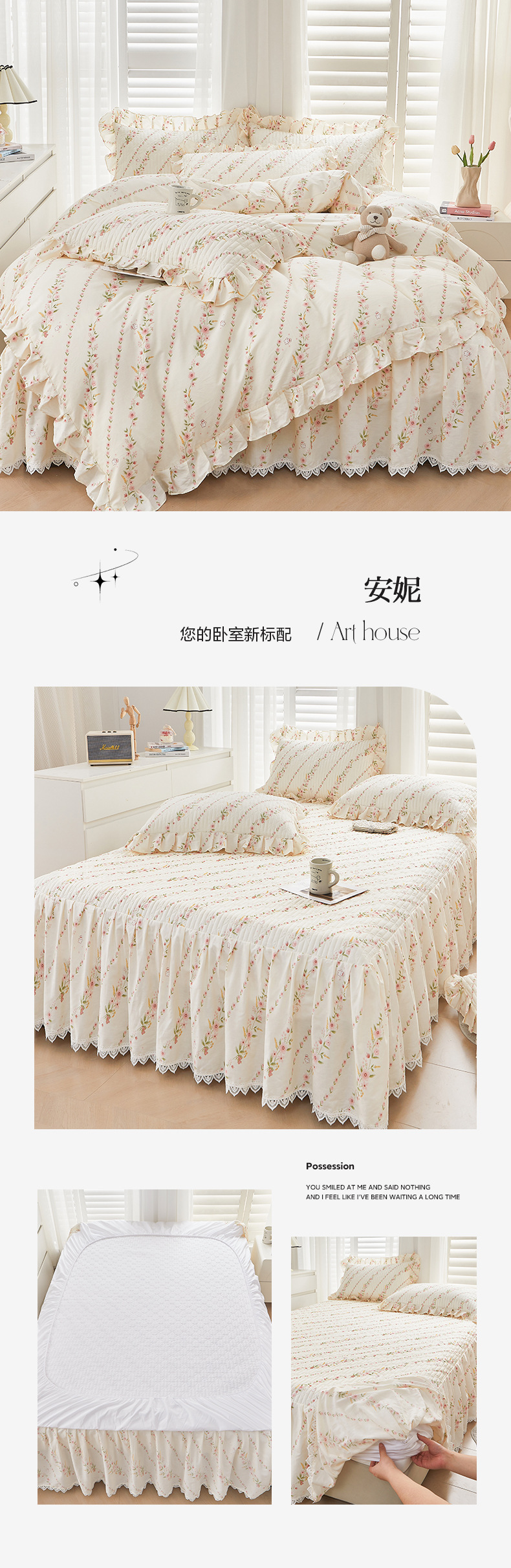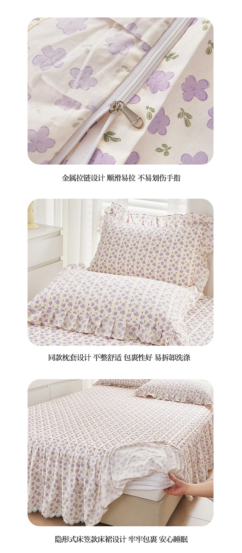 새로운 코튼 레이스 침대 스타일 패딩 코튼 베드 스커트 4 피스 세트 작은 신선한 코튼 편안한 알몸 슬리핑 머신 세탁기