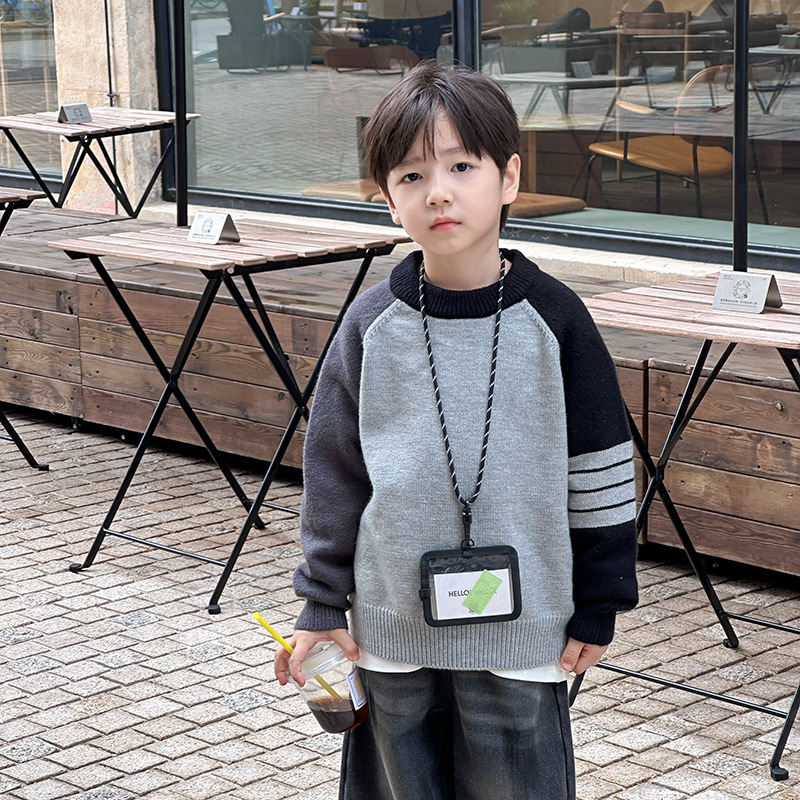 Elmo Beibei 어린이 2024 겨울 두꺼운 양털 스웨터 소년과 소녀를위한 잘 생긴 라글란 슬리브 스플 라이스 스웨터스토어 가기