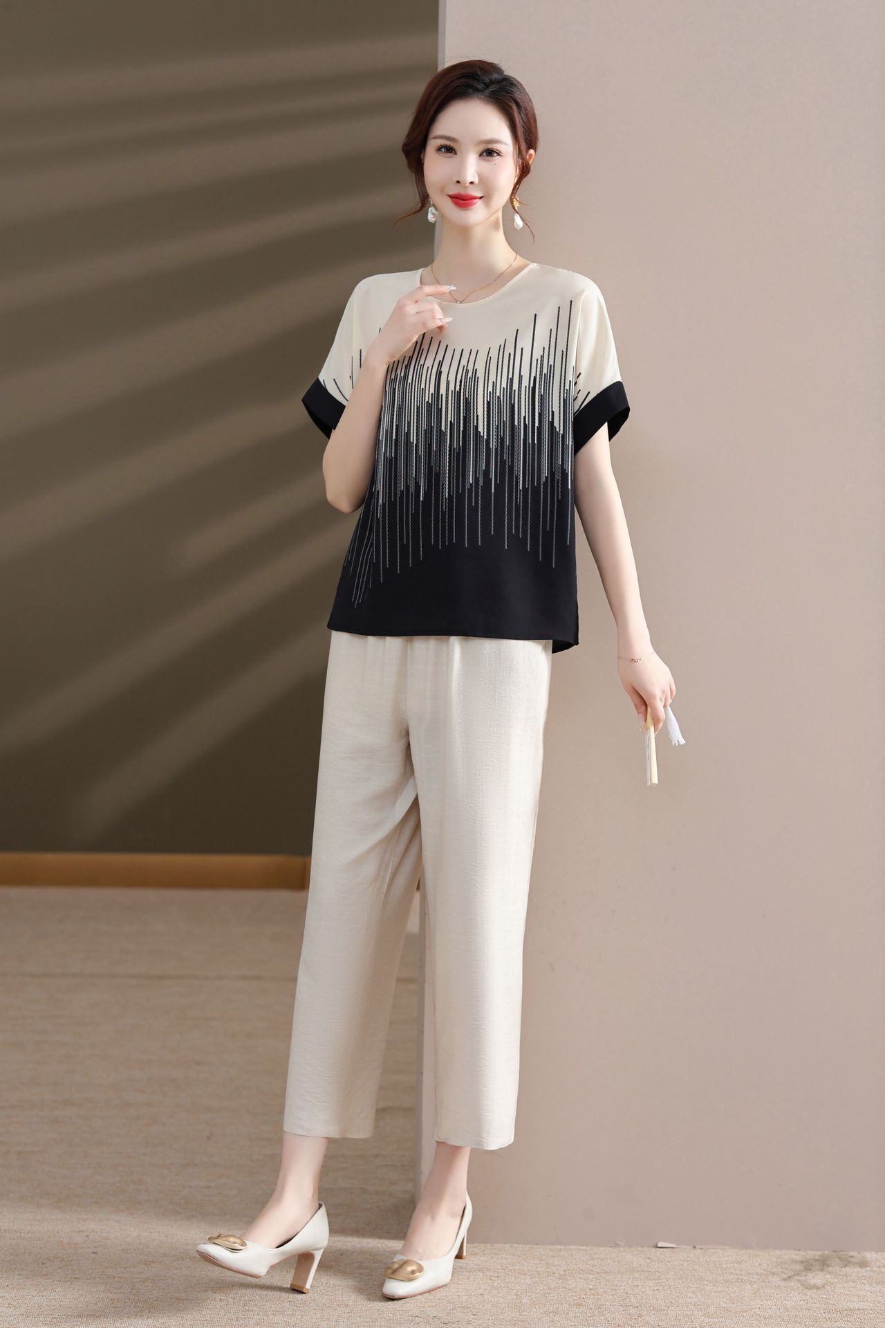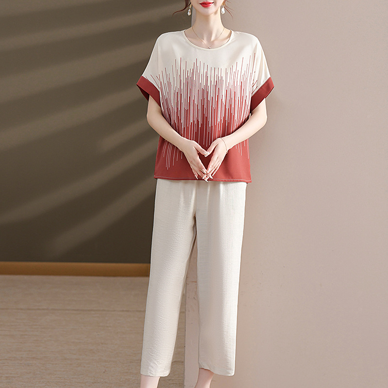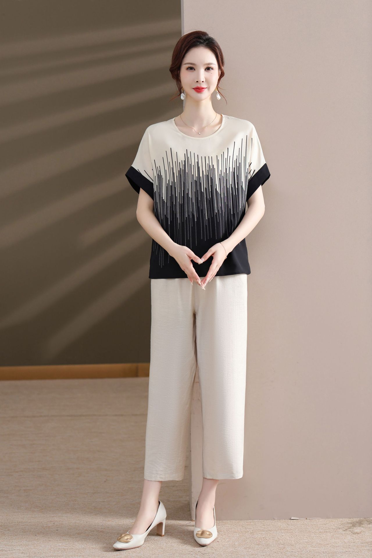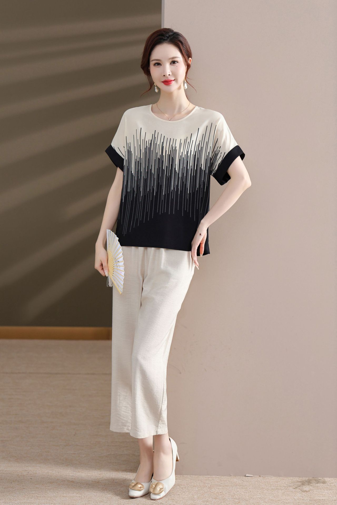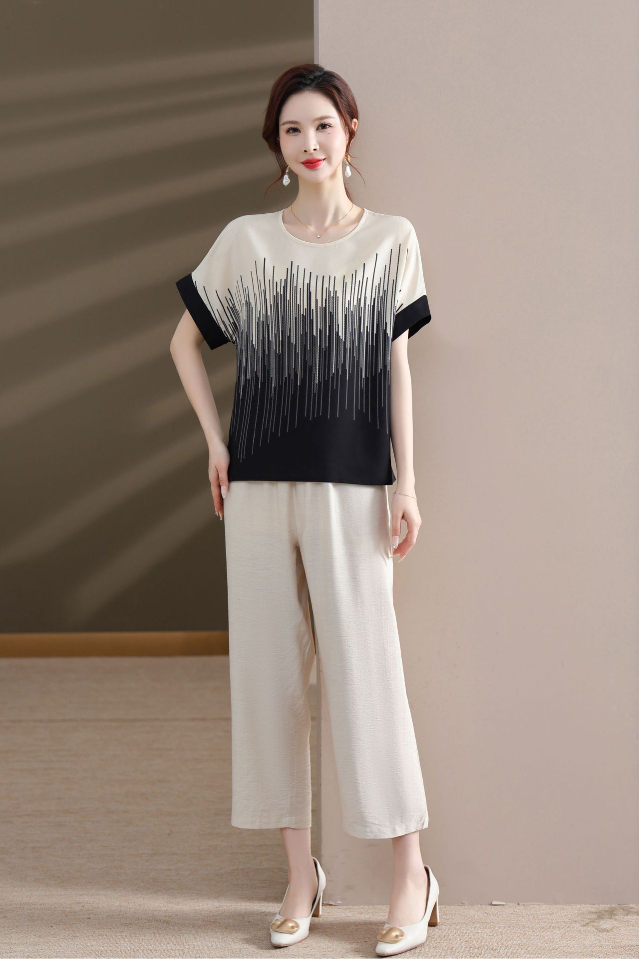 중년 어머니 여름 세트 2025 새로운 외국 스타일 중년 여성 반팔 티셔츠 느슨한 탑 투피스 세트
