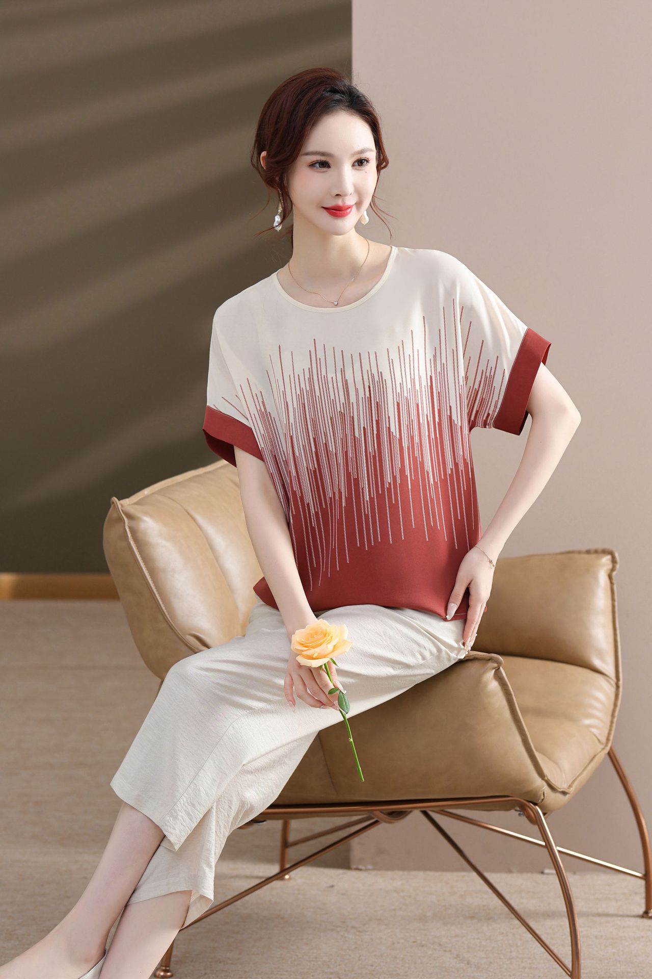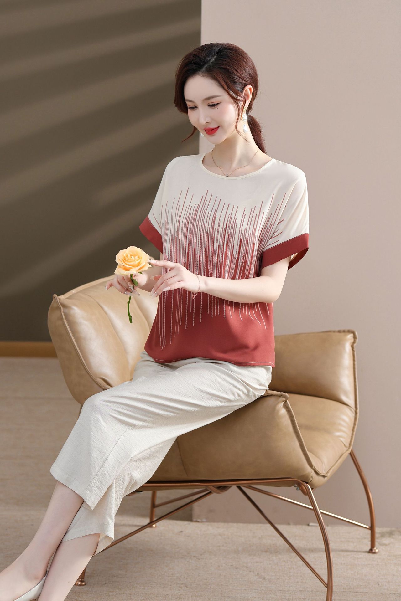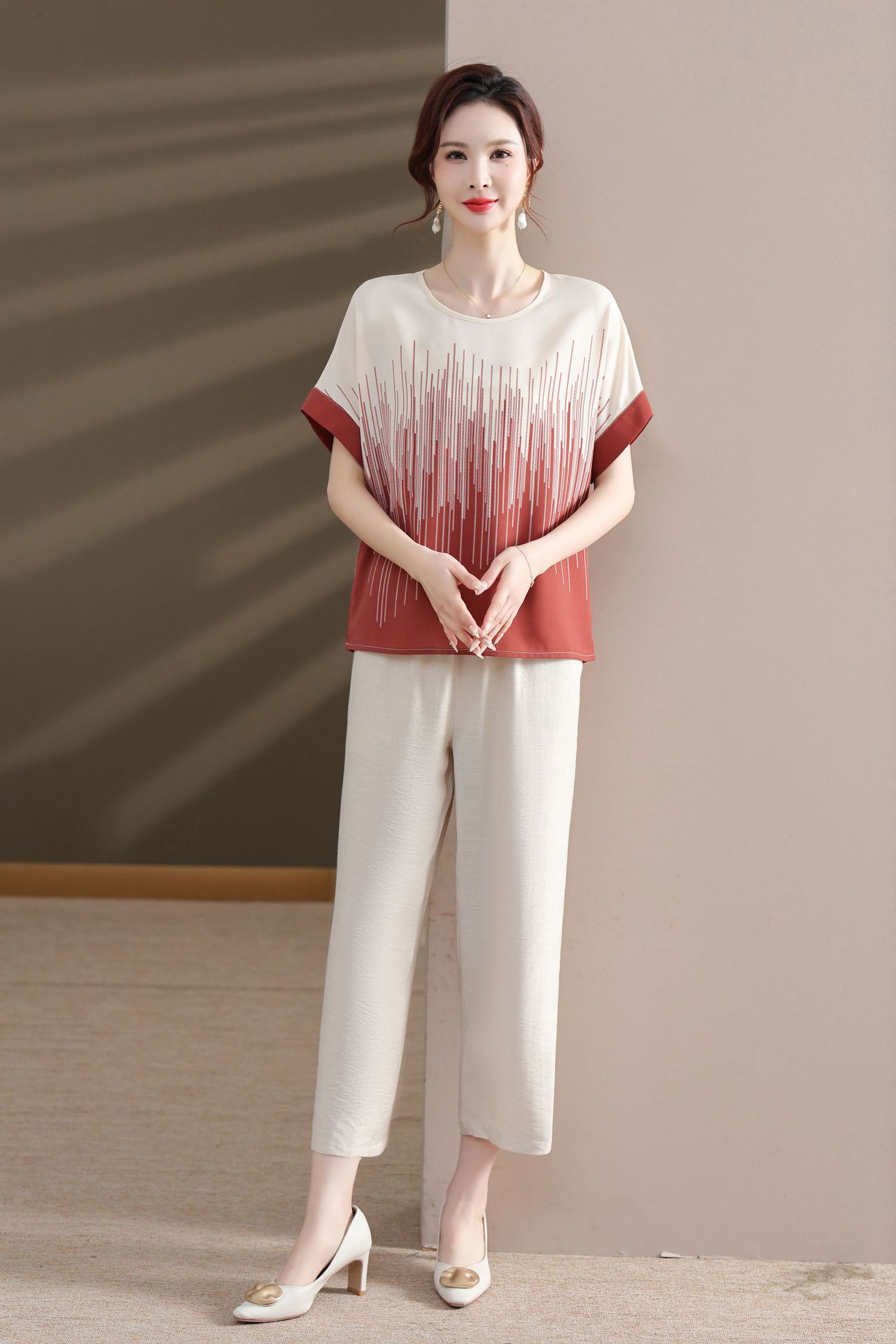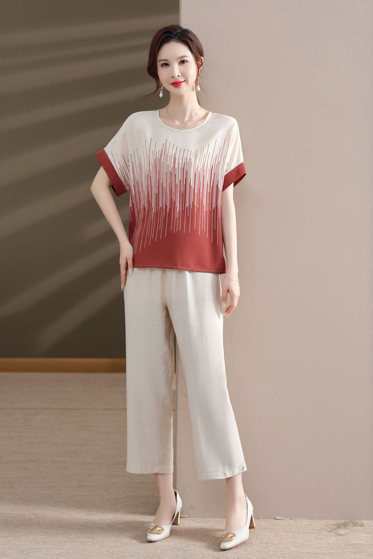 중년 어머니 여름 세트 2025 새로운 외국 스타일 중년 여성 반팔 티셔츠 느슨한 탑 투피스 세트