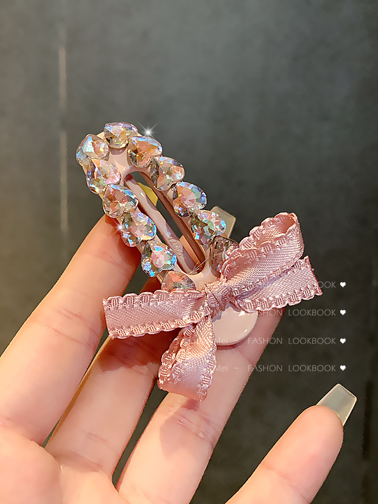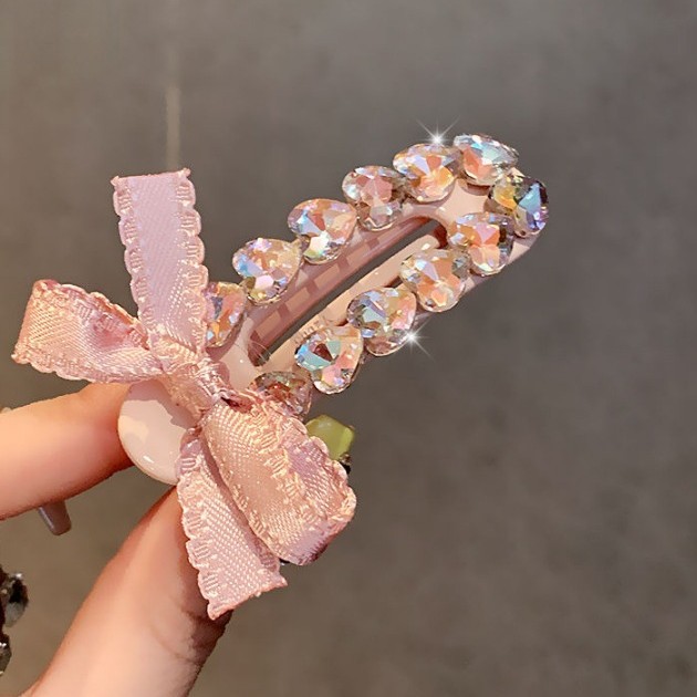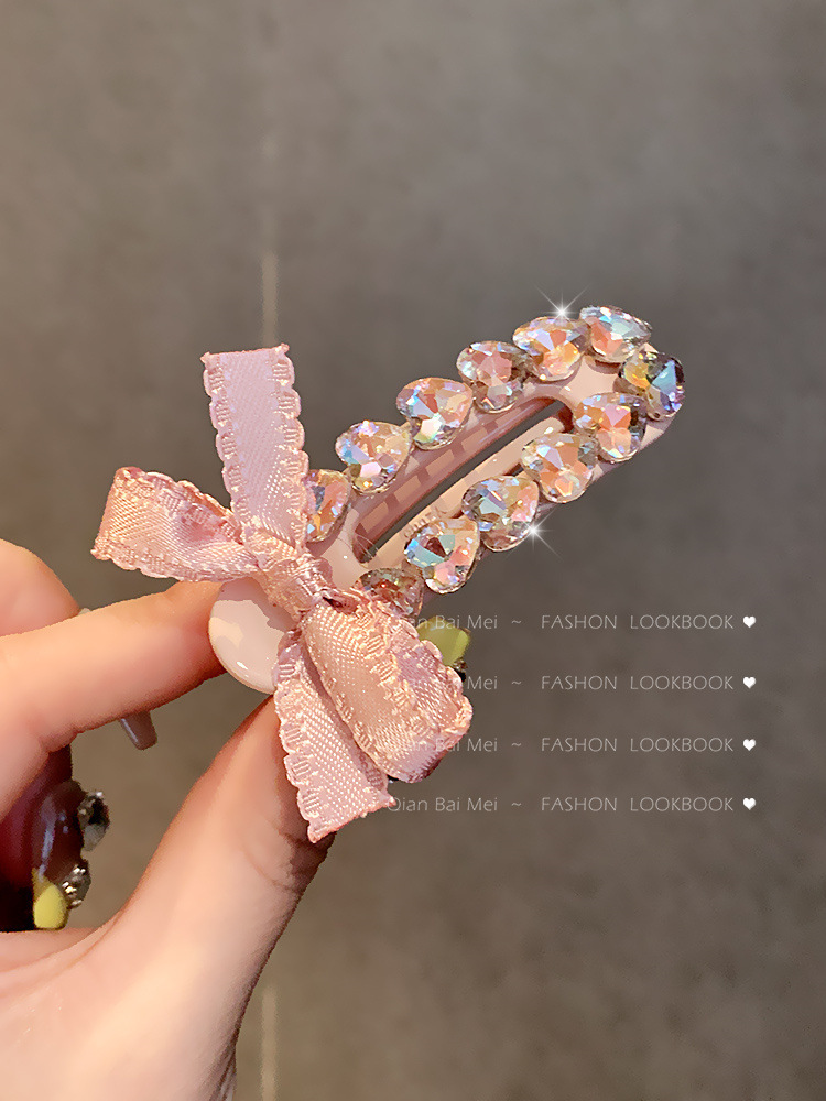 한국 스타일 반짝이는 다이아몬드 머리핀, 덕빌 클립, 핑크 리본 머리핀, 달콤한 하이 J 센스 앞머리 클립 및 사이드 클립