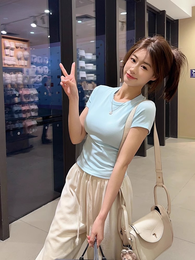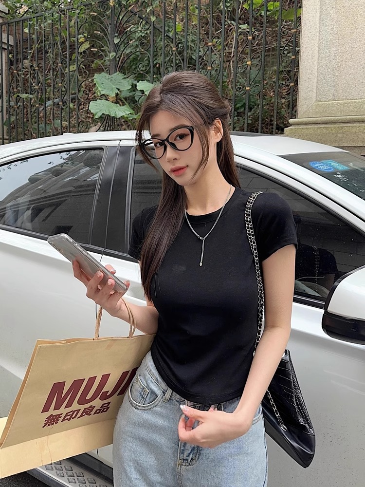 여름 여성을 위한 크로스보더 한국식 블랙 라운드 넥 오른쪽 어깨 반팔 티셔츠 새로운 스타일 작은 슬림핏 쇼트 탑스토어 가기
