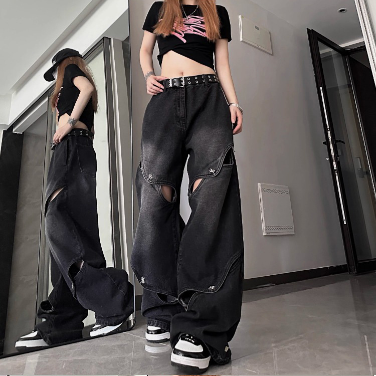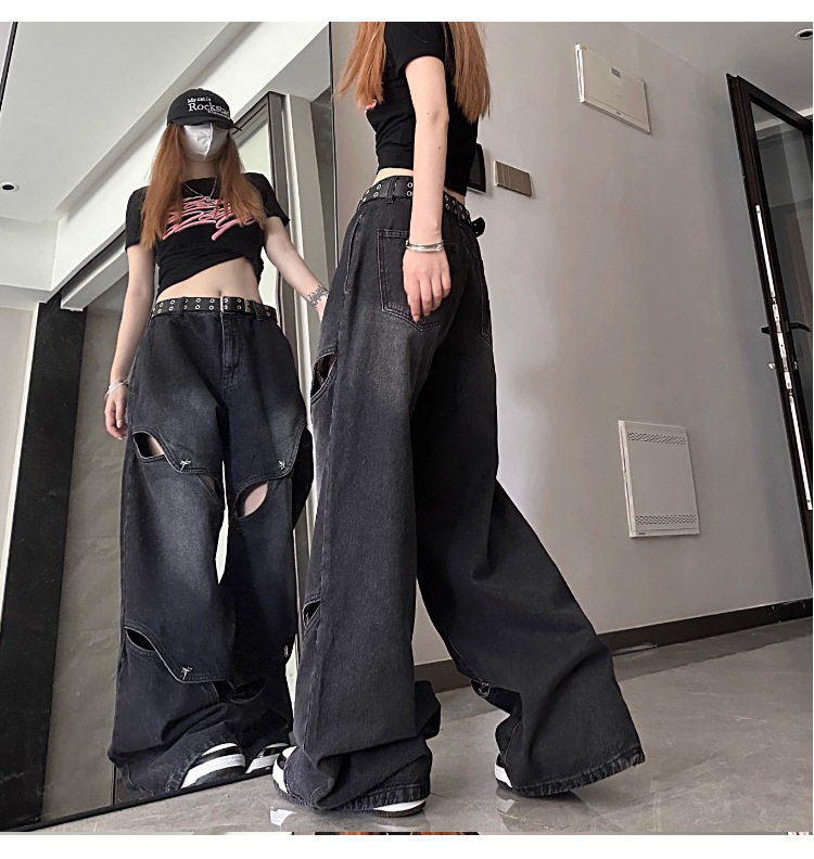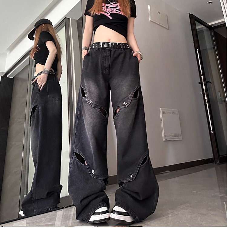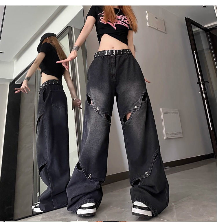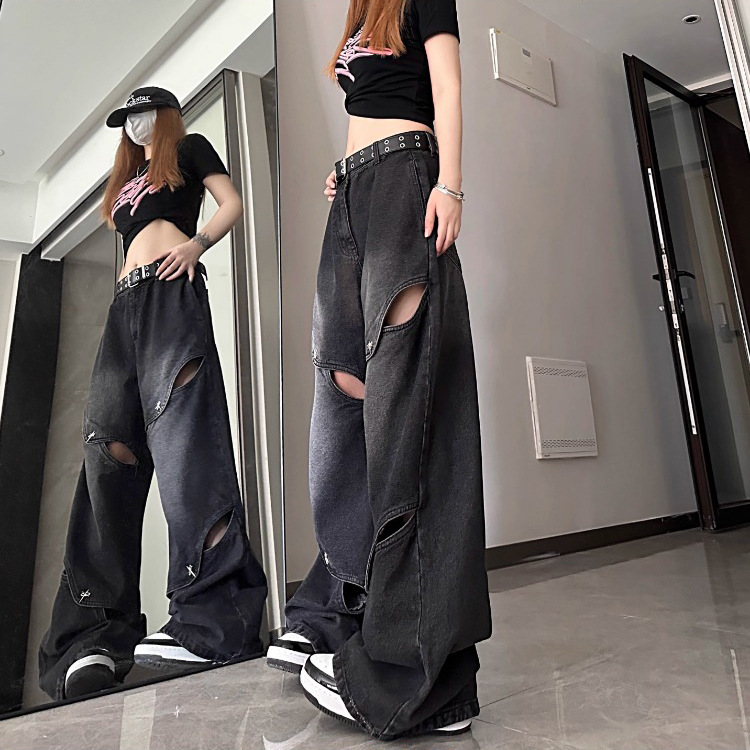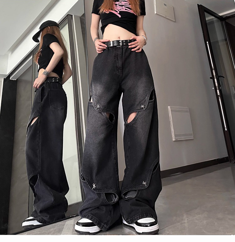 아메리칸 스트리트 와이드 레그 하이 허리 청바지 여자 2024 년 새로운 여름 올 매치 틈새 디자인 센스 할로우 스트레이트 바지스토어 가기