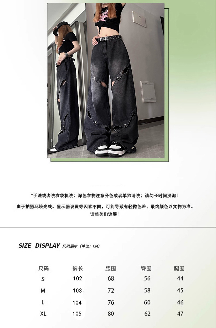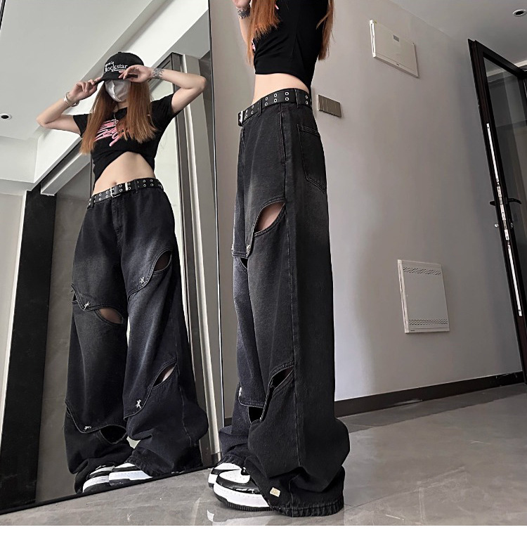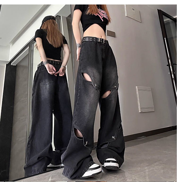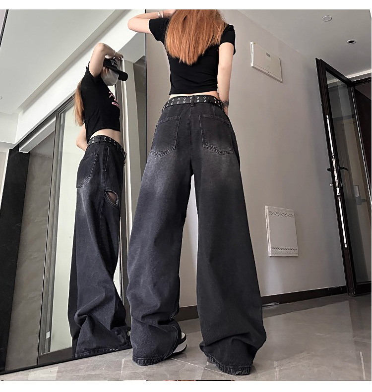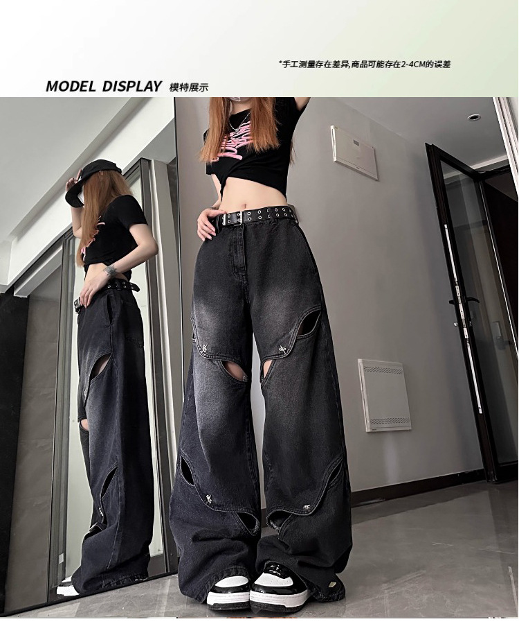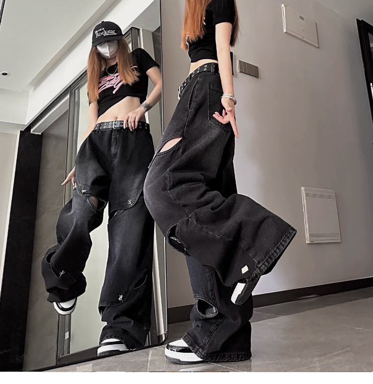 아메리칸 스트리트 와이드 레그 하이 허리 청바지 여자 2024 년 새로운 여름 올 매치 틈새 디자인 센스 할로우 스트레이트 바지스토어 가기