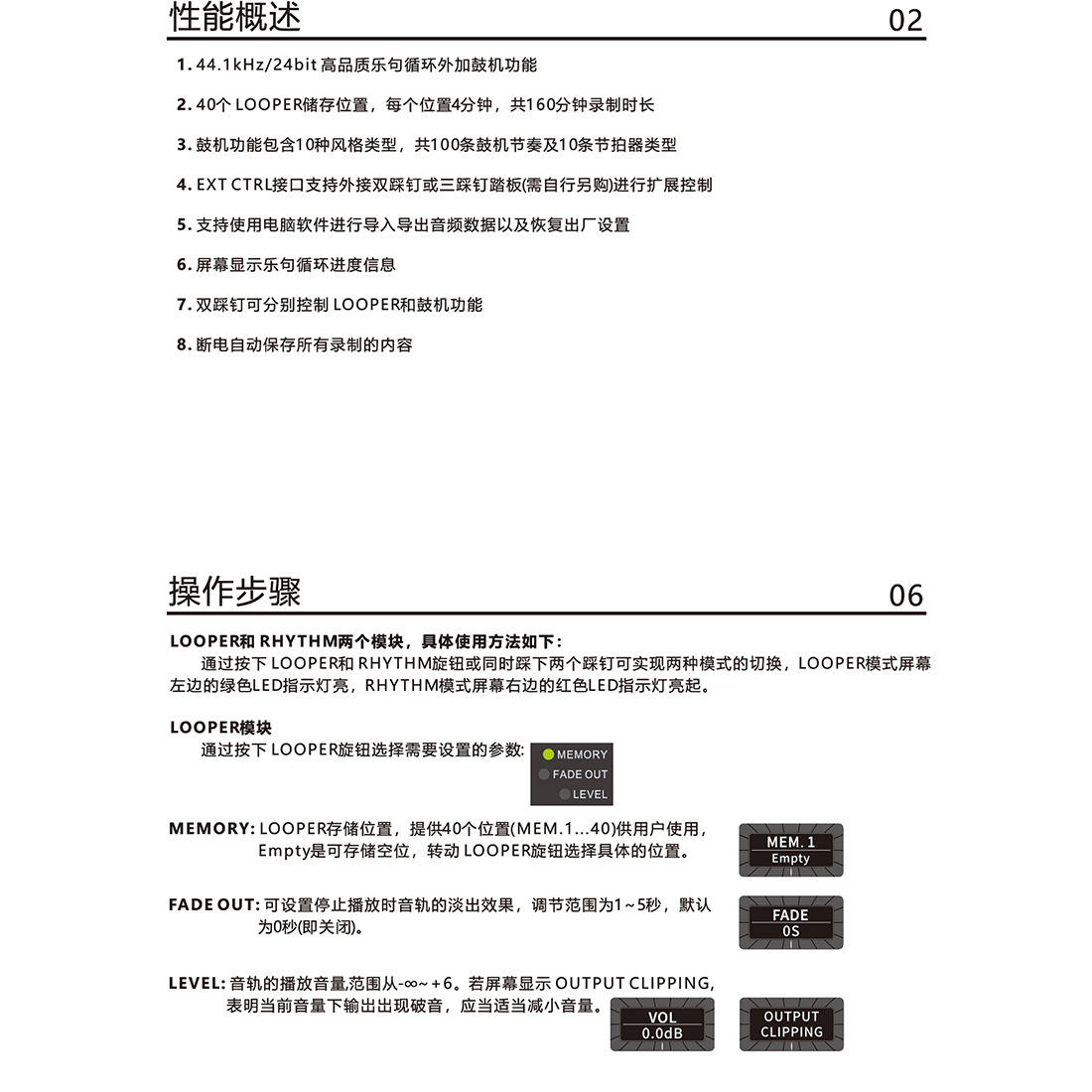 用途卖点:鼓机乐句循环单块效果器采用优质铝合金材质,高品质句循环外加鼓机功能,可160分钟录制时长,,共100条鼓机节奏及10条节拍器类型,支持使用电脑软件进行导入导出音频数据以及恢复出厂设置,丰富强大,尽情享受音乐带来的乐趣让您“嗨”便全场