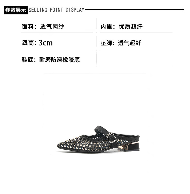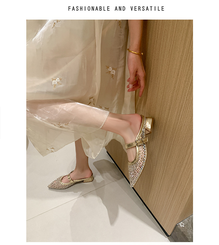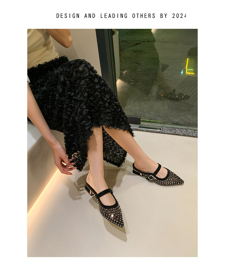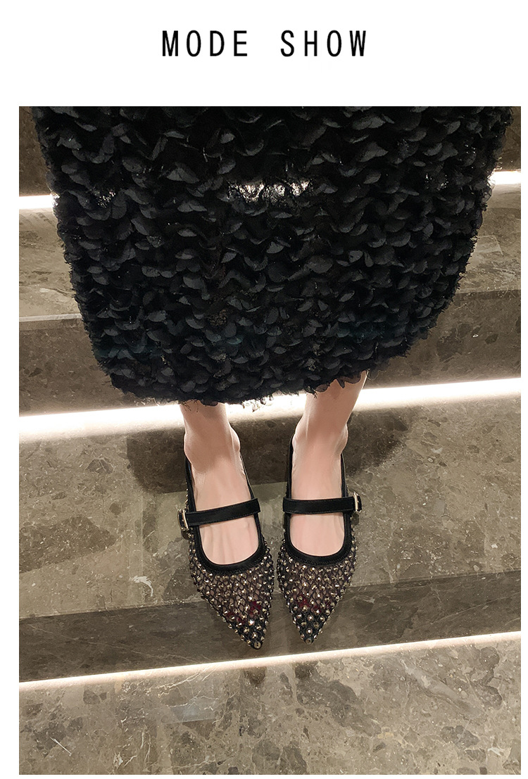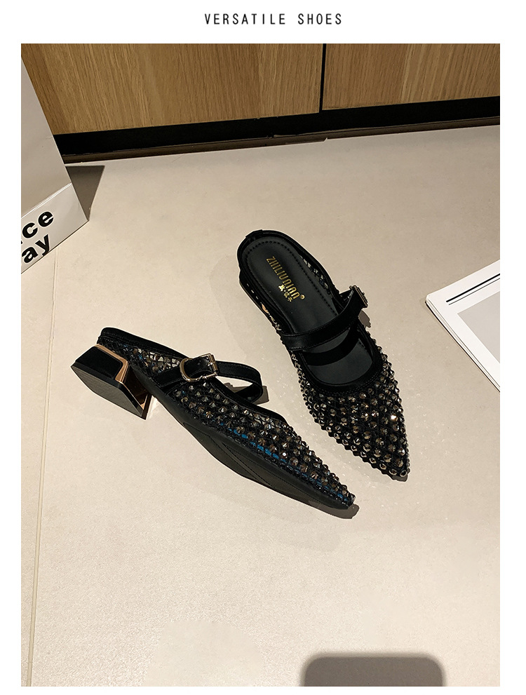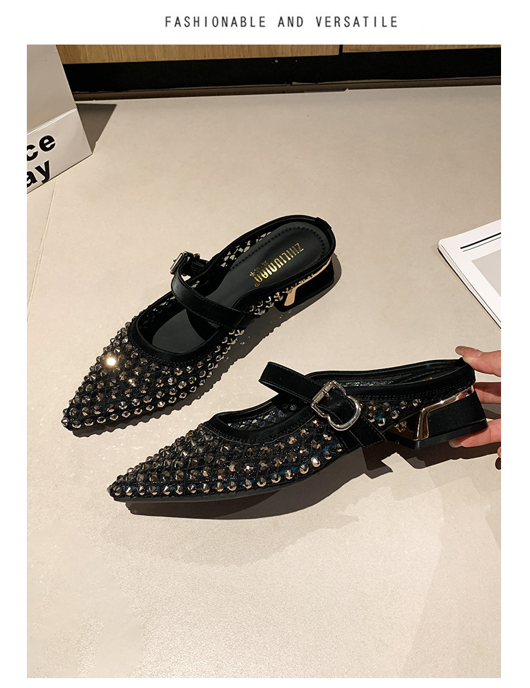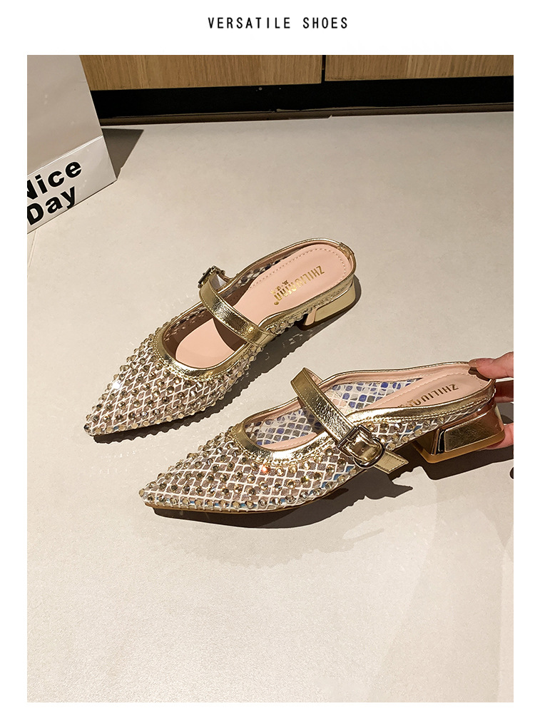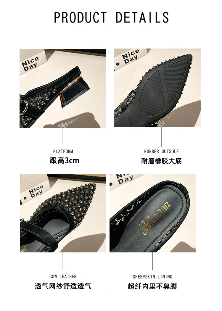 666-T1 메쉬 2025 여름 신작 뾰족한 싱글 슈즈 두꺼운 굽 중간 굽 라인스톤 여성화 패셔너블하고 다재다능한 대형 신발스토어 가기
