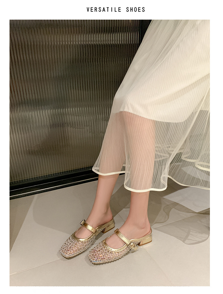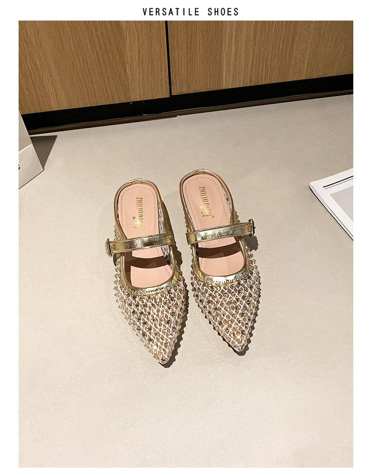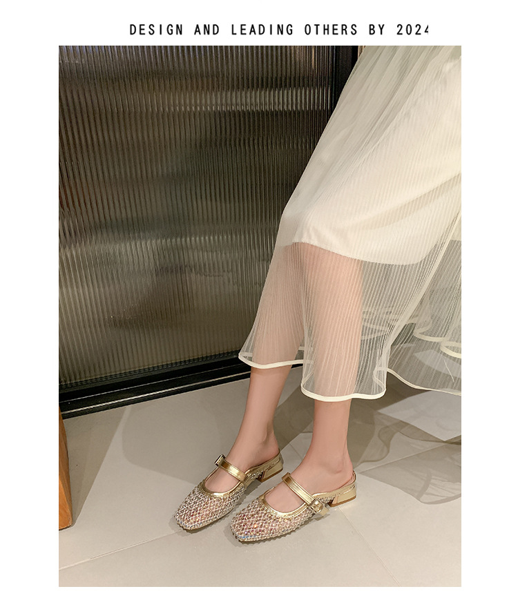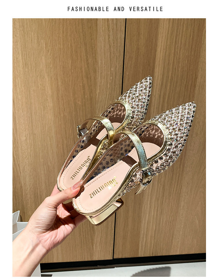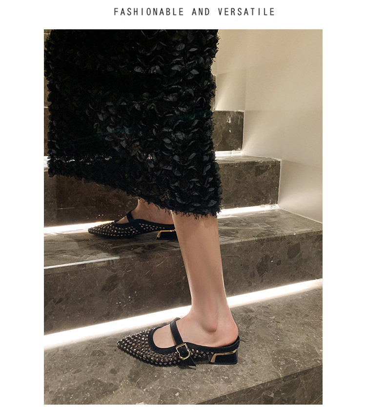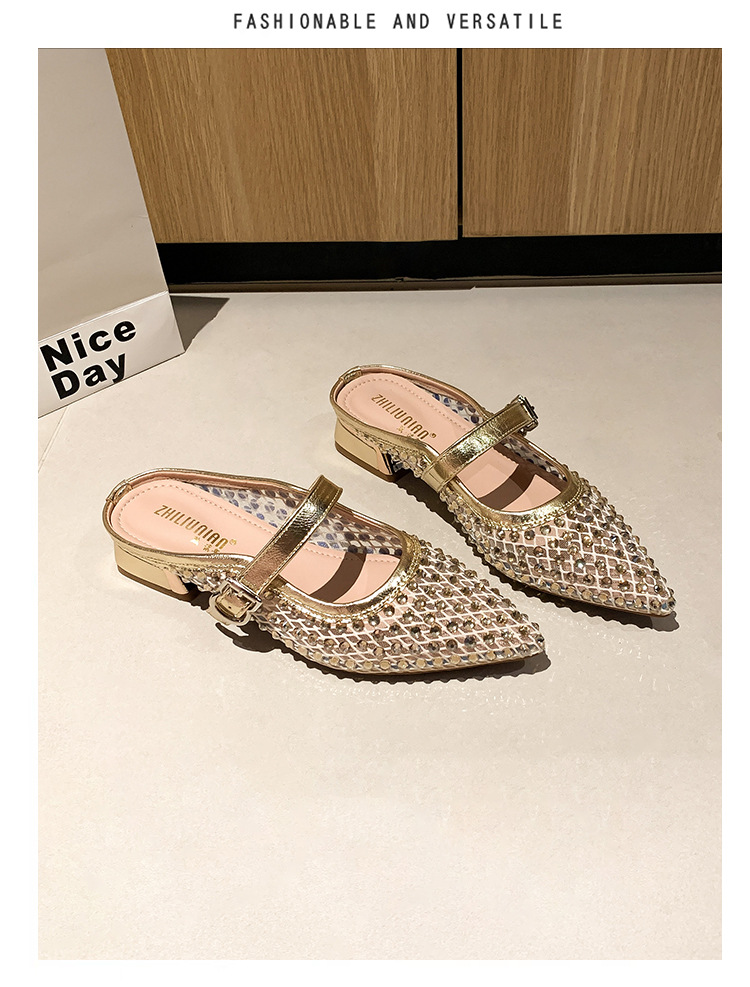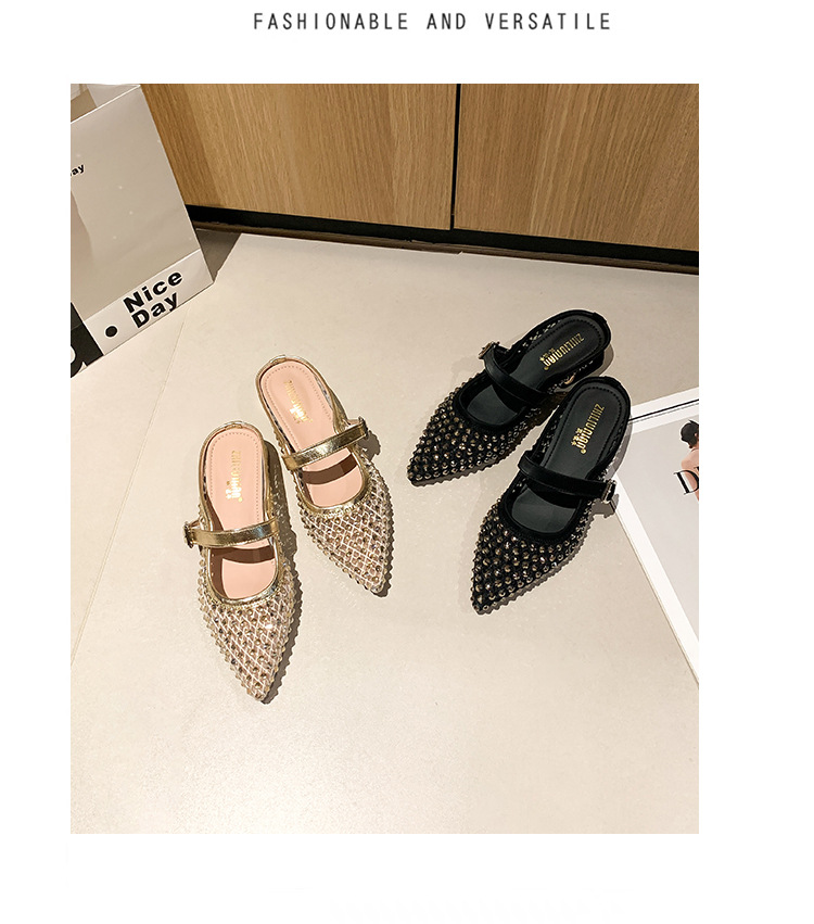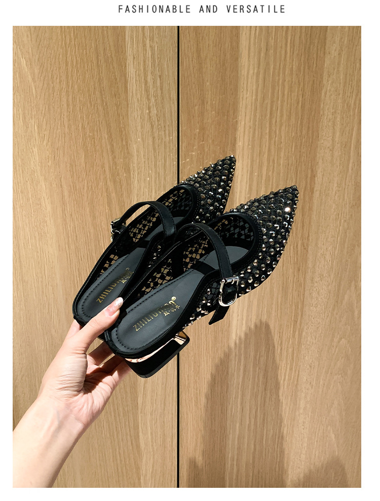 666-T1 메쉬 2025 여름 신작 뾰족한 싱글 슈즈 두꺼운 굽 중간 굽 라인스톤 여성화 패셔너블하고 다재다능한 대형 신발스토어 가기