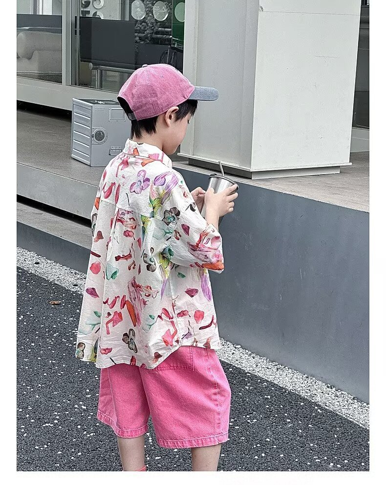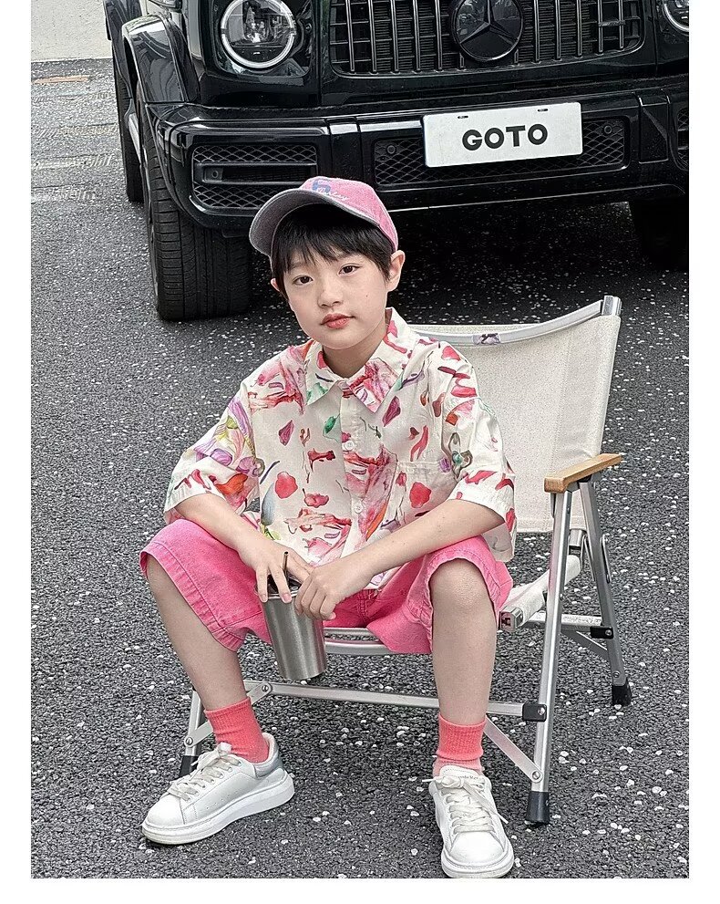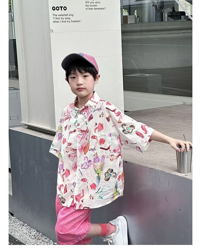 소년 티셔츠 반팔 꽃 셔츠 홍콩 스타일 여름 2024 새로운 어린이 인터넷 연예인 프라이드 스트리트 반소매 풀 프린트 탑 트렌디스토어 가기