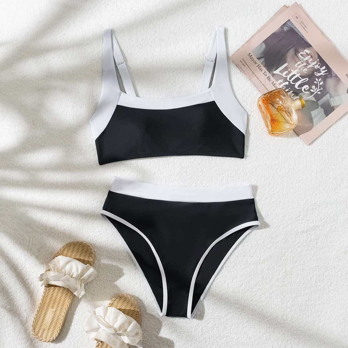 유럽과 미국의 국경 여성 패션 섹시한 흑백 섹시한 높은 탄성 와이드 어깨 스트랩 스플릿 비키니 투피스 수영복