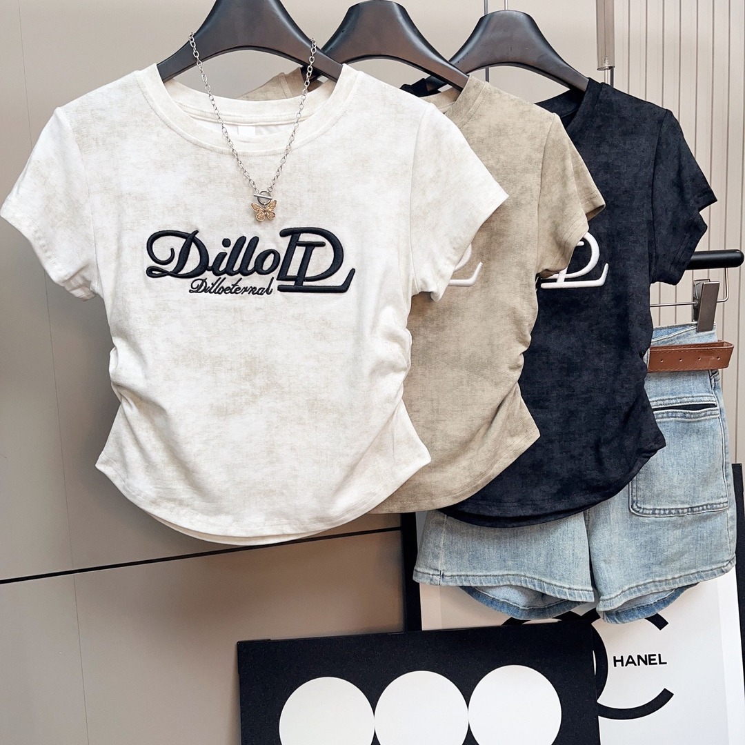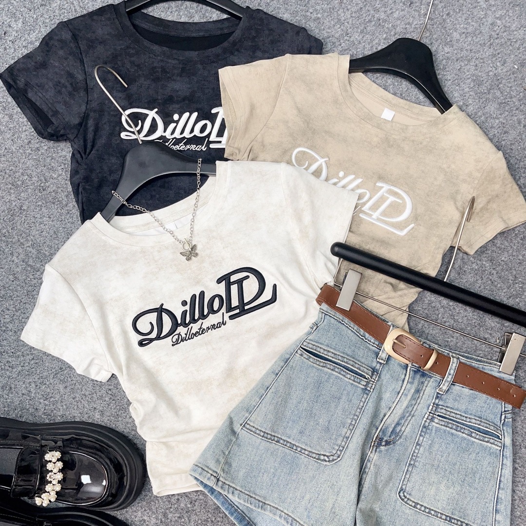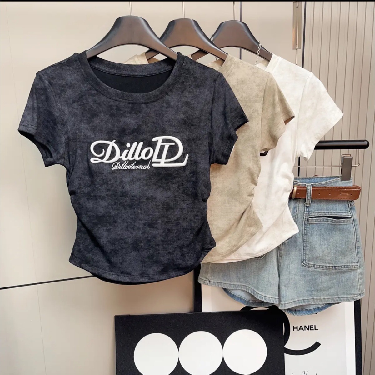미국 편지 인쇄 반팔 티셔츠 여성의 2024 여름 넥타이-염료 디자인 웨이스트 독특한 쇼트 탑스토어 가기