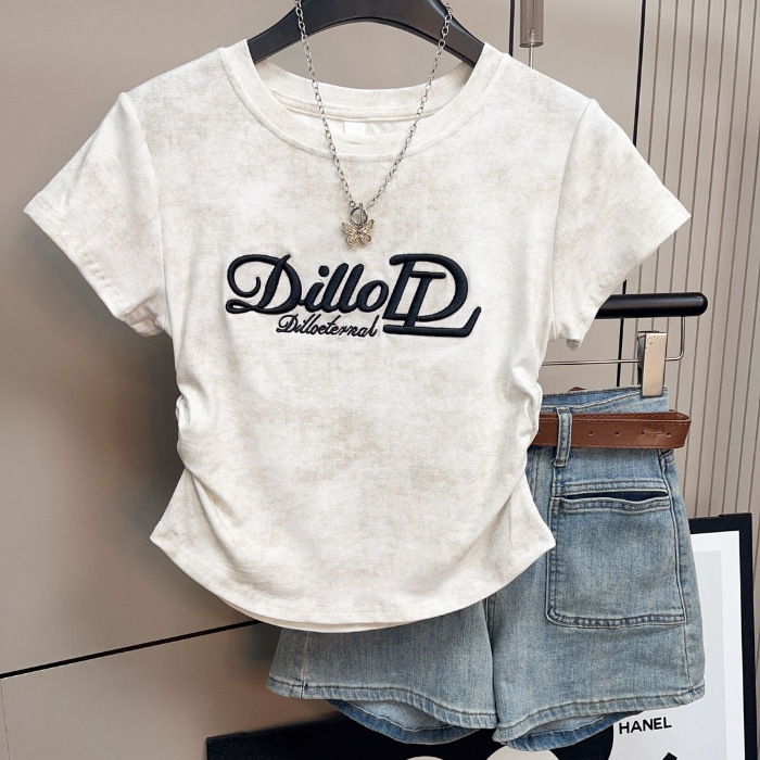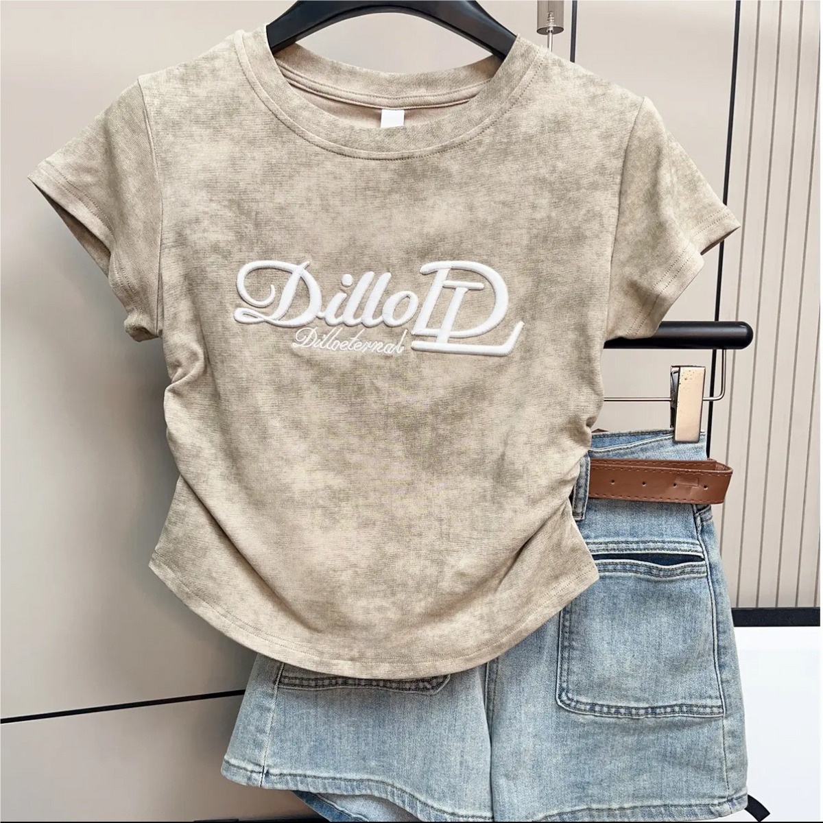 미국 편지 인쇄 반팔 티셔츠 여성의 2024 여름 넥타이-염료 디자인 웨이스트 독특한 쇼트 탑