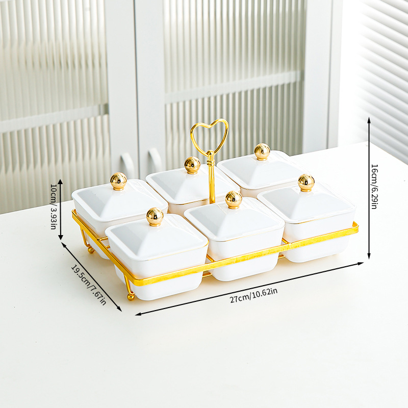 • 황금 복숭아 하트 사각 프레임 6개의 도자기 흰색 접시와 금구슬