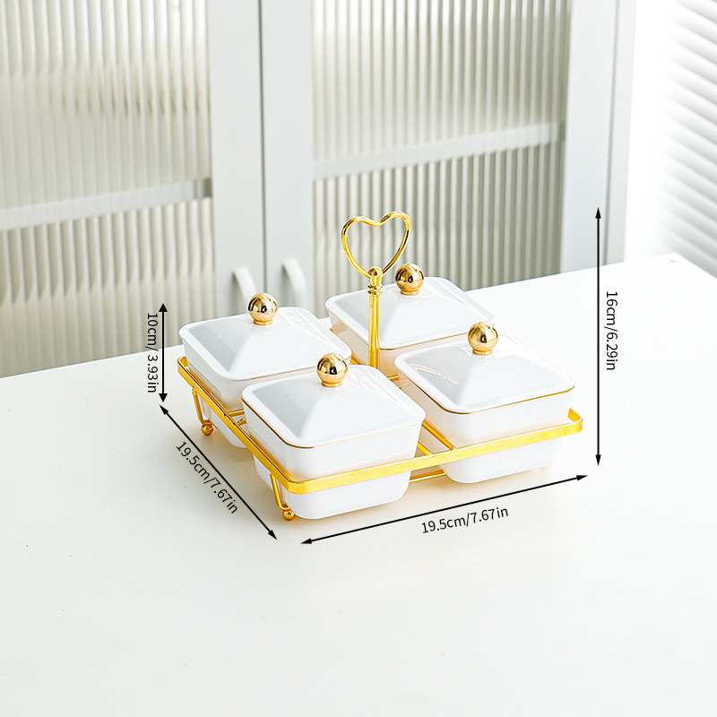 • 황금 복숭아 하트 사각 프레임 4개의 도자기 흰색 접시와 금구슬