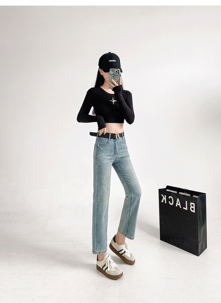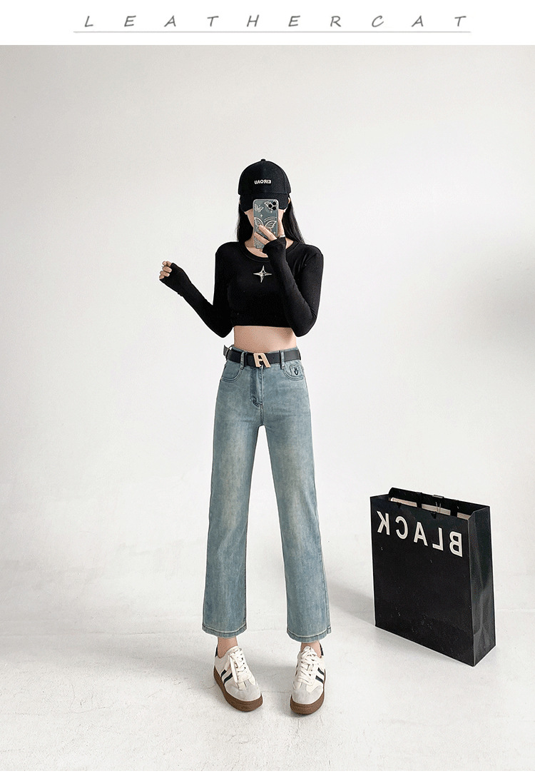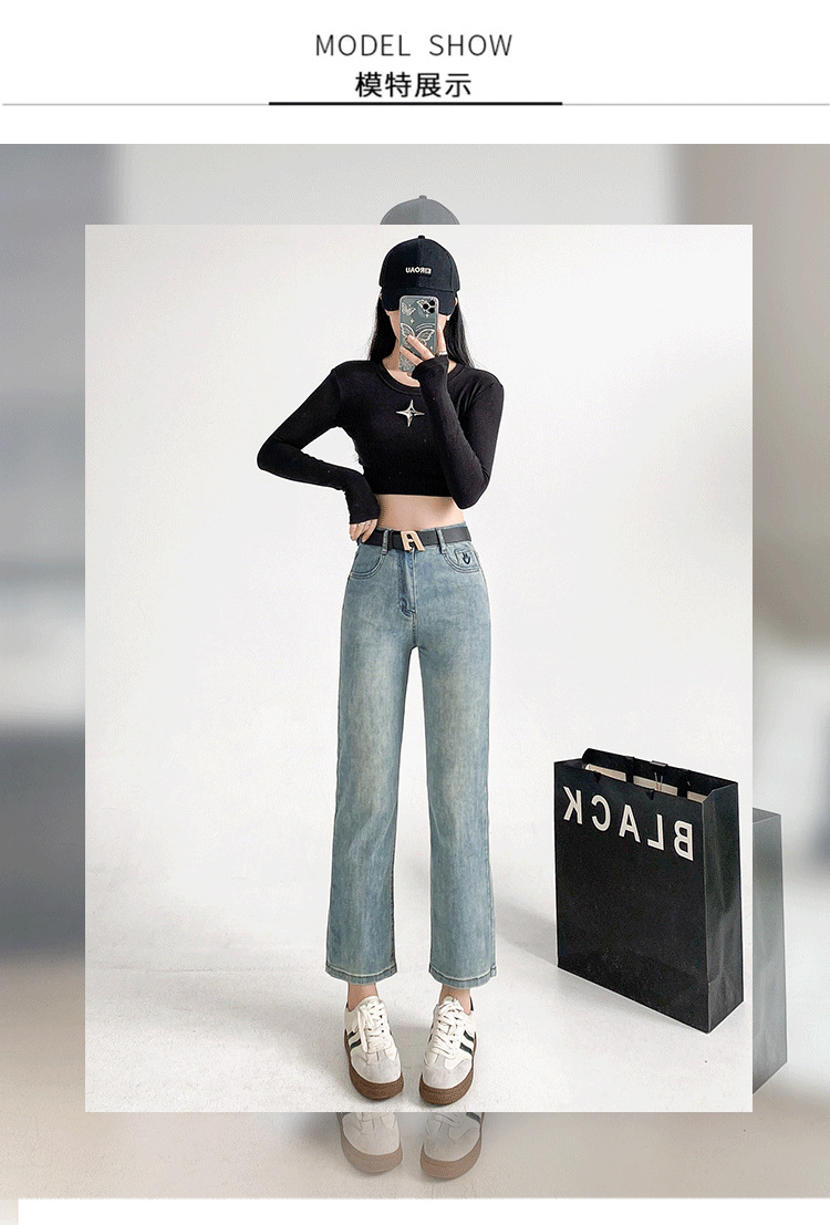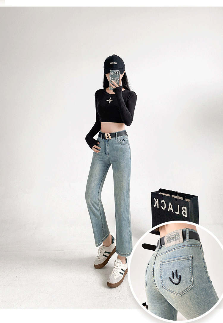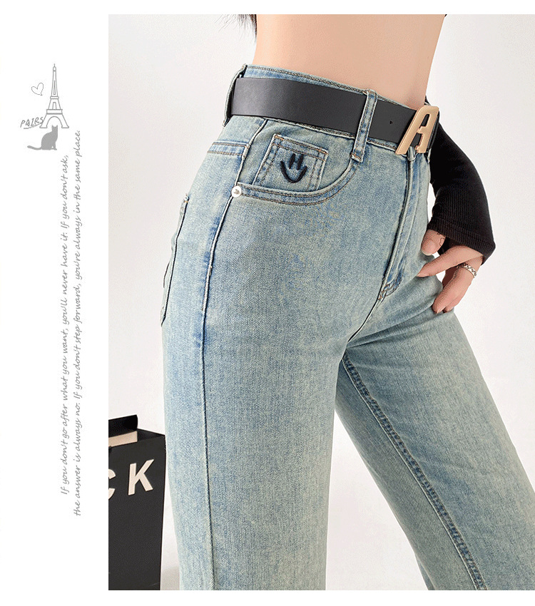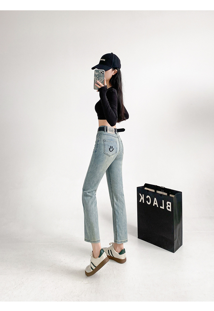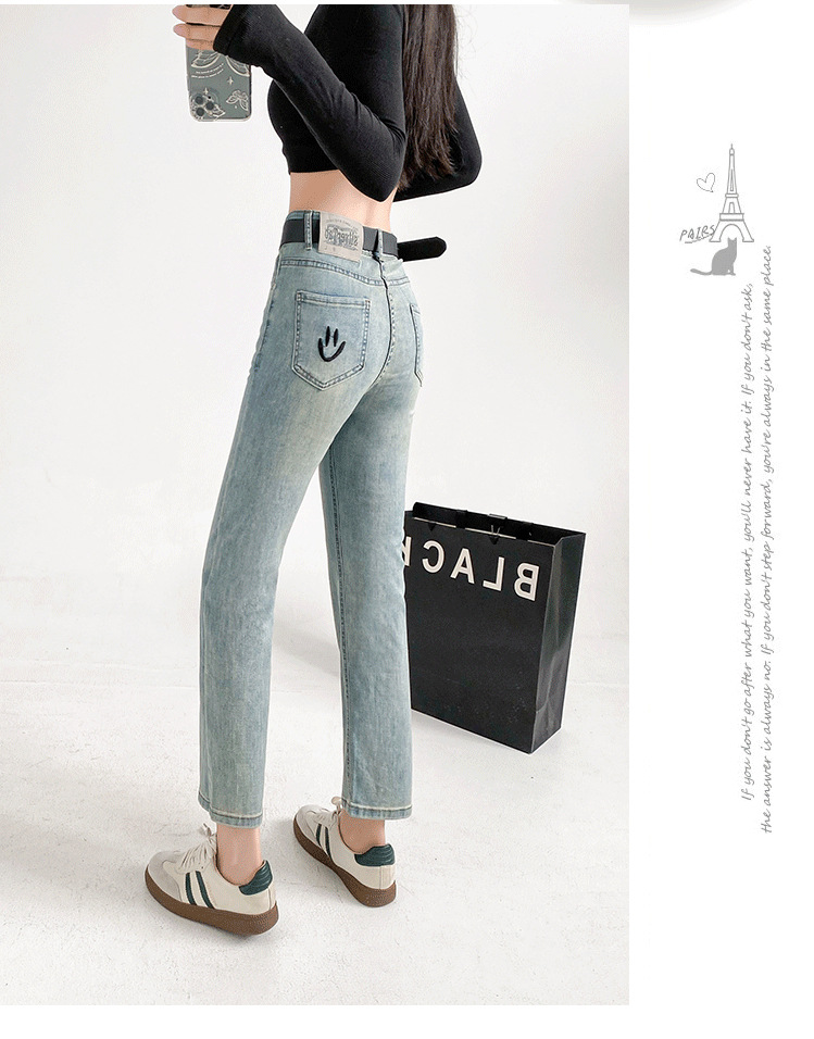 패션 자수 스마일리 작은 직선 청바지 여성의 가을 2024 새로운 높은 허리 슬리밍 자른 파이프 바지스토어 가기