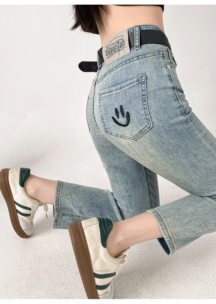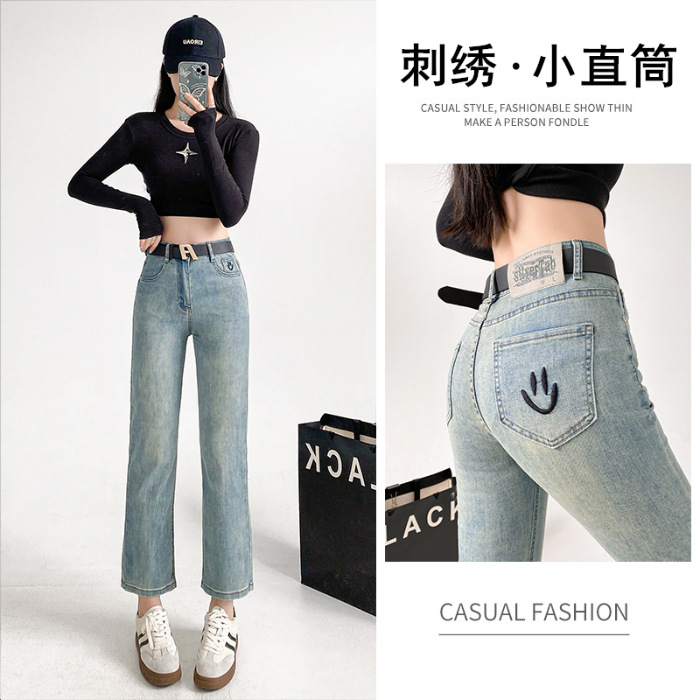 패션 자수 스마일리 작은 직선 청바지 여성의 가을 2024 새로운 높은 허리 슬리밍 자른 파이프 바지