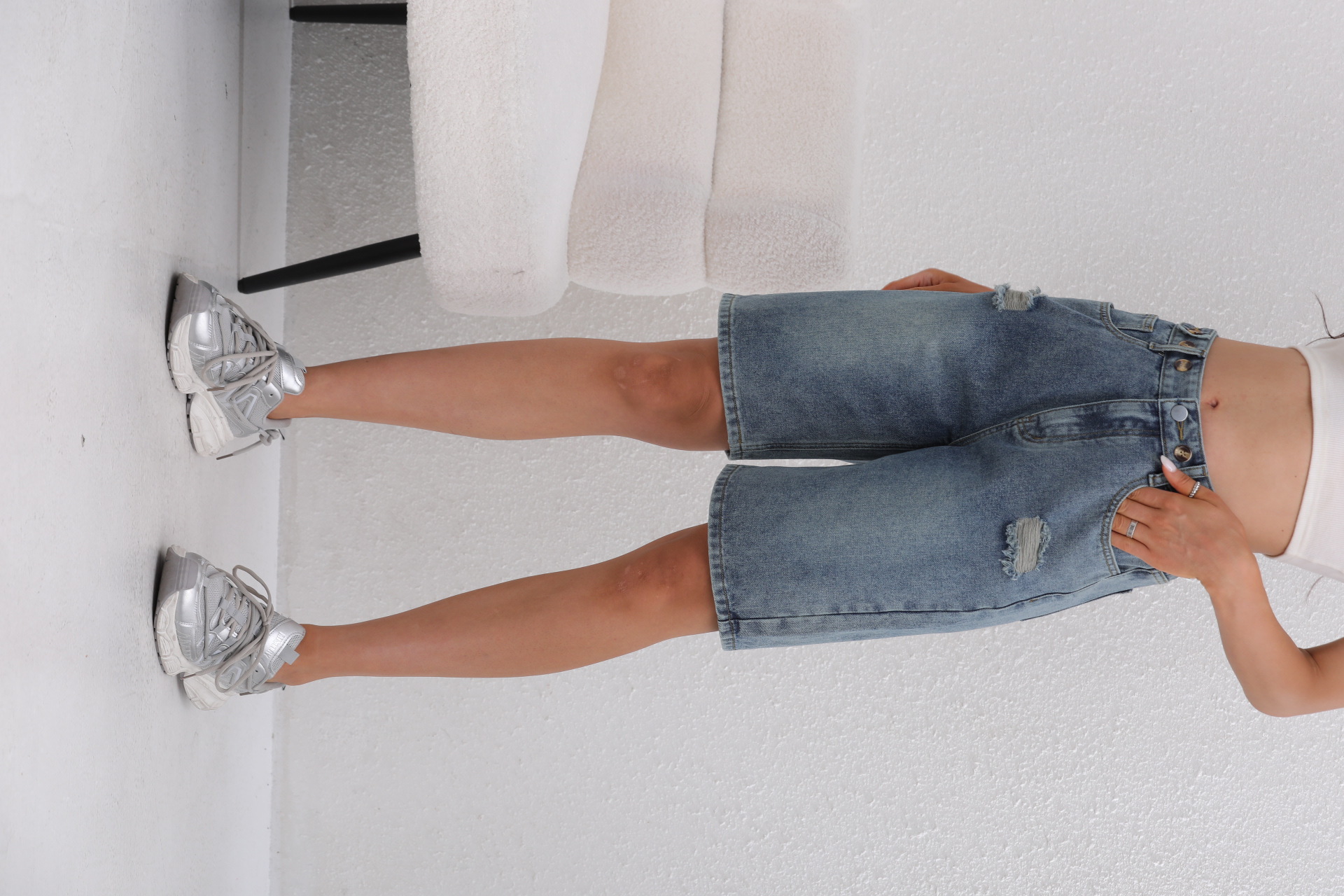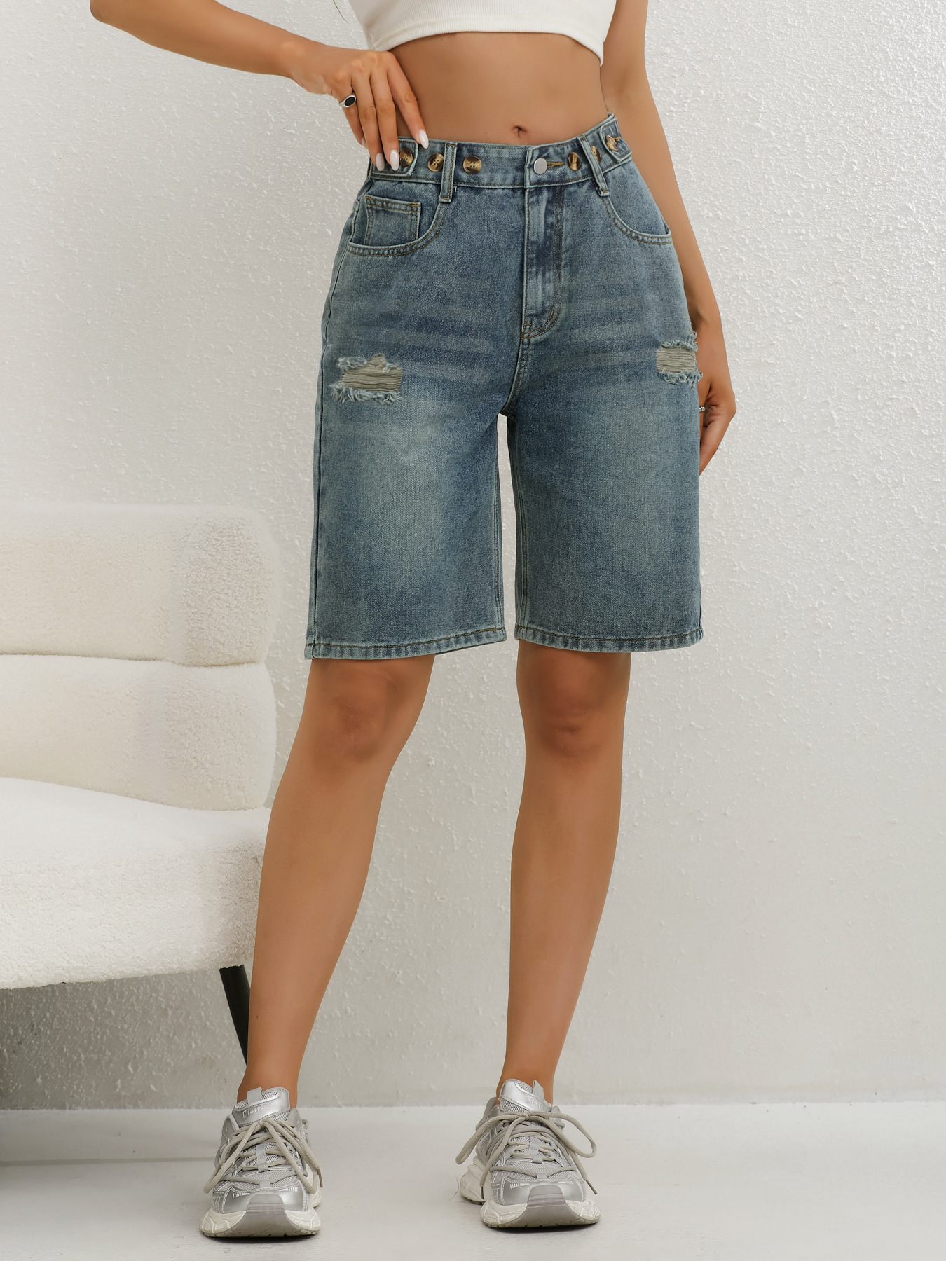 유럽과 미국의 크로스보더 찢어진 5부 미드팬츠, 루즈하고 슬림하며 조절 가능한 루즈한 배 모양 여성용 데님 미드팬츠