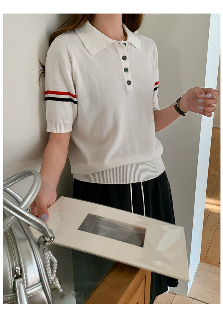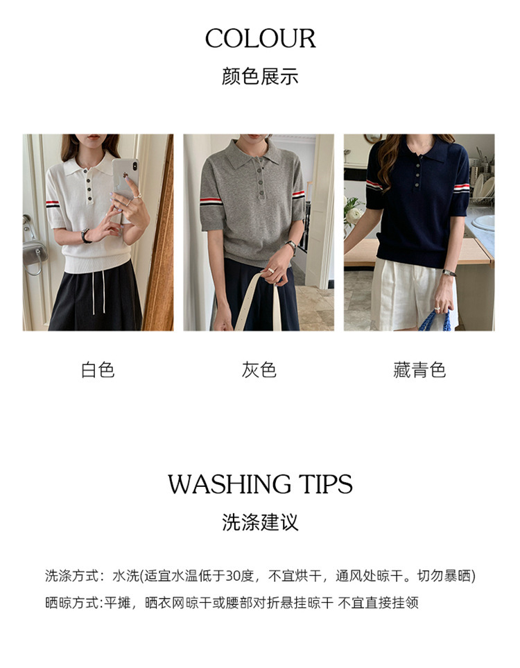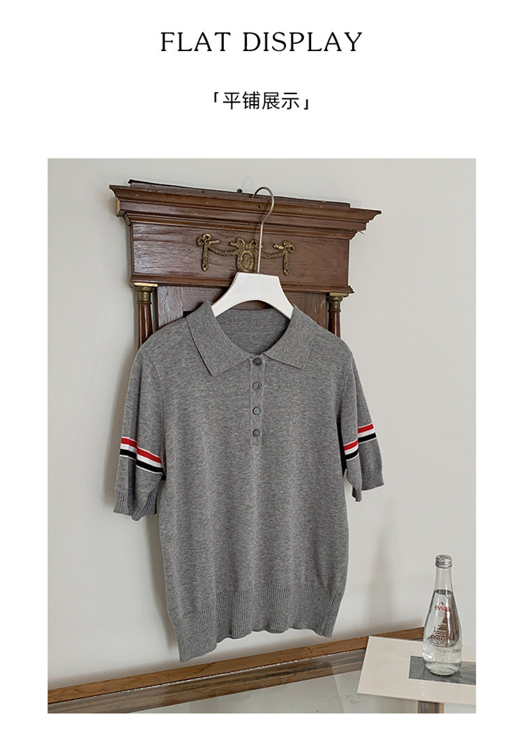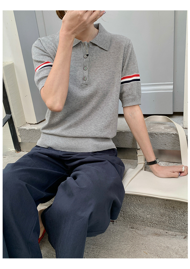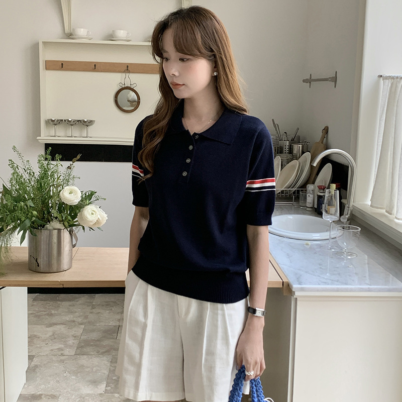 여름 새로운 스타일 옷깃 니트 반팔 폴로 셔츠 니트 더블 슬리브 컬러 스트립 반팔 남성과 여성의 같은 스타일 폴로 셔츠 도매스토어 가기