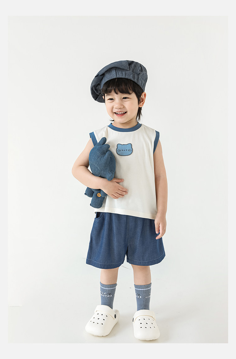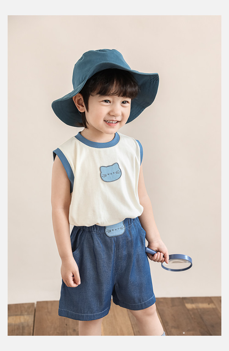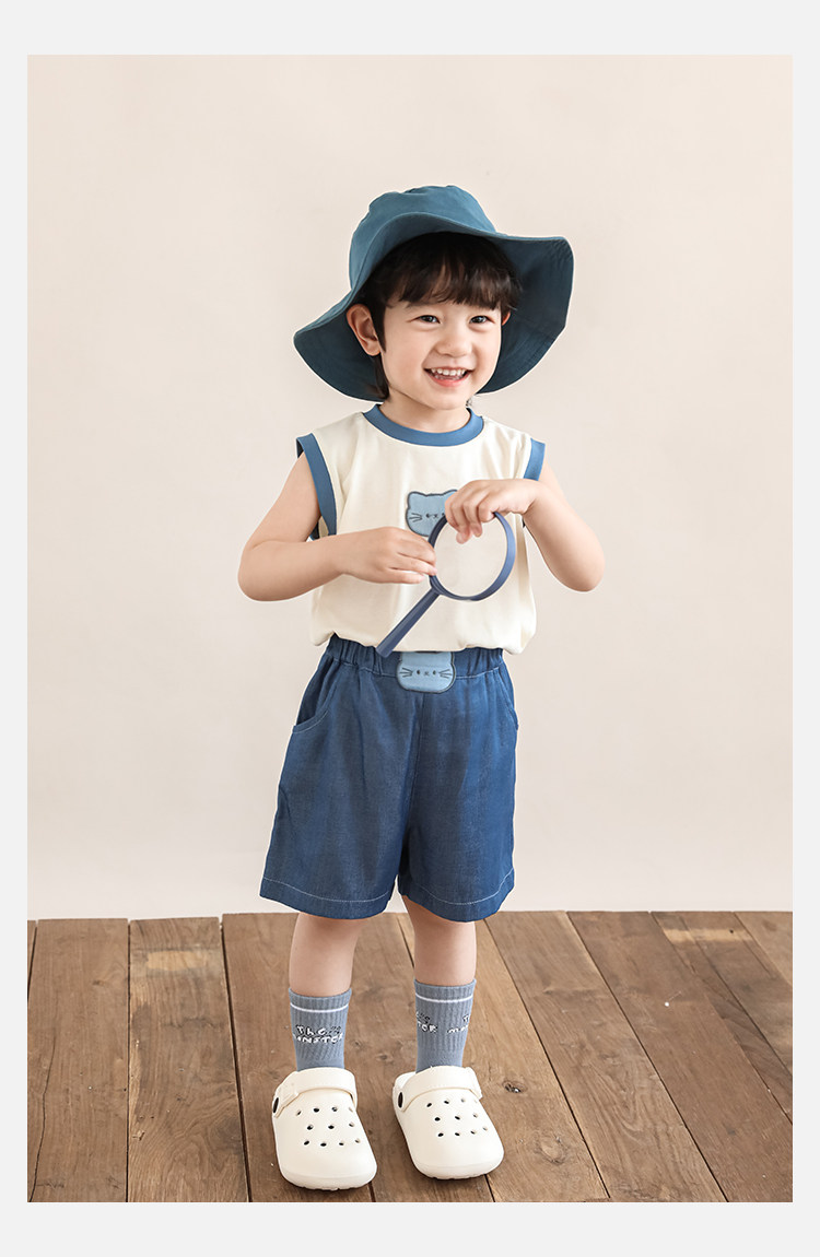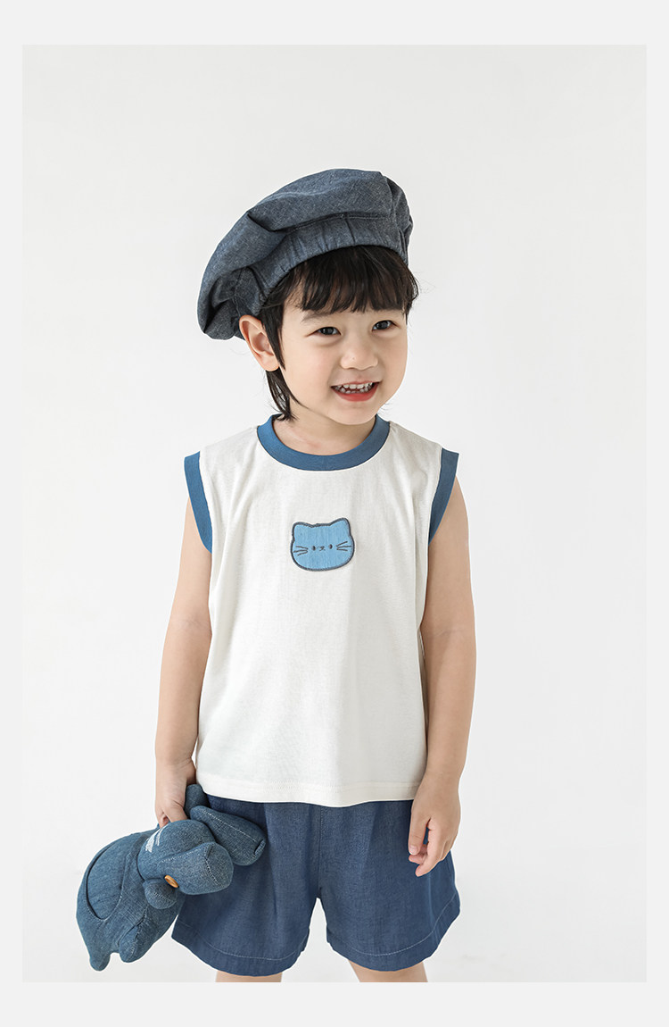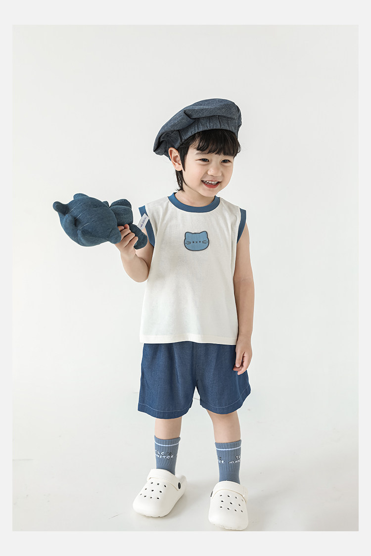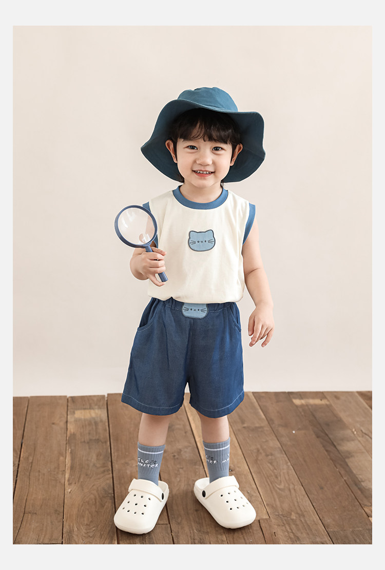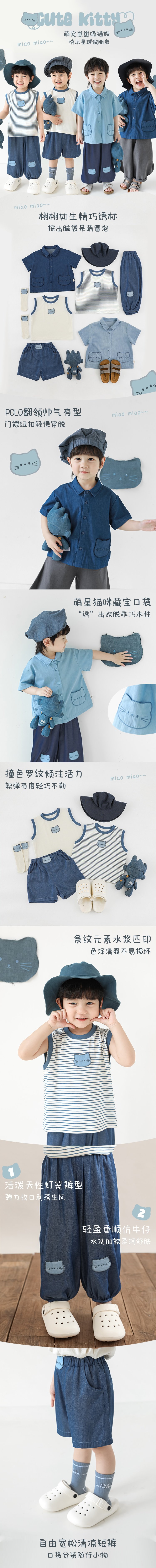 Wurib 소년 여름 새로운 폴로 옷깃 셔츠 민소매 조끼 느슨한 반바지 고양이 시리즈 세트스토어 가기