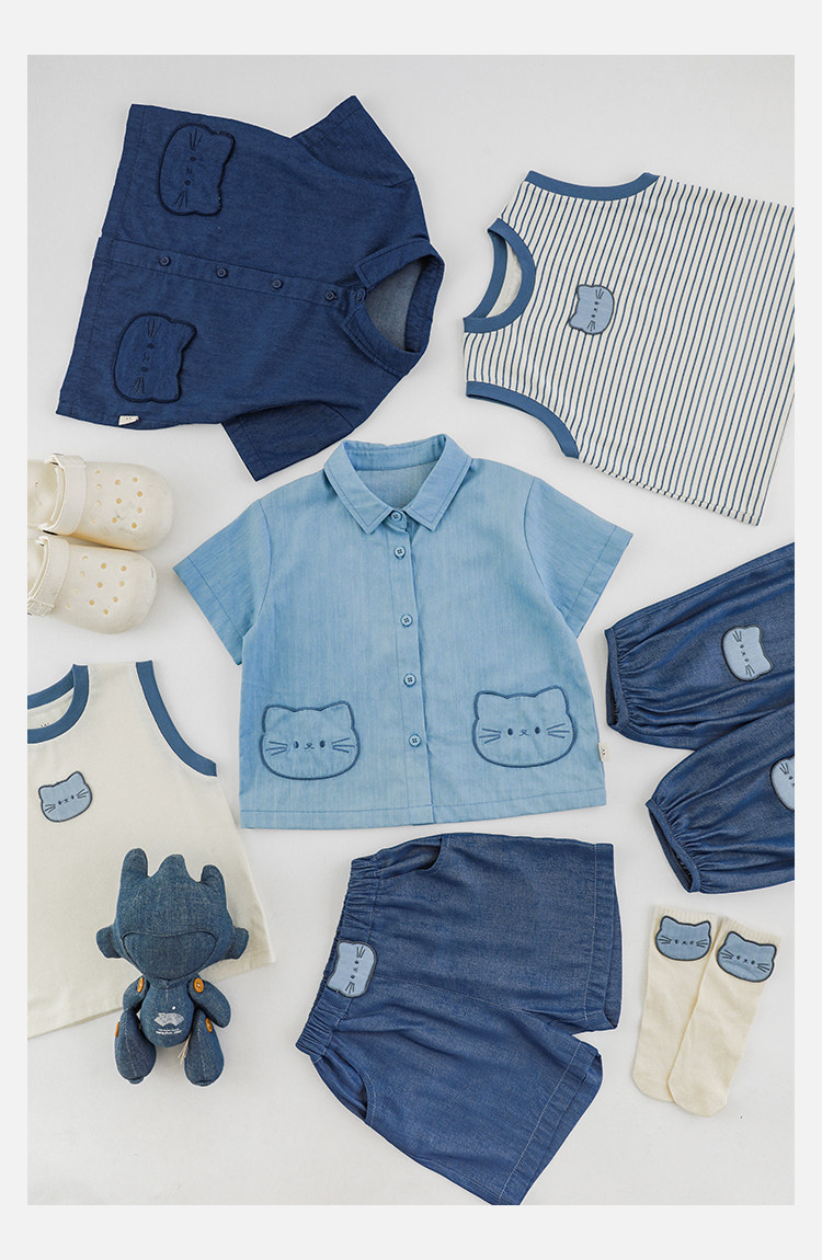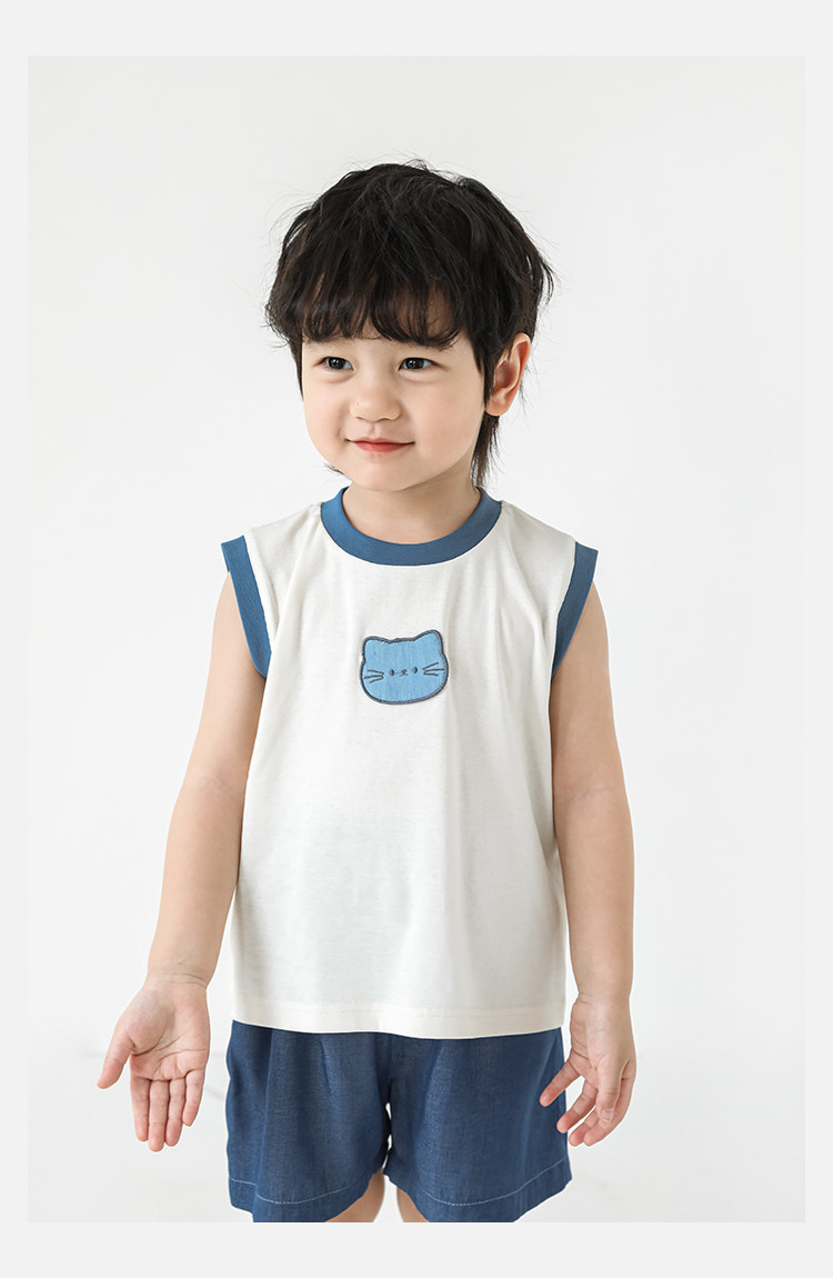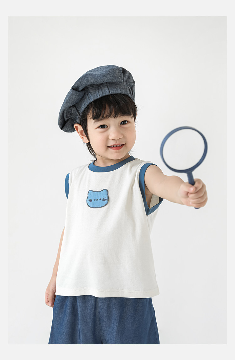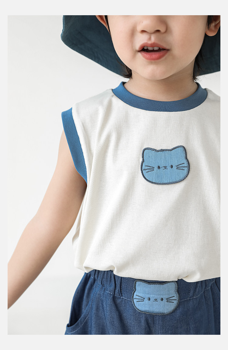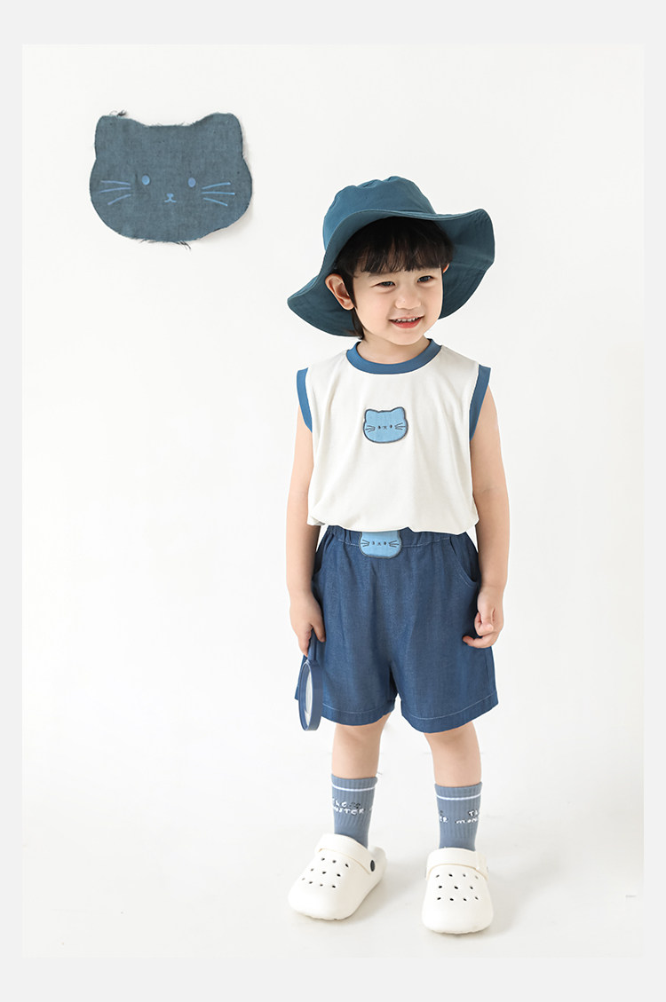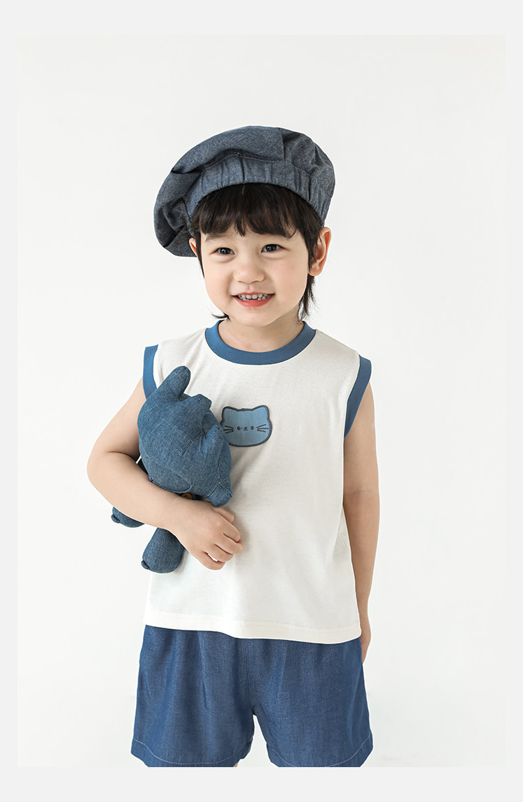 Wurib 소년 여름 새로운 폴로 옷깃 셔츠 민소매 조끼 느슨한 반바지 고양이 시리즈 세트스토어 가기