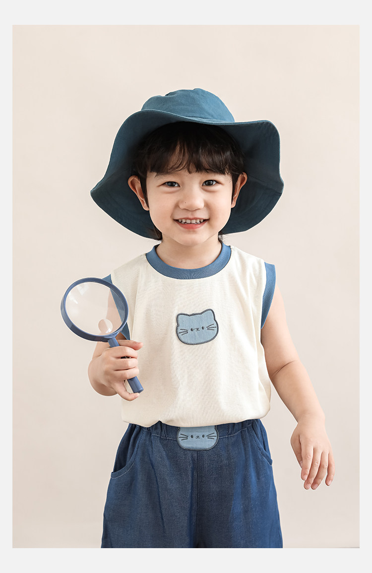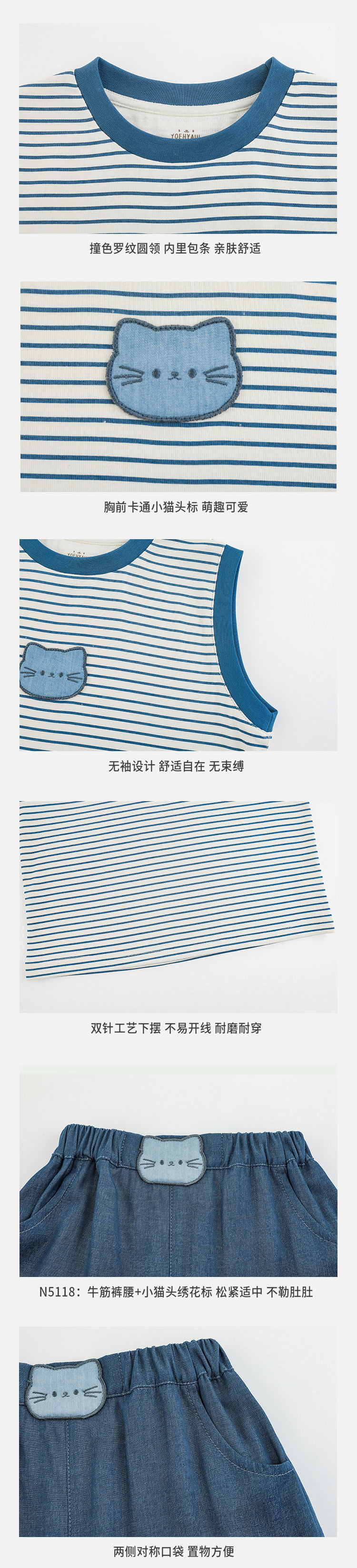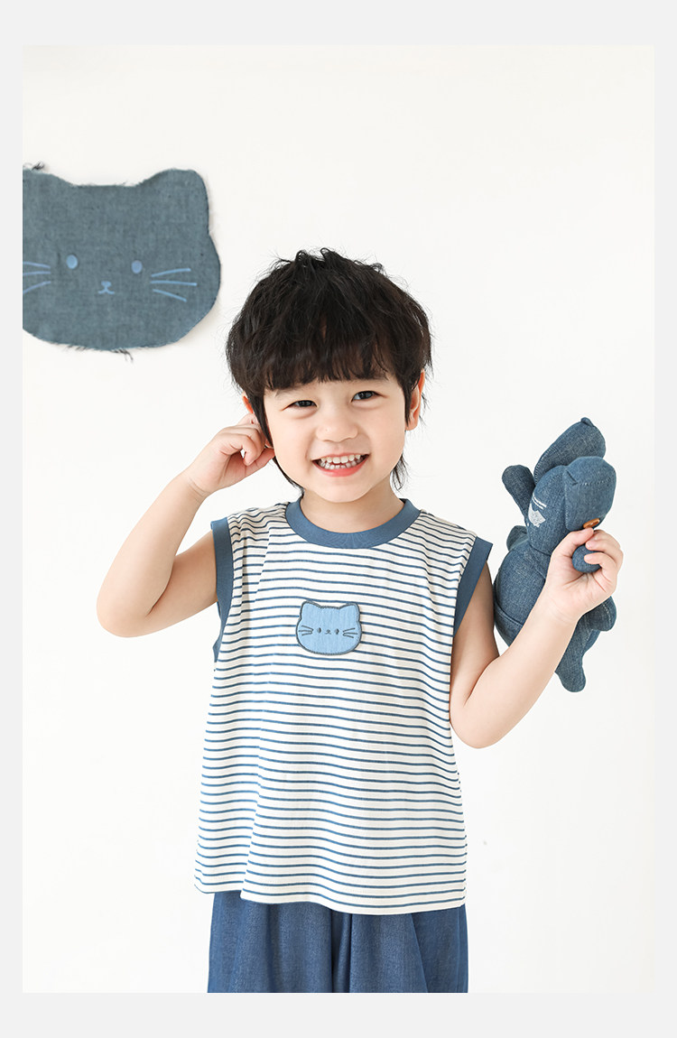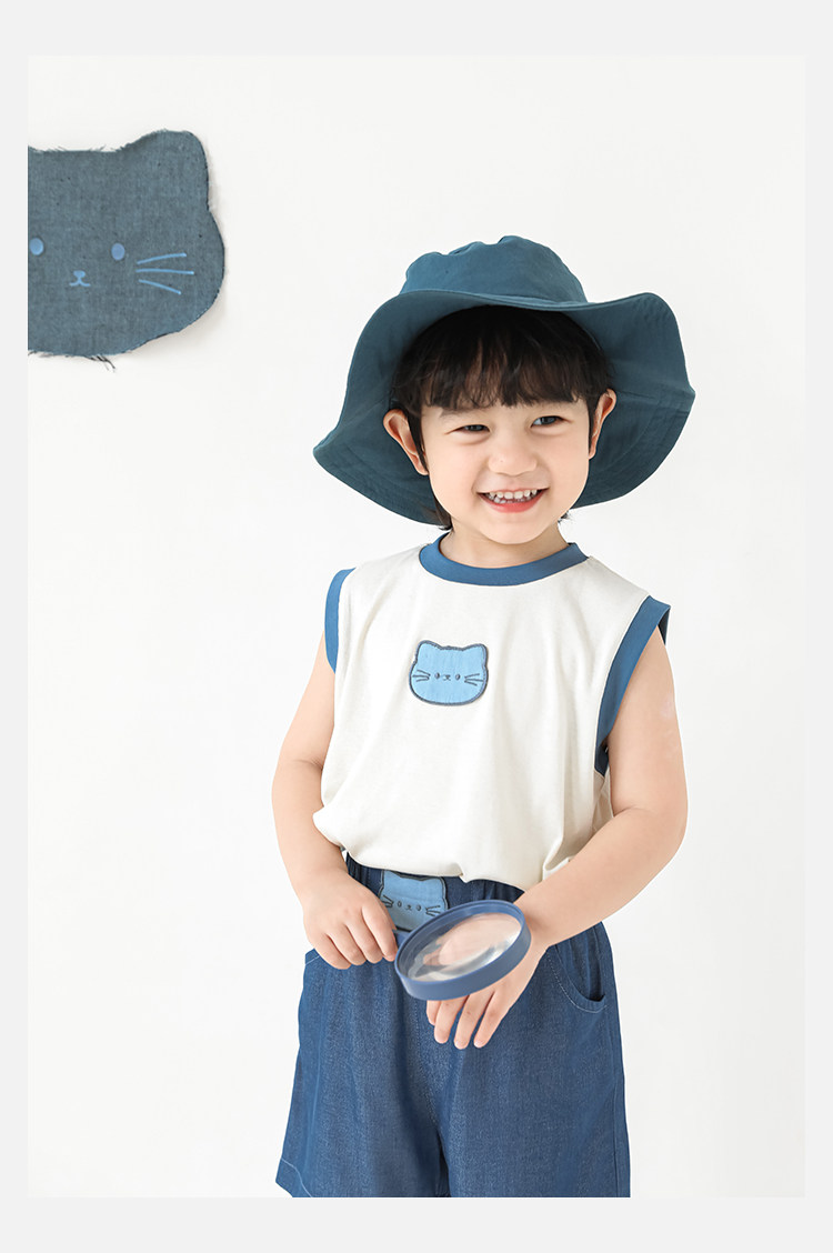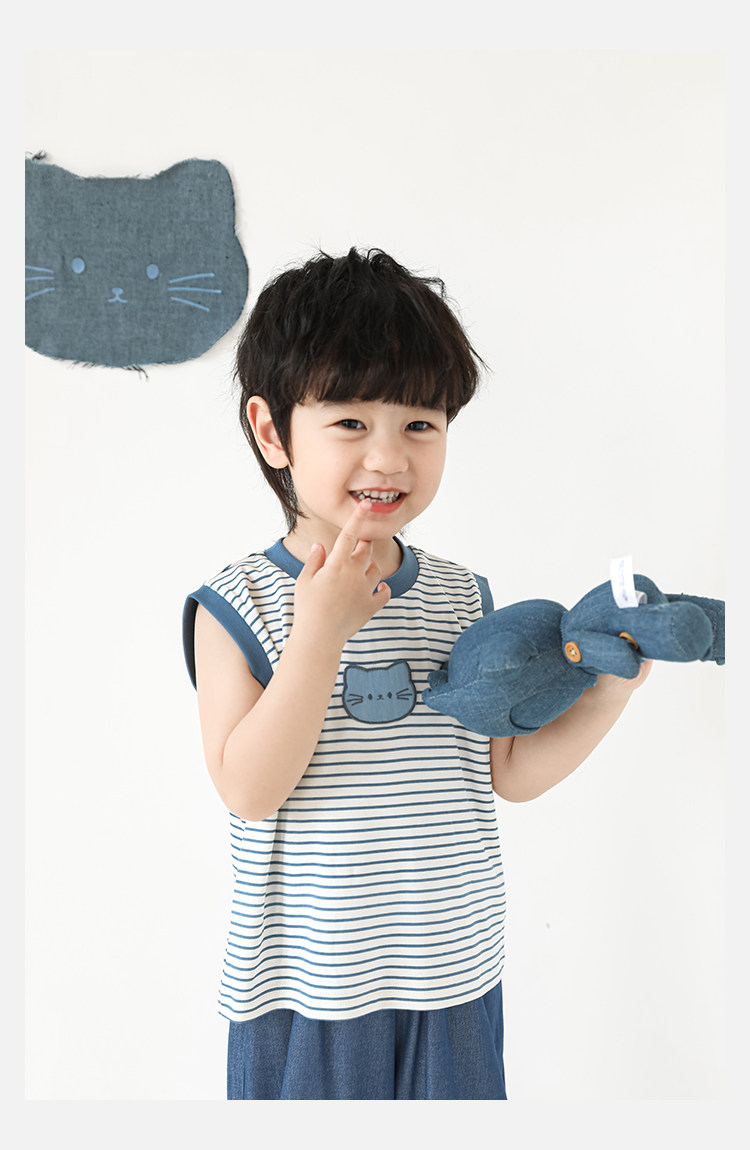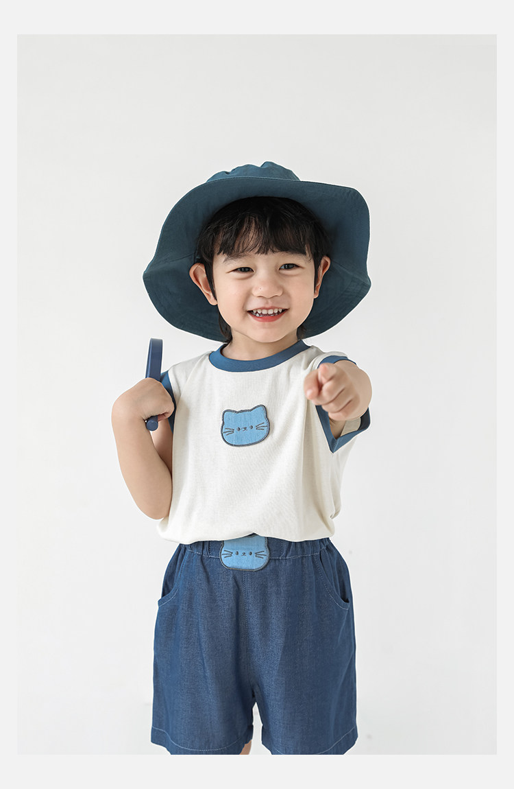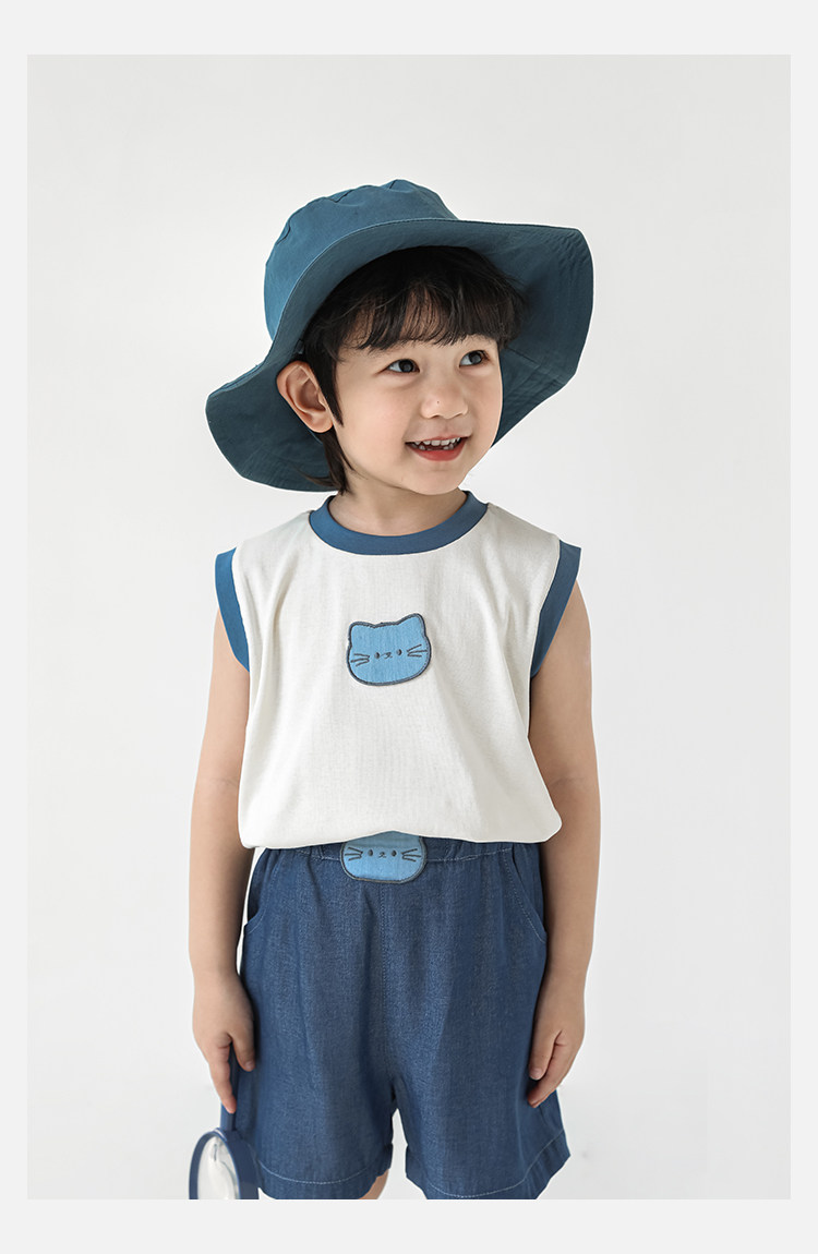 Wurib 소년 여름 새로운 폴로 옷깃 셔츠 민소매 조끼 느슨한 반바지 고양이 시리즈 세트스토어 가기