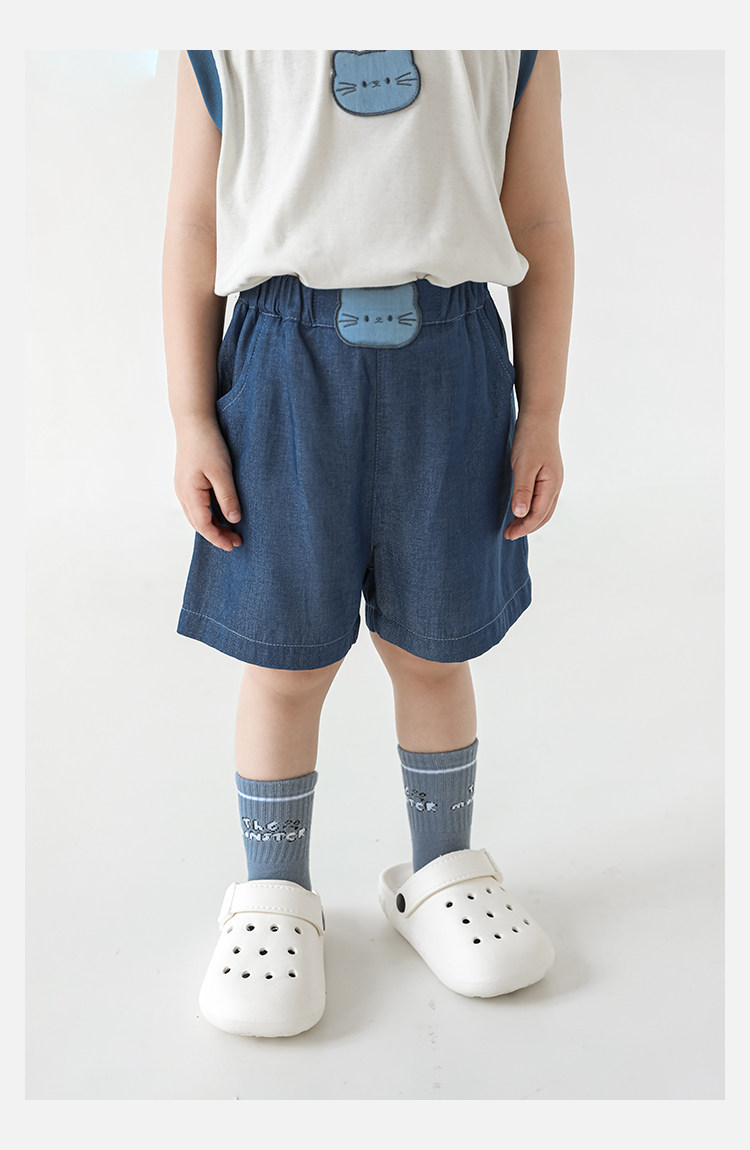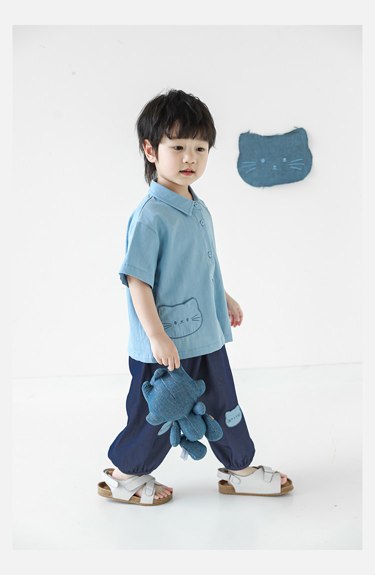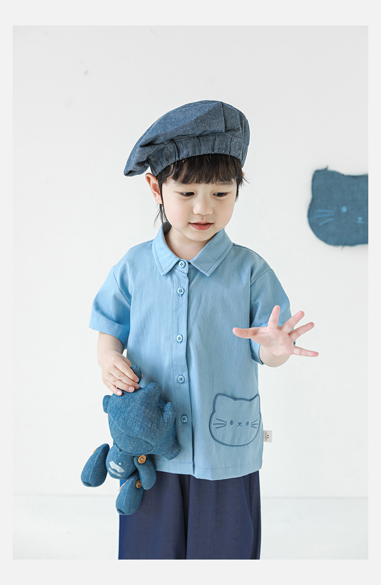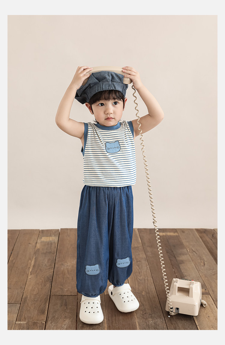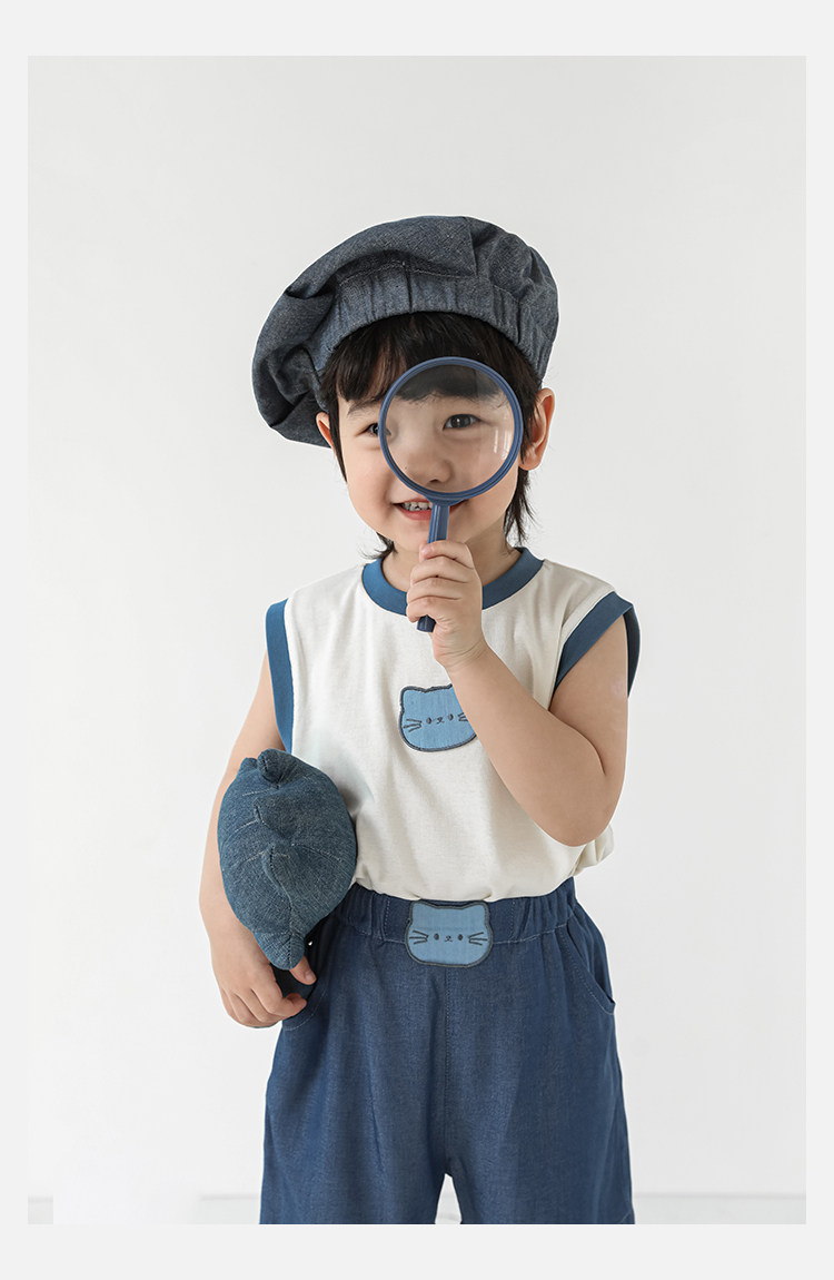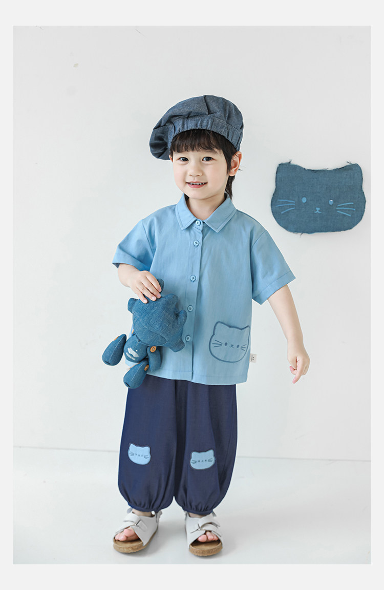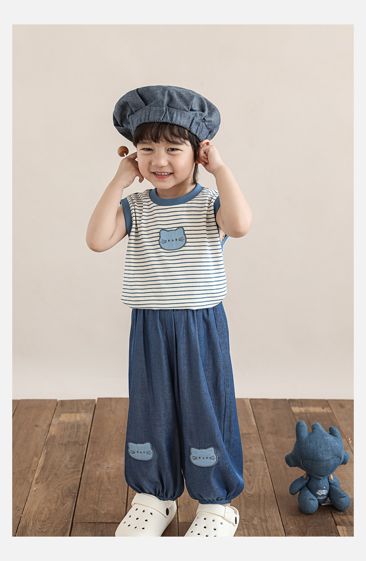 Wurib 소년 여름 새로운 폴로 옷깃 셔츠 민소매 조끼 느슨한 반바지 고양이 시리즈 세트스토어 가기