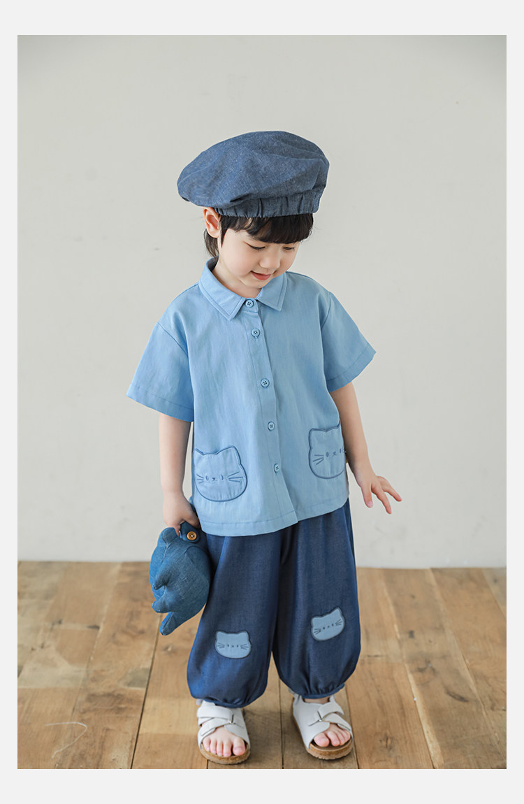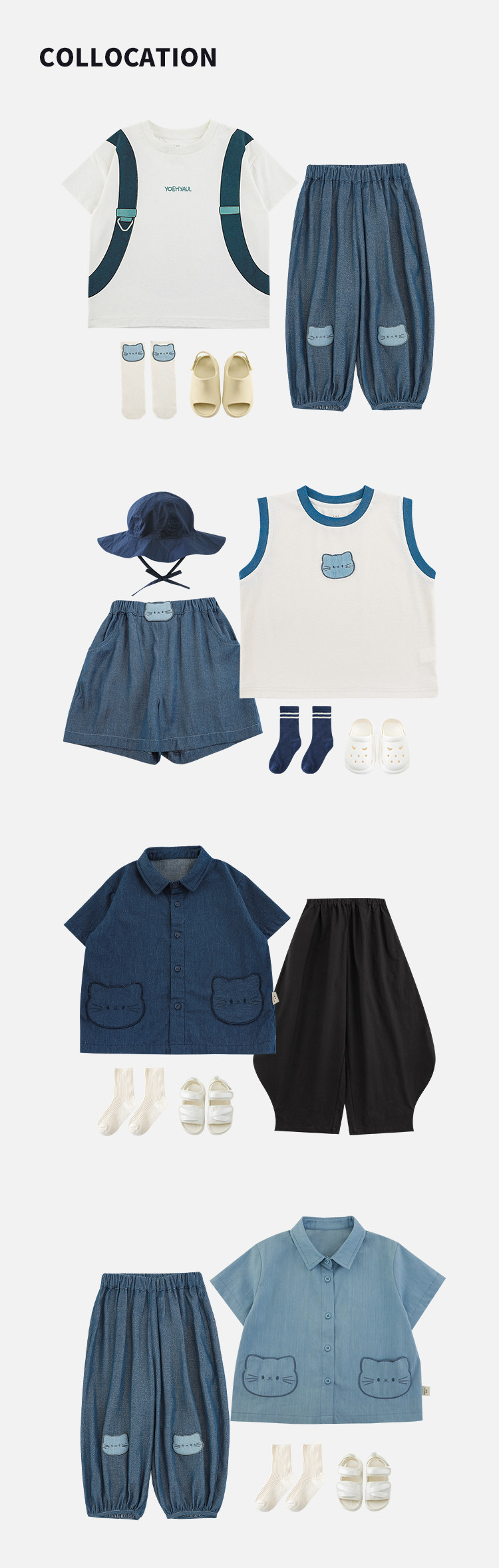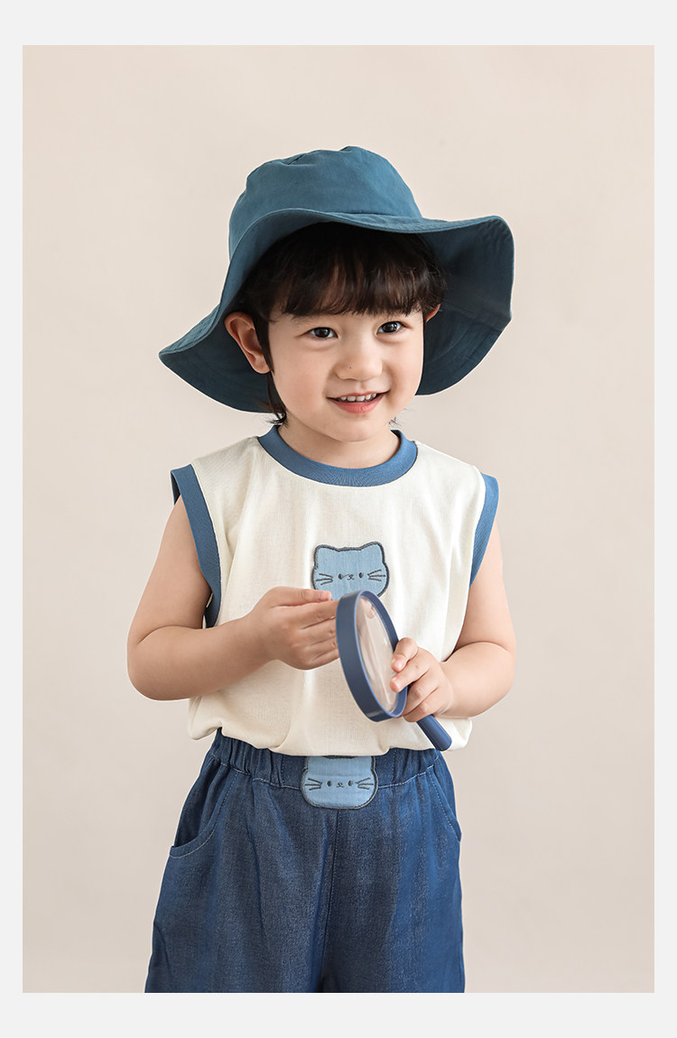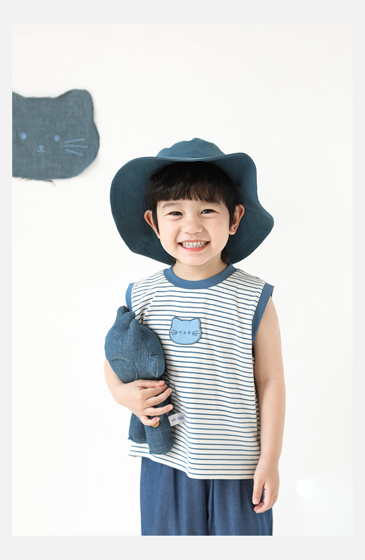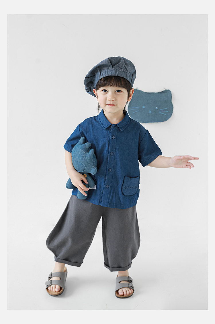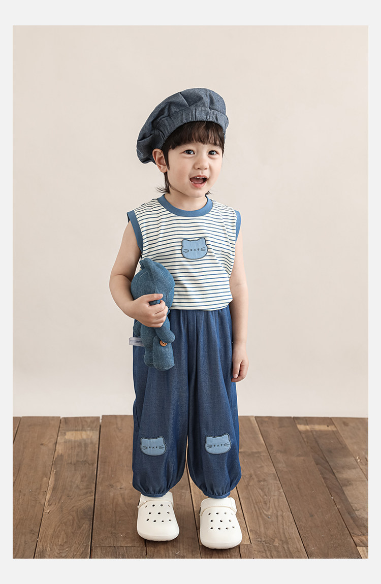 Wurib 소년 여름 새로운 폴로 옷깃 셔츠 민소매 조끼 느슨한 반바지 고양이 시리즈 세트스토어 가기