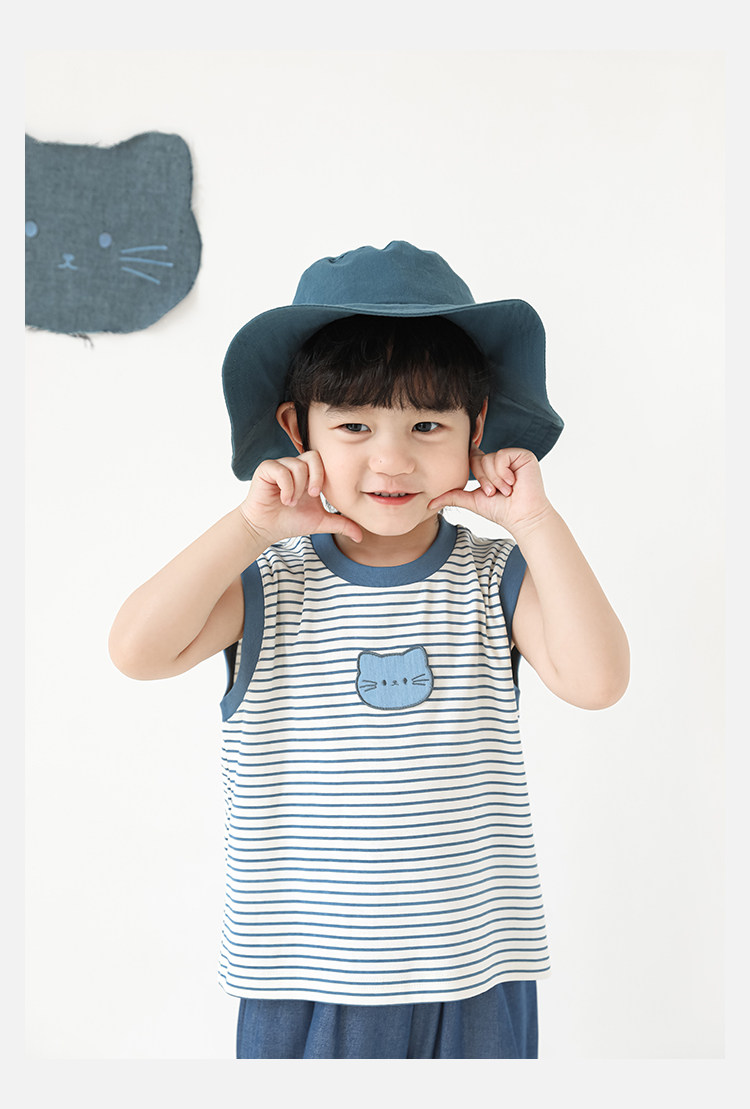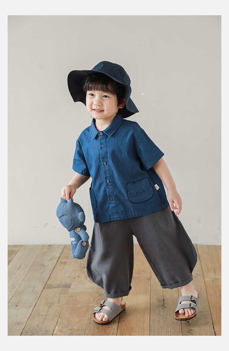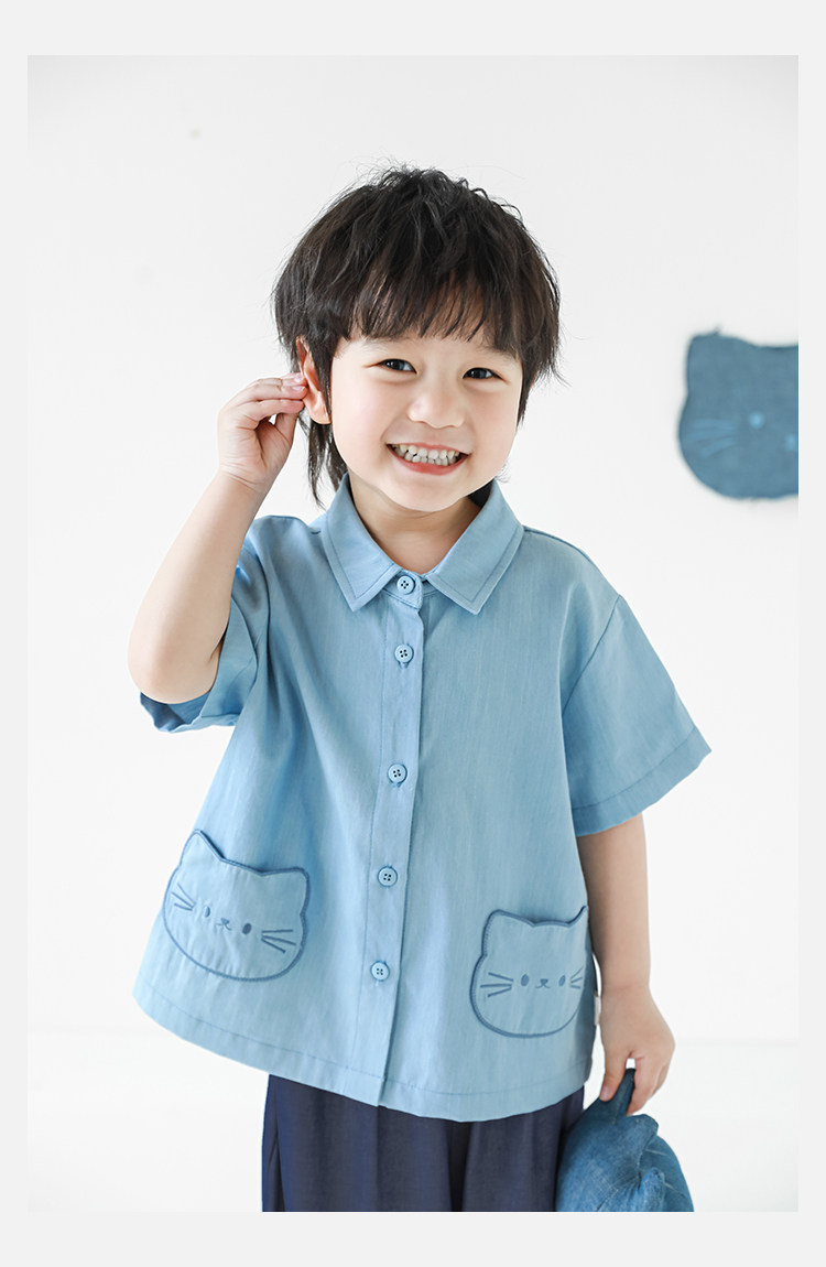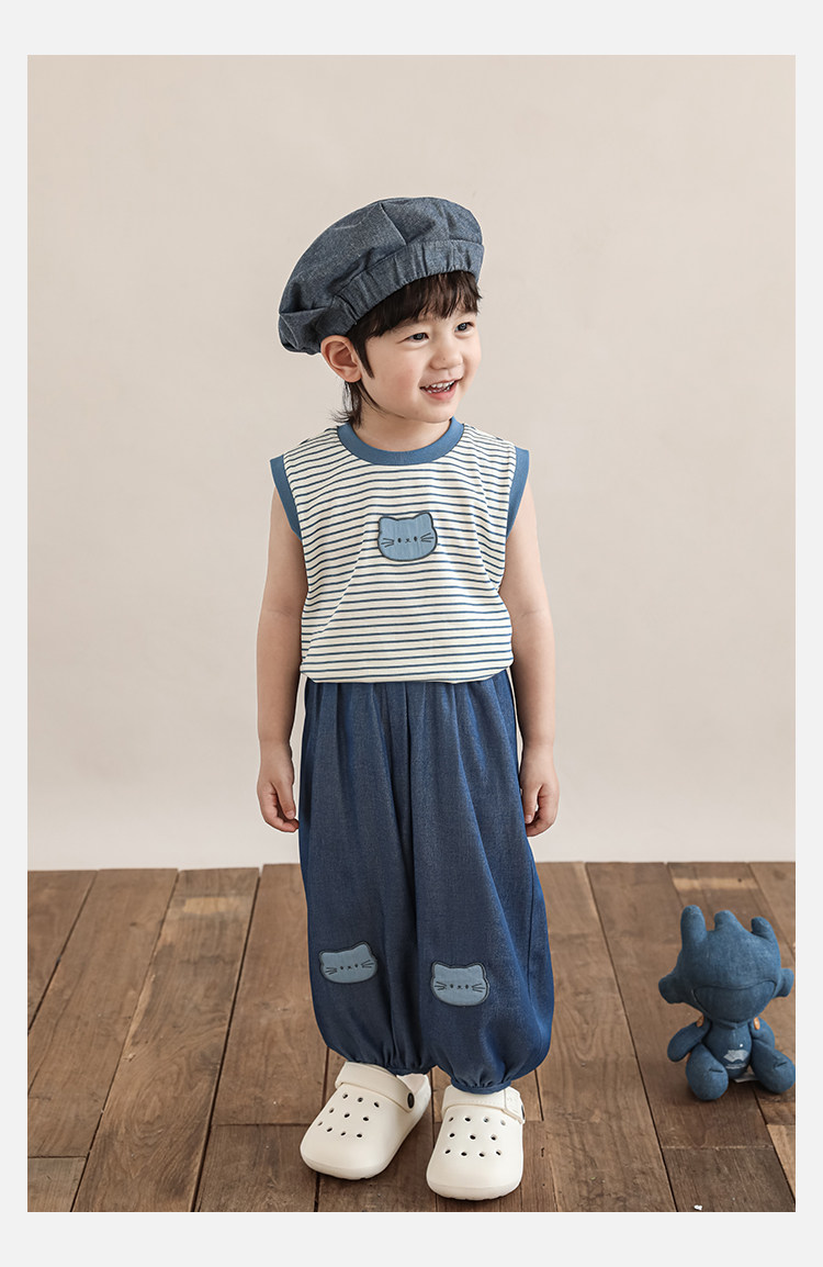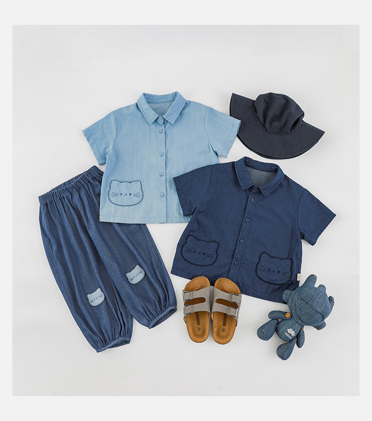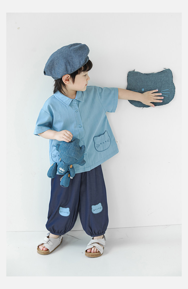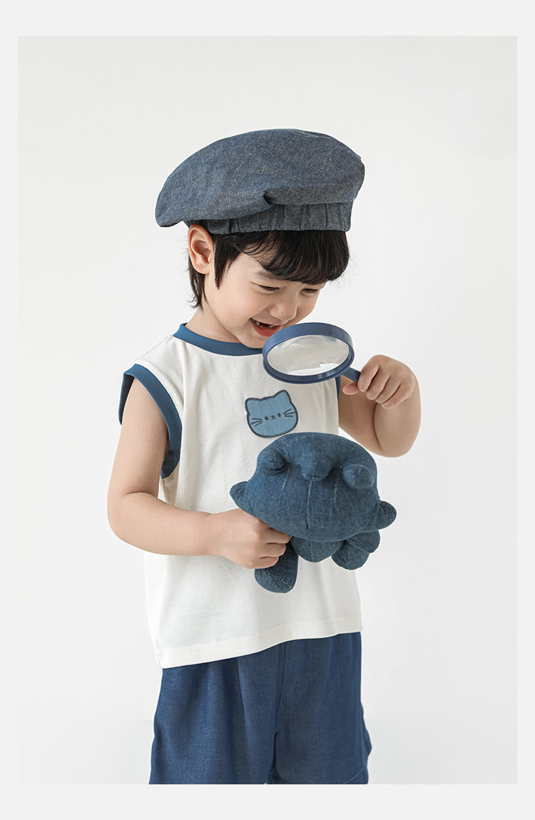 Wurib 소년 여름 새로운 폴로 옷깃 셔츠 민소매 조끼 느슨한 반바지 고양이 시리즈 세트스토어 가기