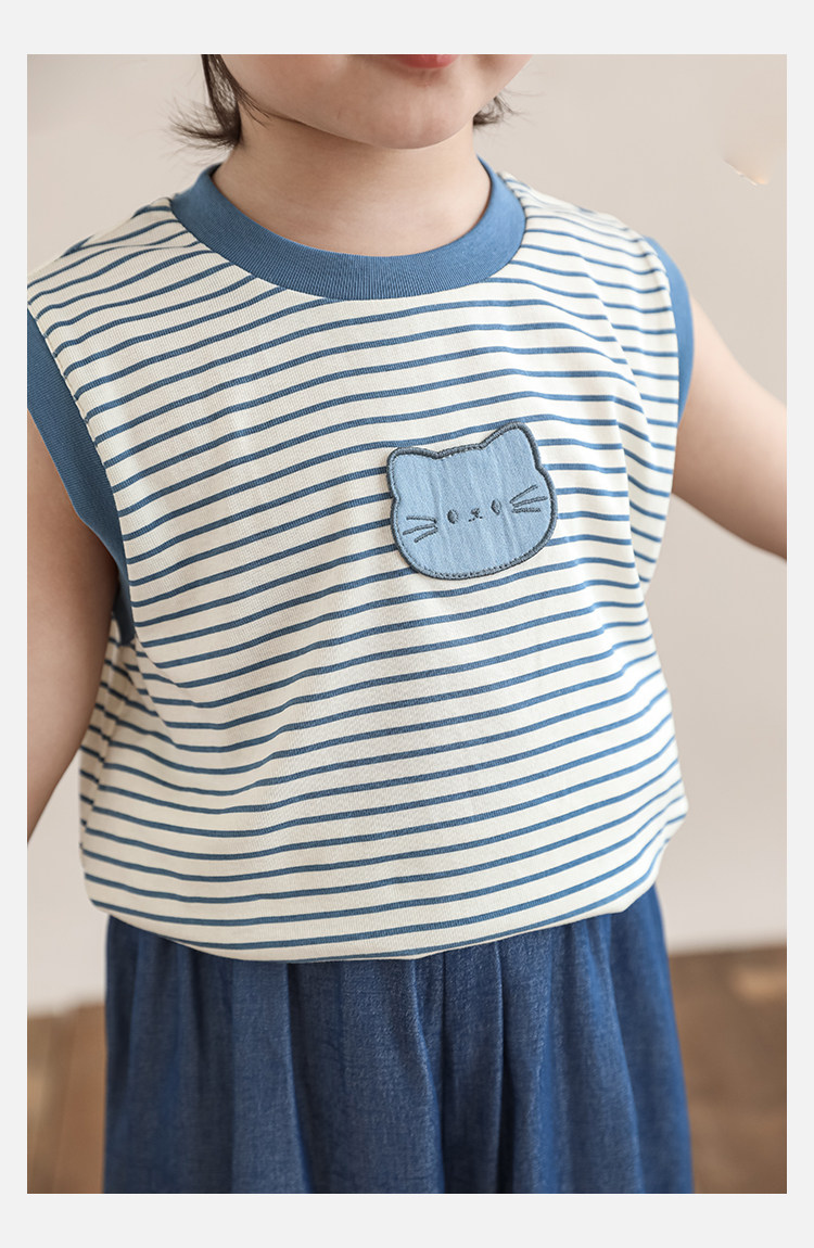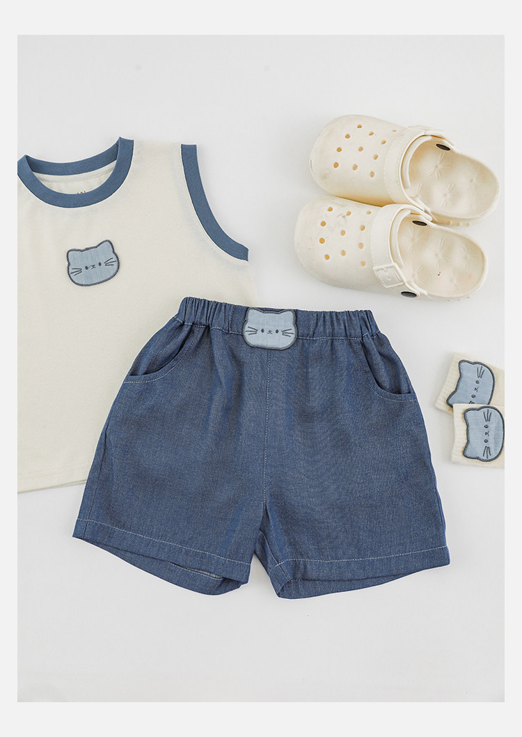 Wurib 소년 여름 새로운 폴로 옷깃 셔츠 민소매 조끼 느슨한 반바지 고양이 시리즈 세트