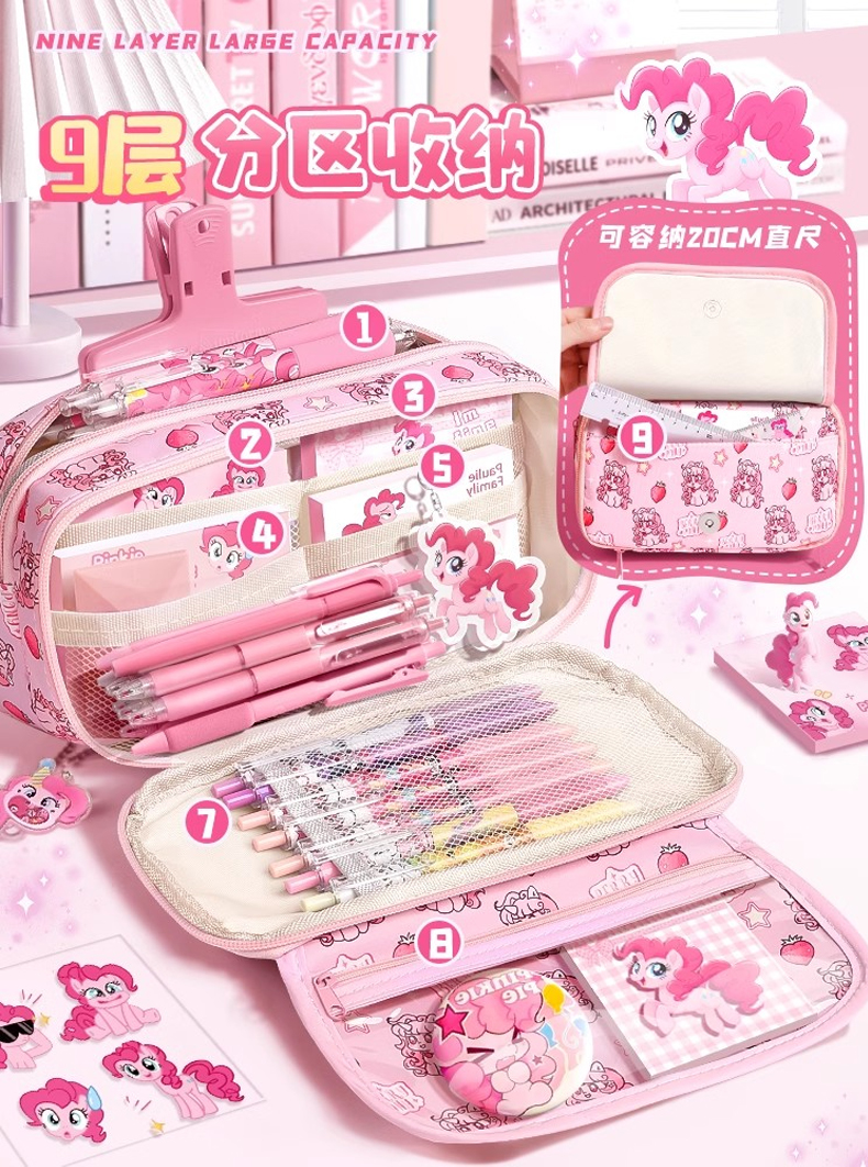 • 9단 핑크 필통 + 포니 카드백 + 스티커 2개 + 바지 1개 + 펜던트 1개 + PP클립 1개 + 정품 지우개 1개 + 젤펜 6개 + 지팡이 클립 1개 + 수정테이프*1