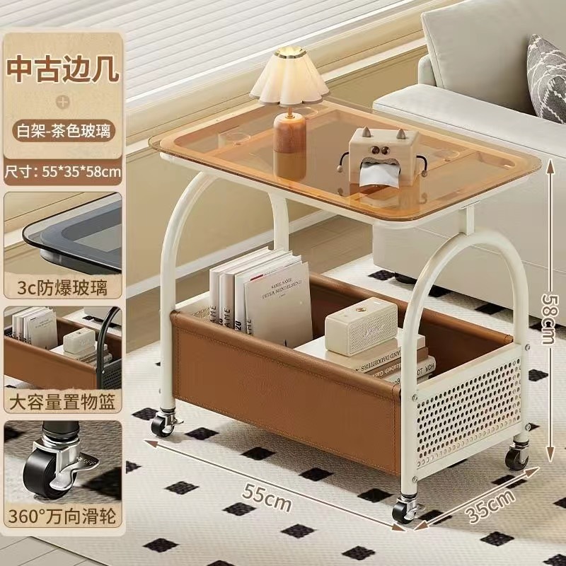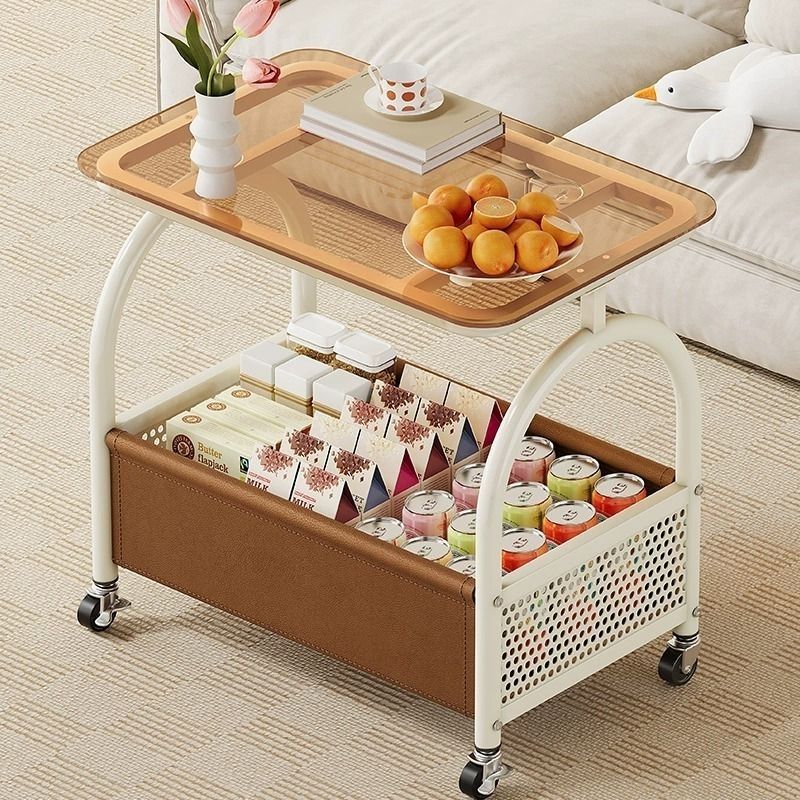 공장 도매 침대 옆 탁자 크림 스타일 유리 이동식 선반 바퀴 달린 사이드 테이블 간단한 작은 커피 테이블 트롤리