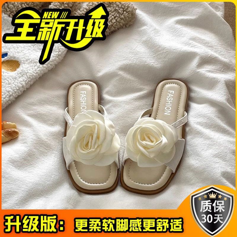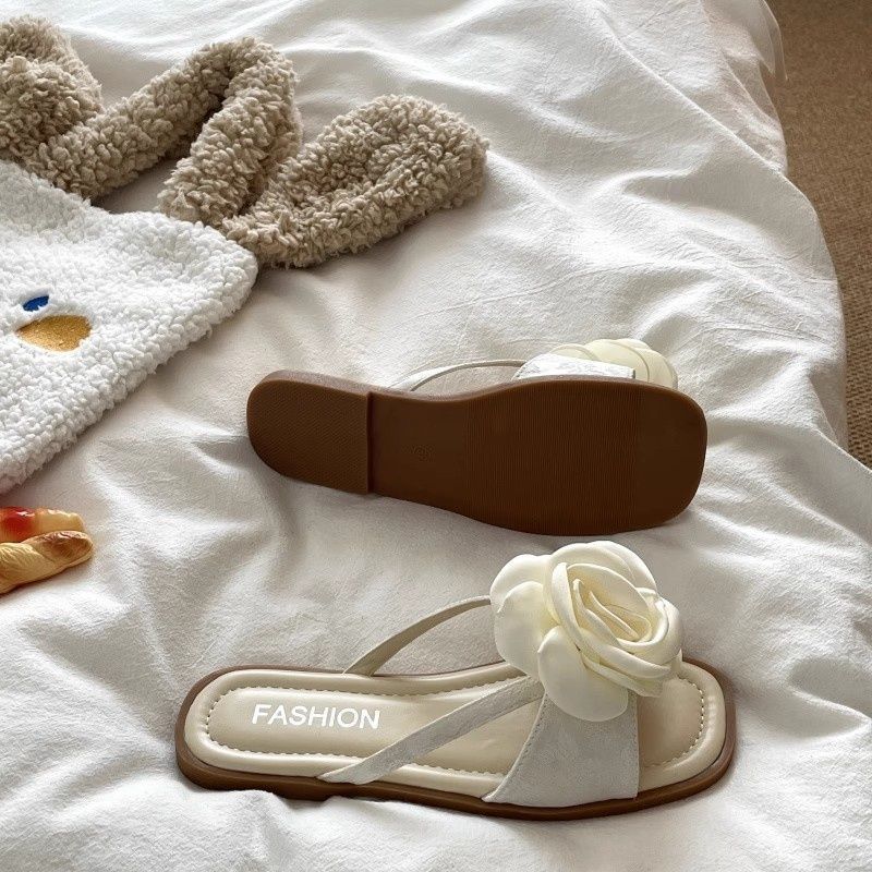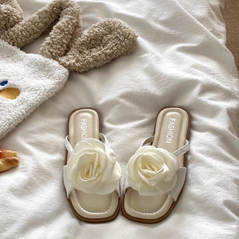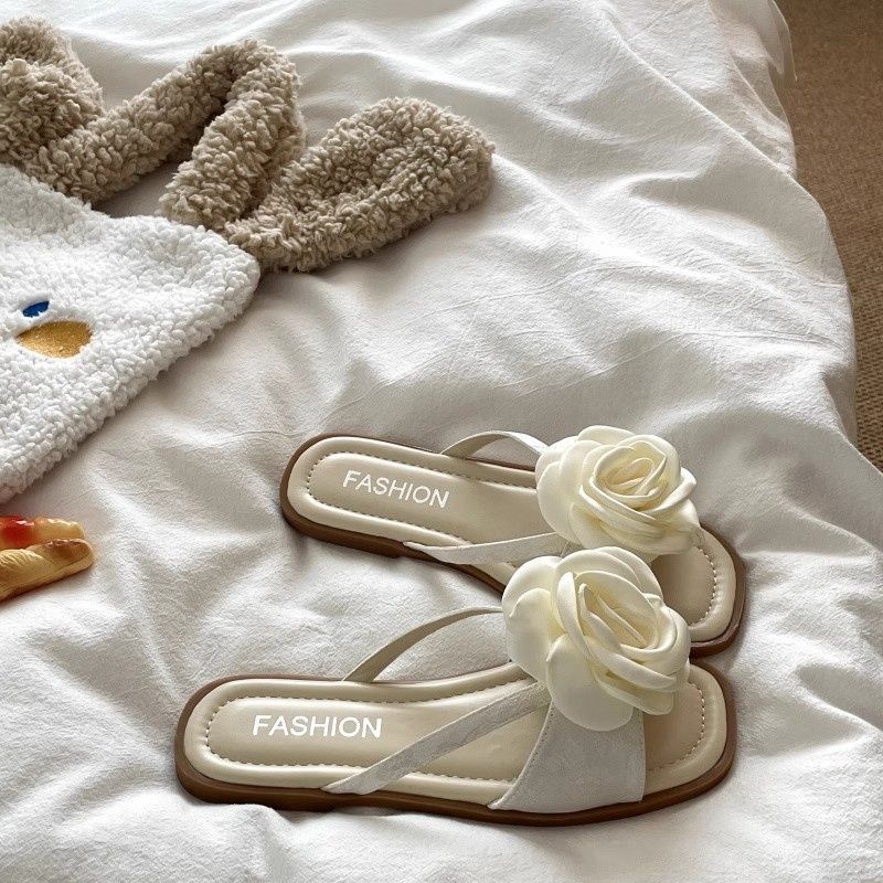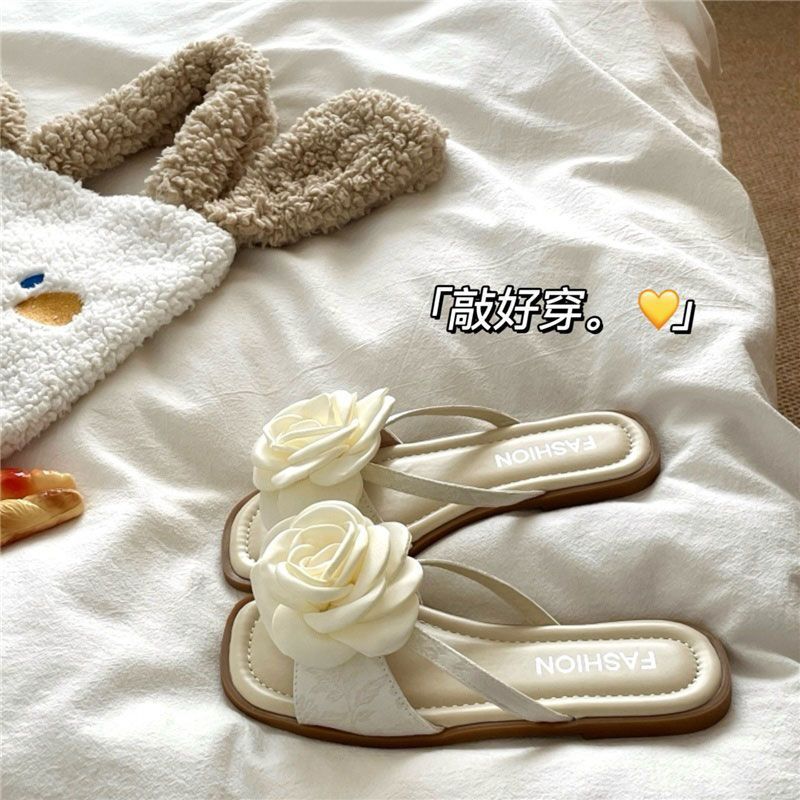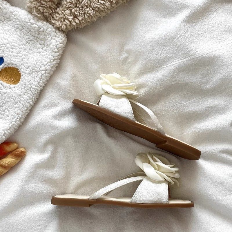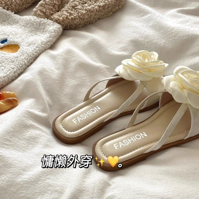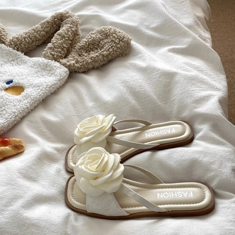 여성용 플랫 슬리퍼 2025 여름 한국 스타일 요정풍 꽃무늬 비치 샌들 여성용 플랫 편안한 슬리퍼