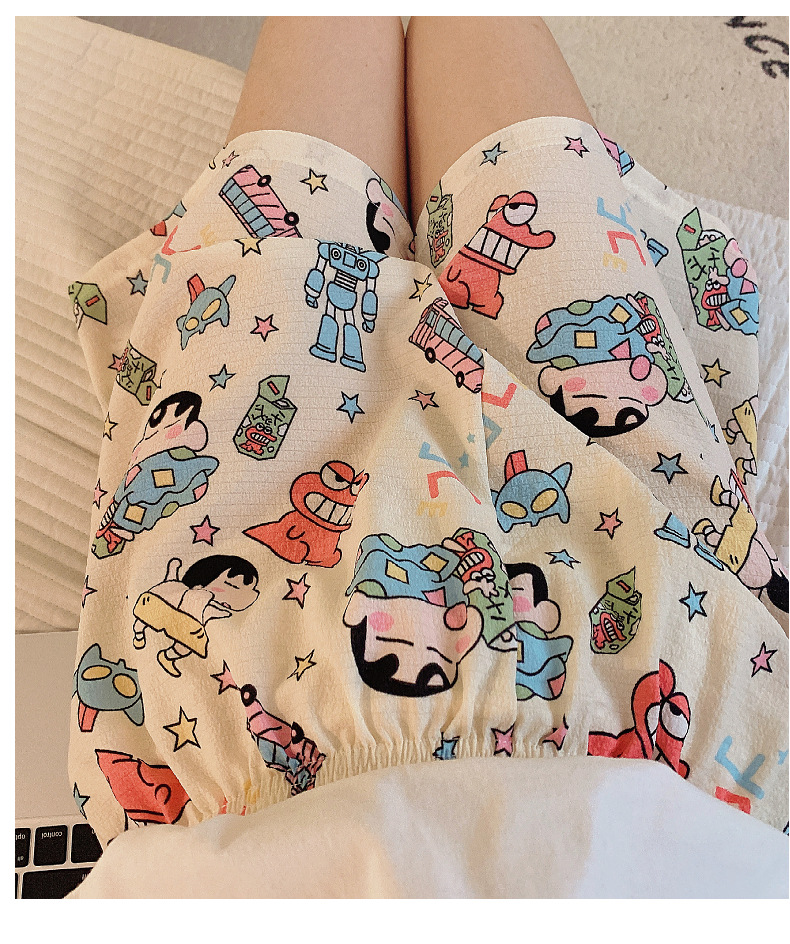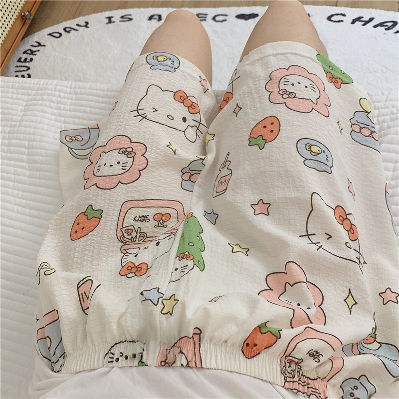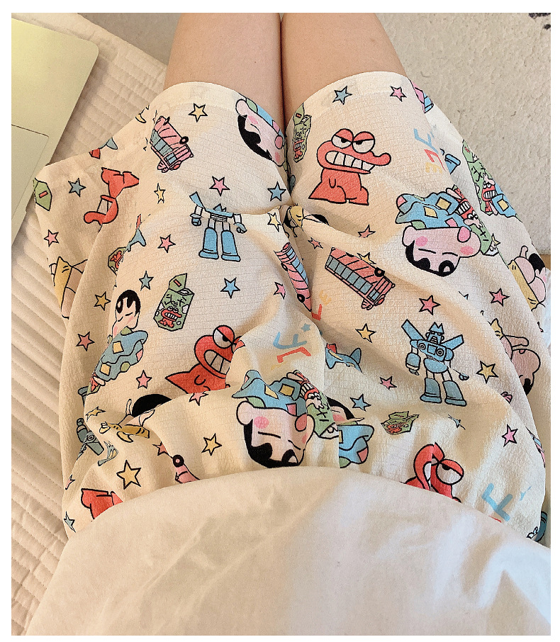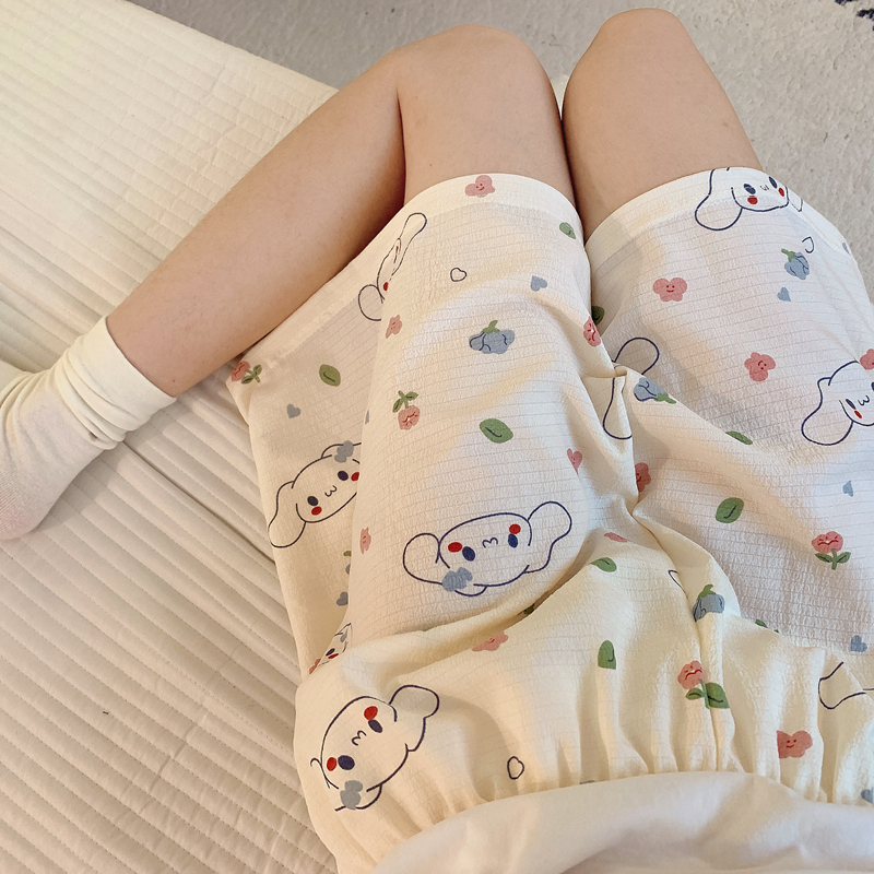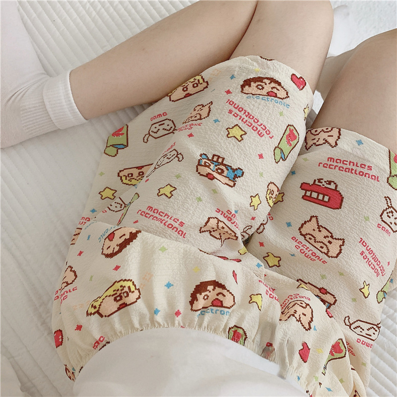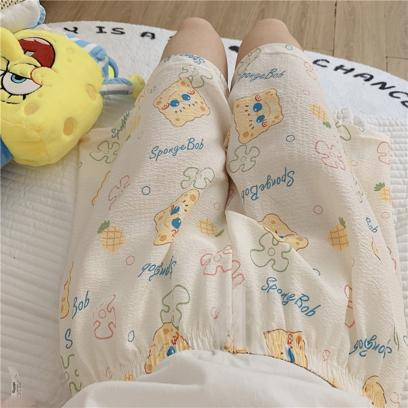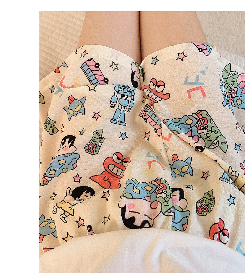 일본식 만화 인쇄 된 파자마 바지 여성의 여름 새로운 캐주얼 루즈 워킹 바지 얇은 홈 바지를 입고 외부 반바지스토어 가기