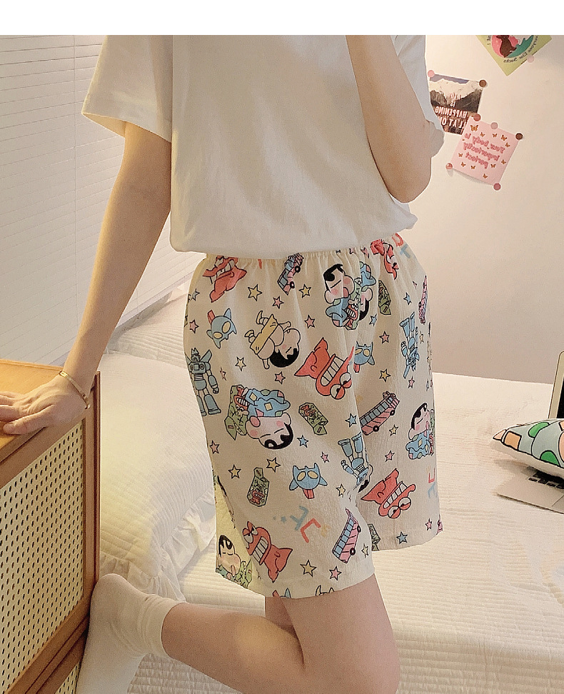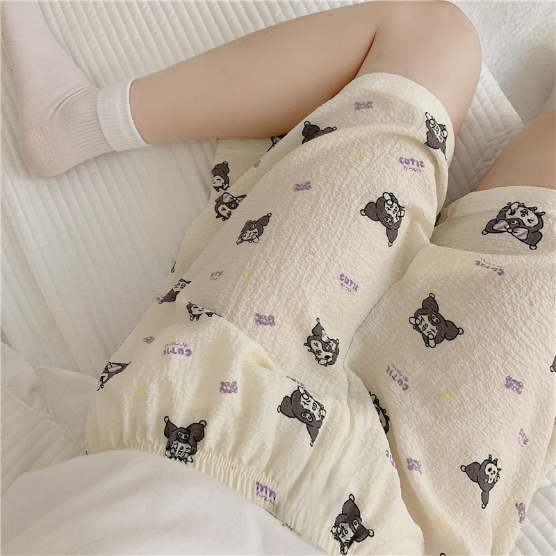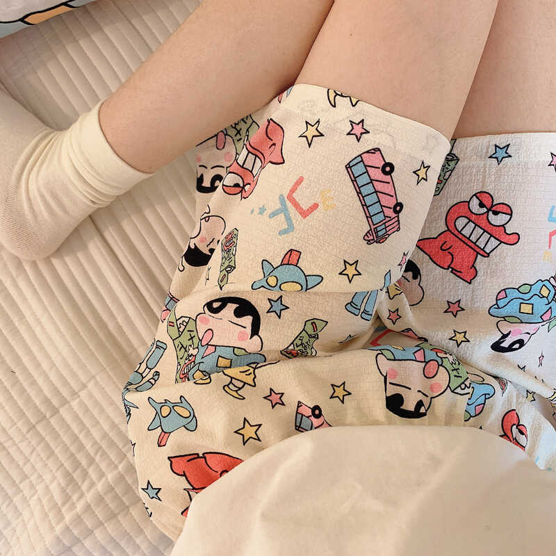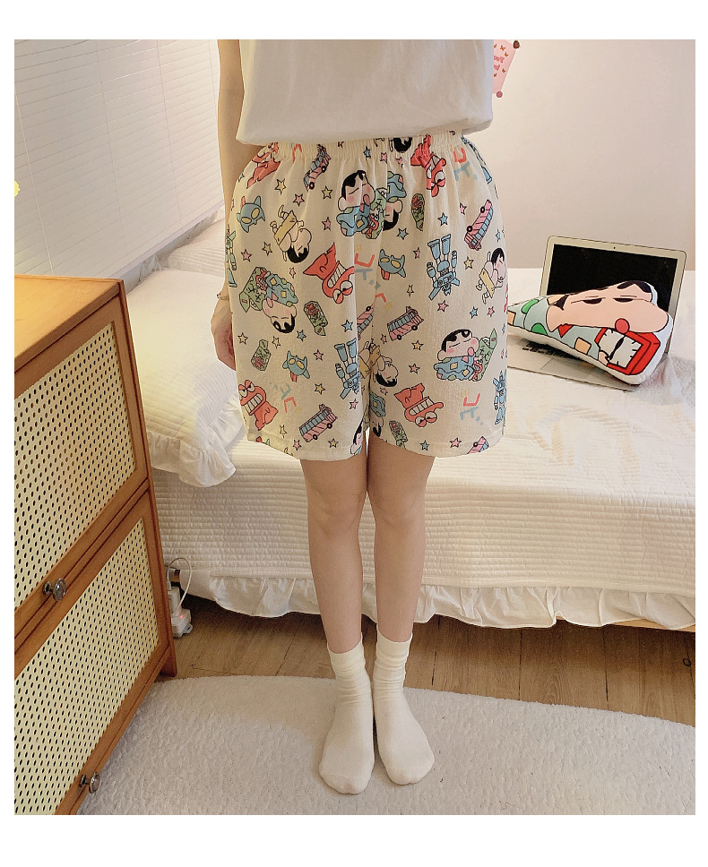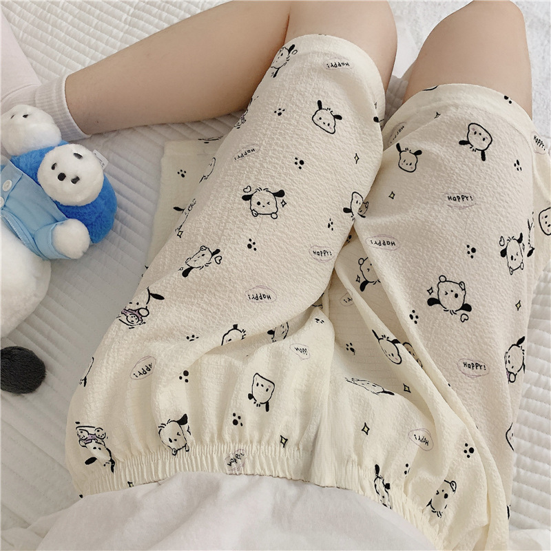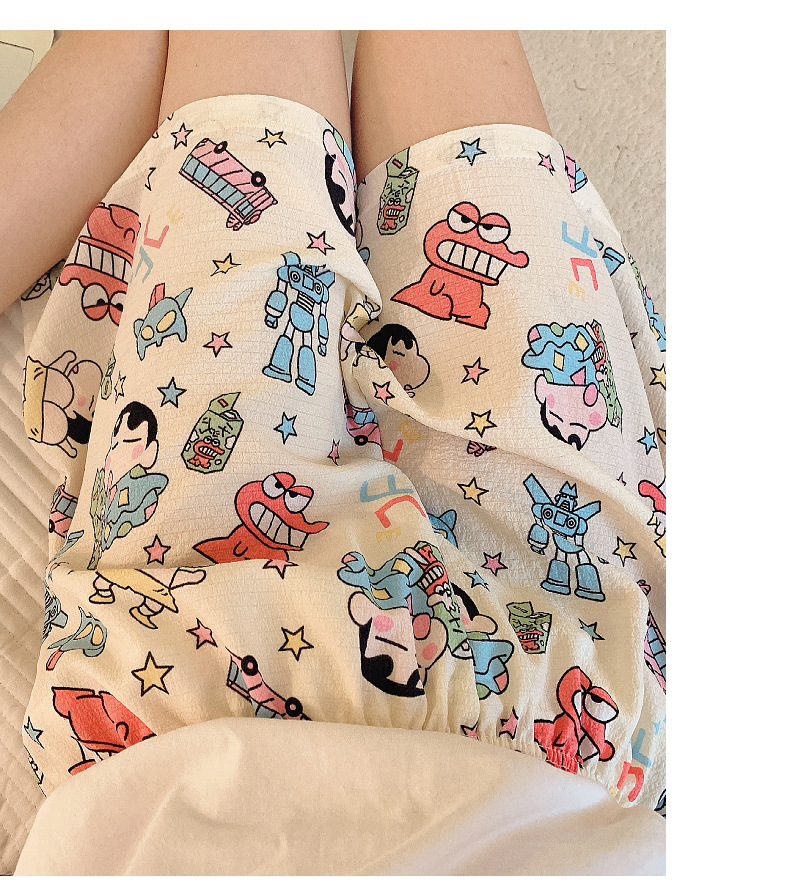 일본식 만화 인쇄 된 파자마 바지 여성의 여름 새로운 캐주얼 루즈 워킹 바지 얇은 홈 바지를 입고 외부 반바지스토어 가기