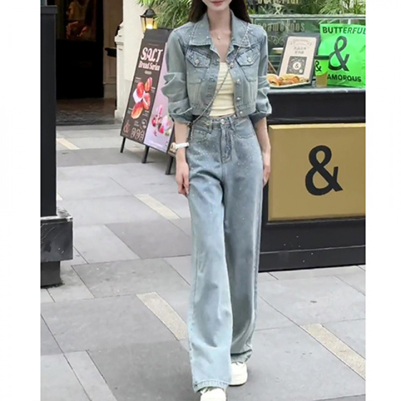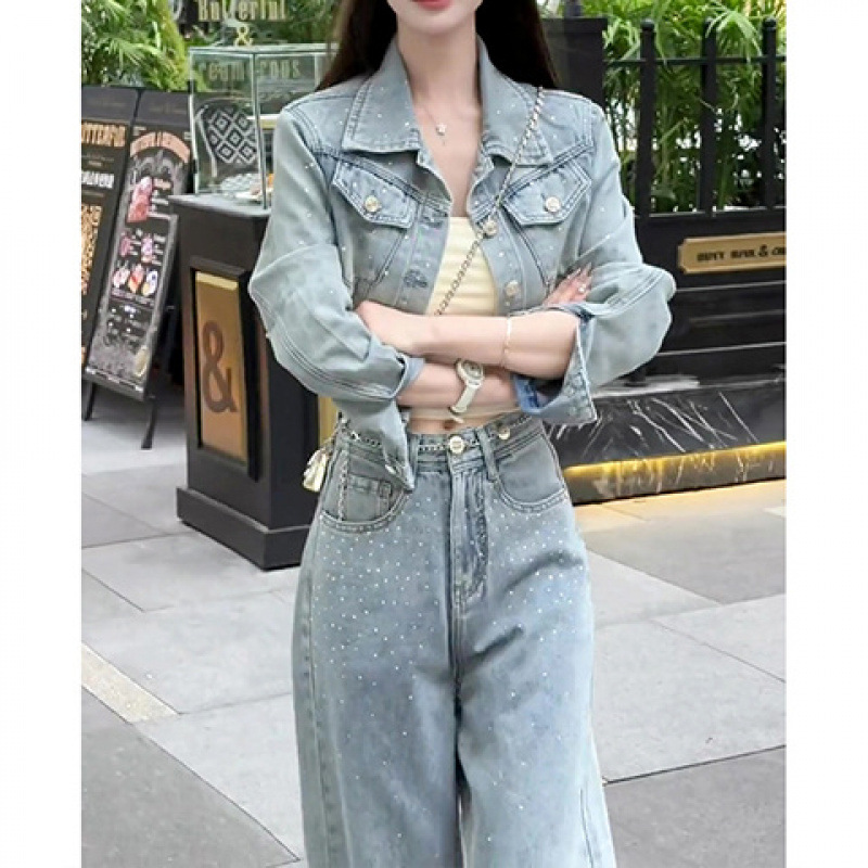 빈티지 중공업 뜨거운 드릴링 짧은 데님 재킷 여성 세트 가을 새로운 높은 허리 넓은 다리 바지 투피스 세트스토어 가기