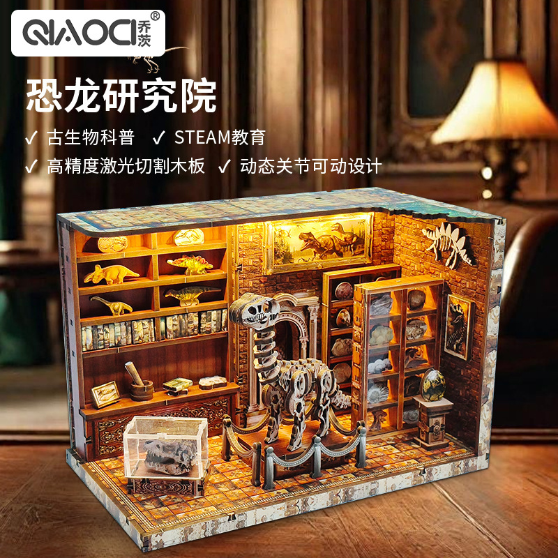 공룡 연구소 DIY 캐빈 손으로 조립한 장난감 나무 책꽂이 작은 집 미니어처 장면 창조적 인 선물