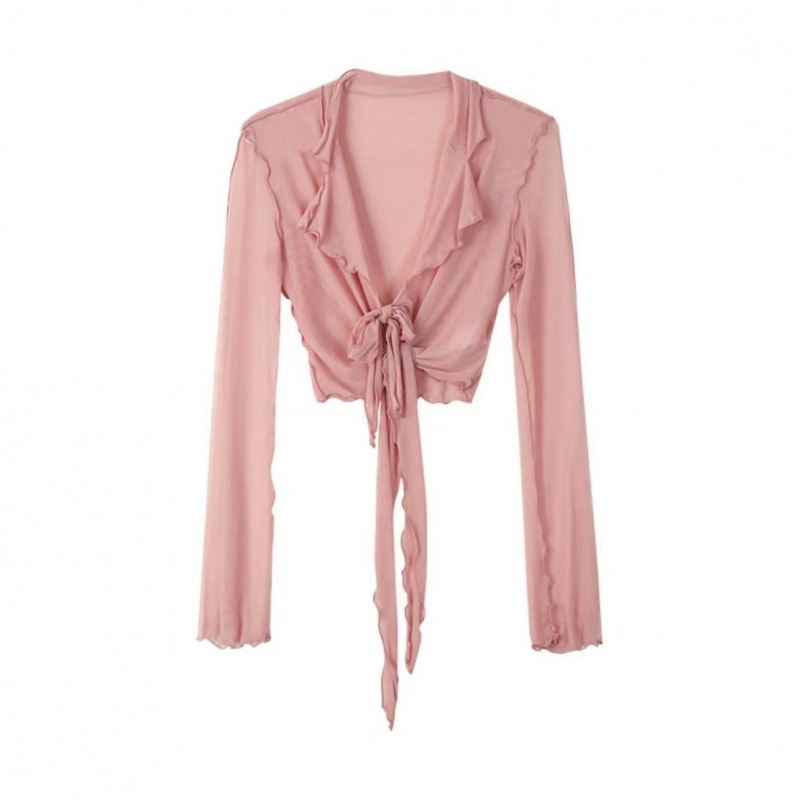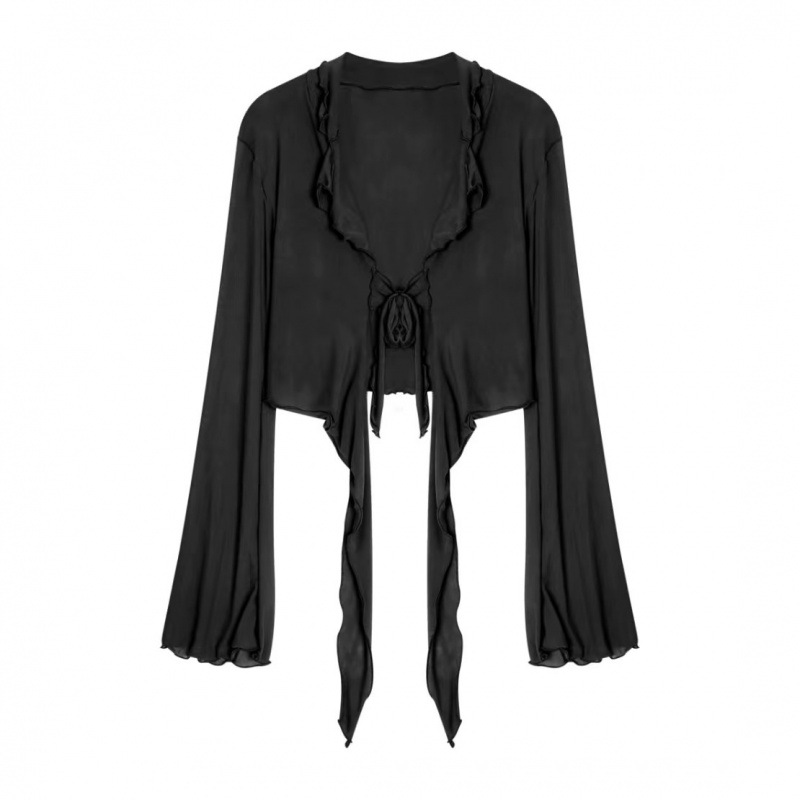 뜨거운 소녀 스타일 순수한 욕망 메쉬 카디건 여성 여름 및 가을 새로운 도착 마이크로 투명 얇은 스트랩 트럼펫 슬리브 슬림 핏 짧은 트렌디 탑스토어 가기