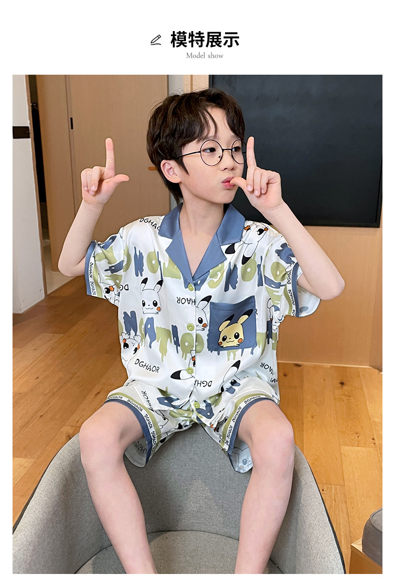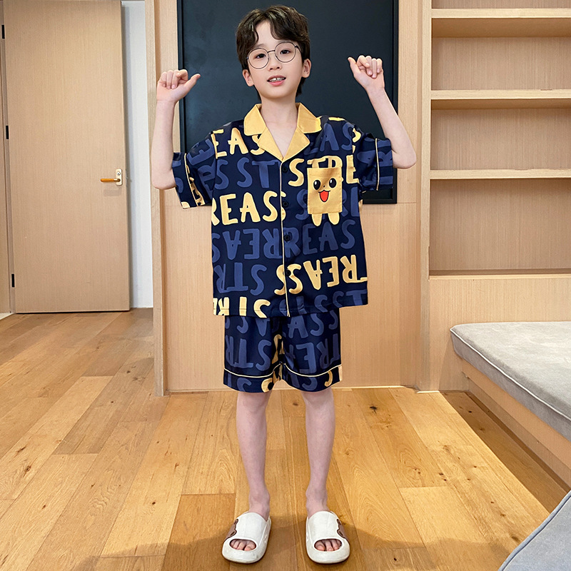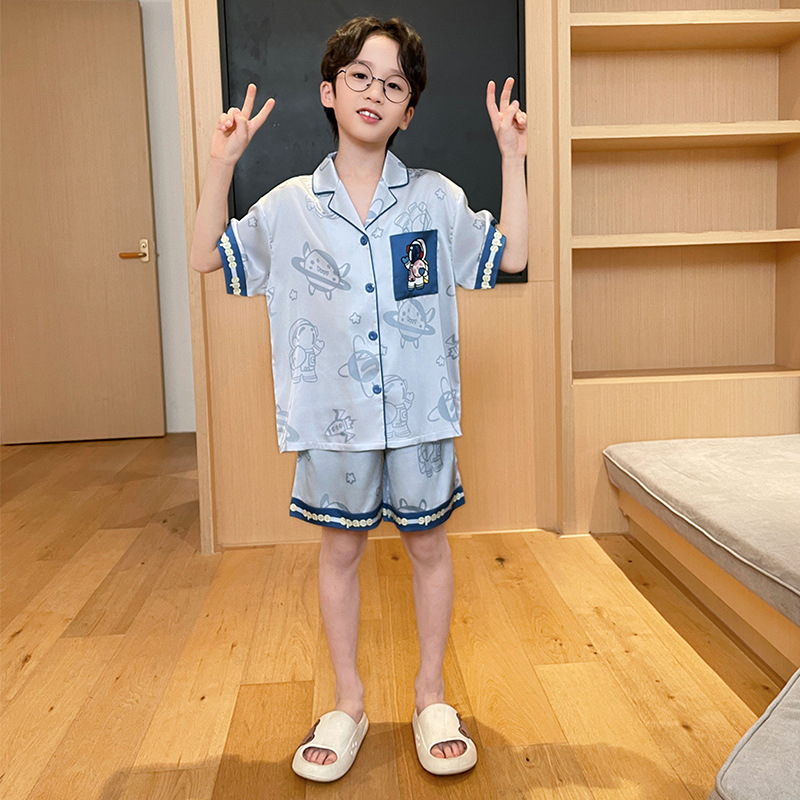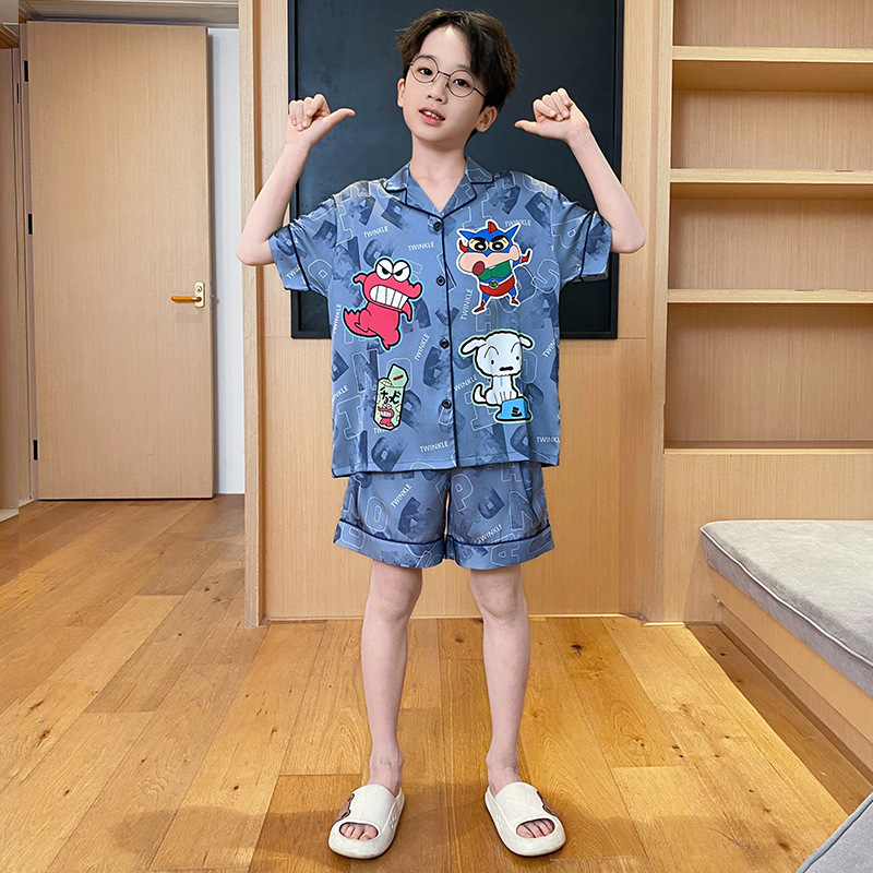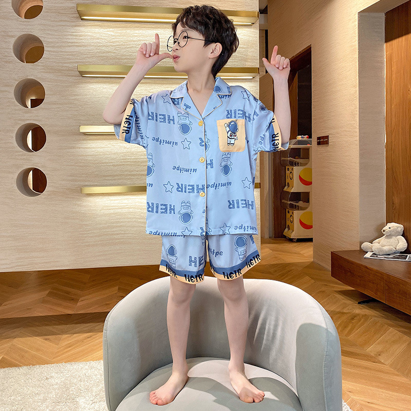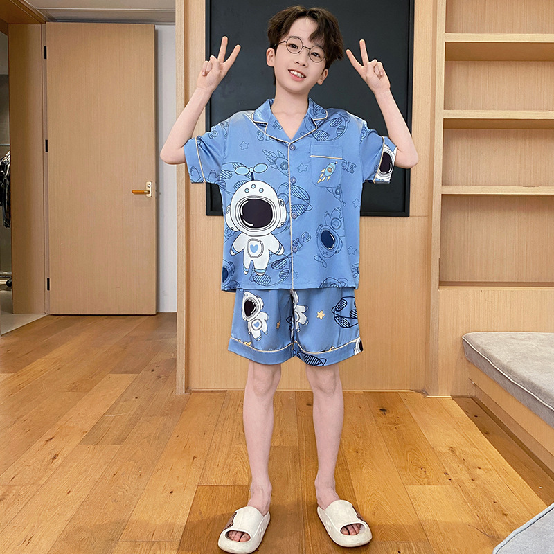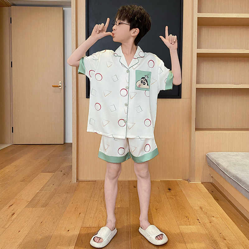 2025 여름 신제품 얼음과 눈 실크 소년 잠옷 여름 반팔 반바지 소년 중년 및 청소년 가정복