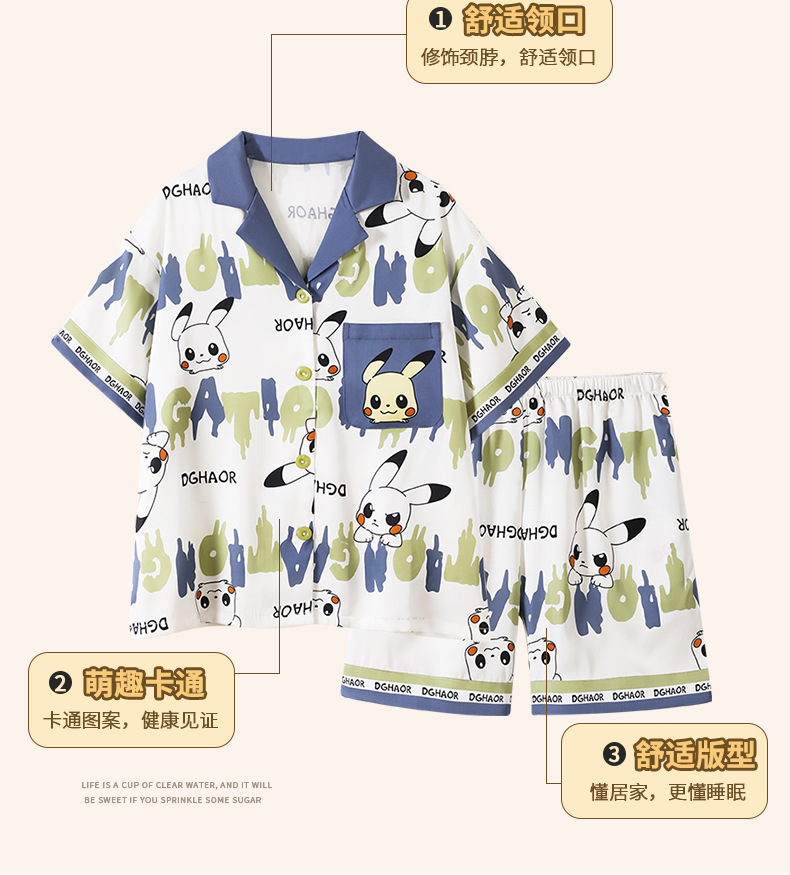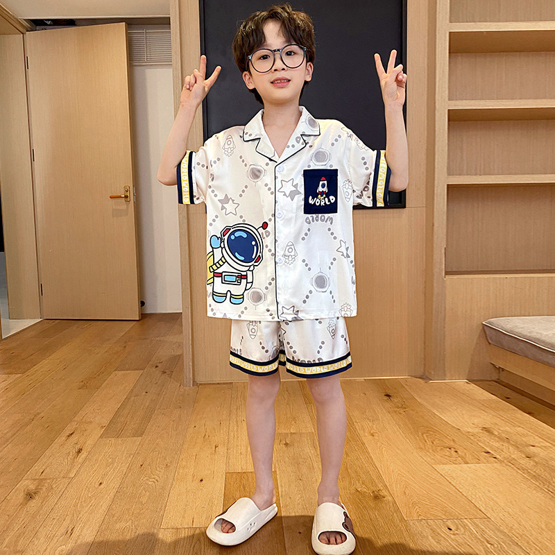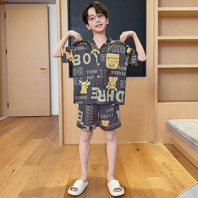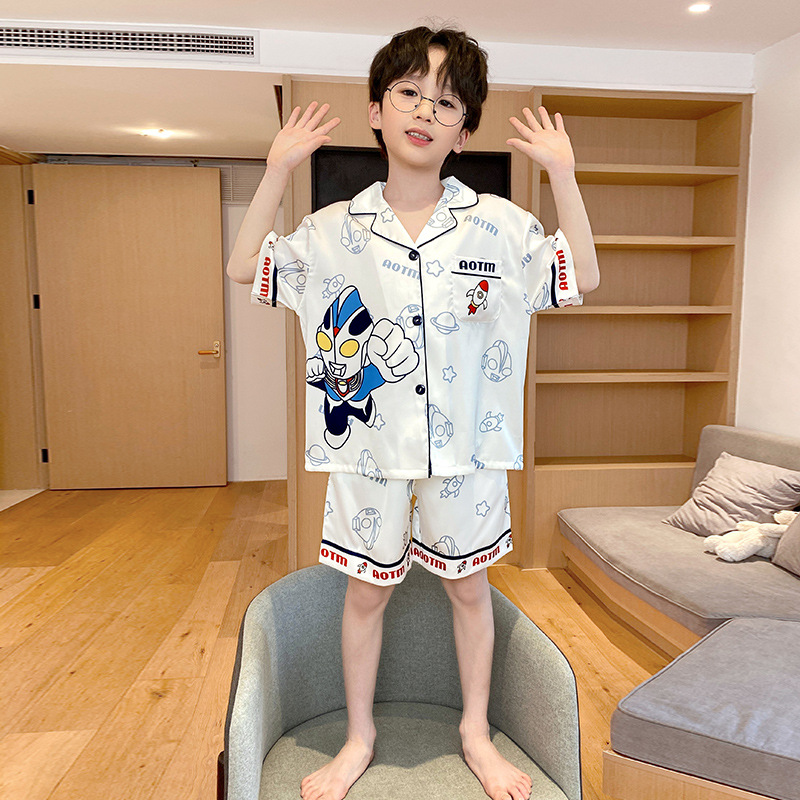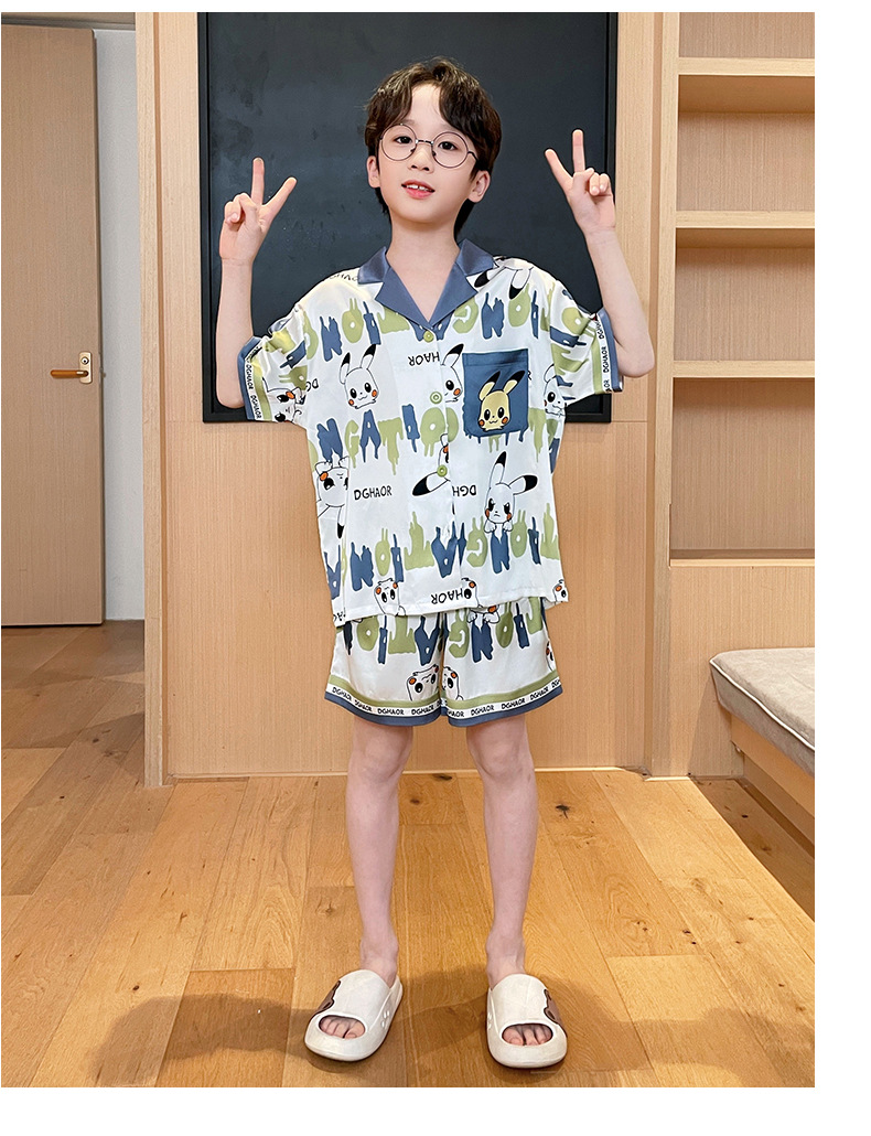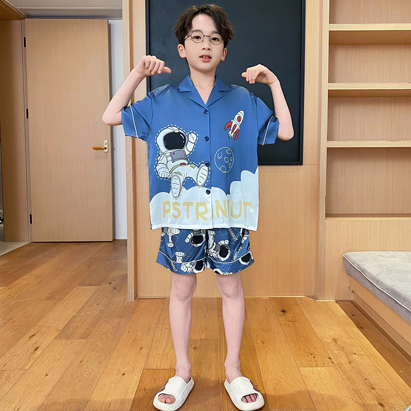 2025 여름 신제품 얼음과 눈 실크 소년 잠옷 여름 반팔 반바지 소년 중년 및 청소년 가정복