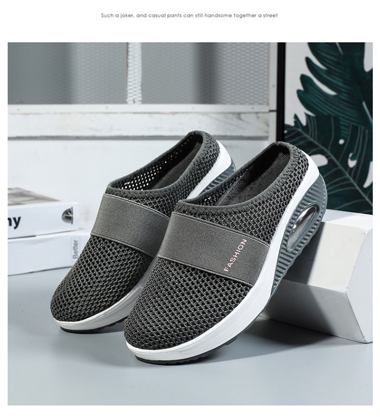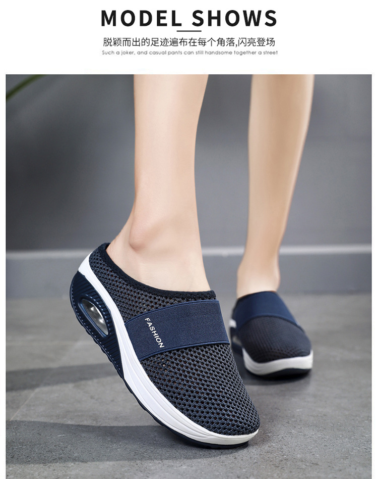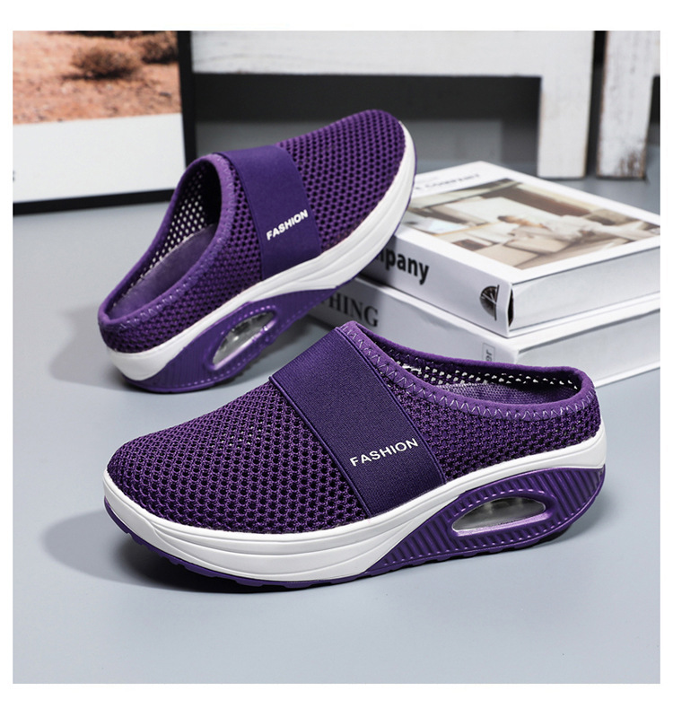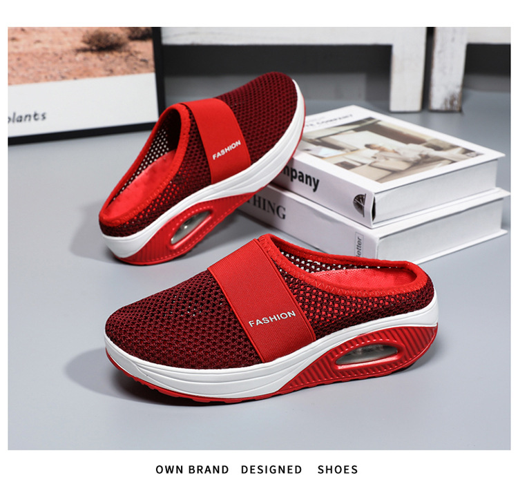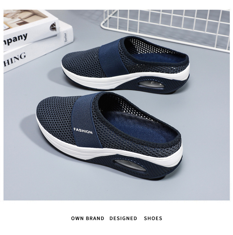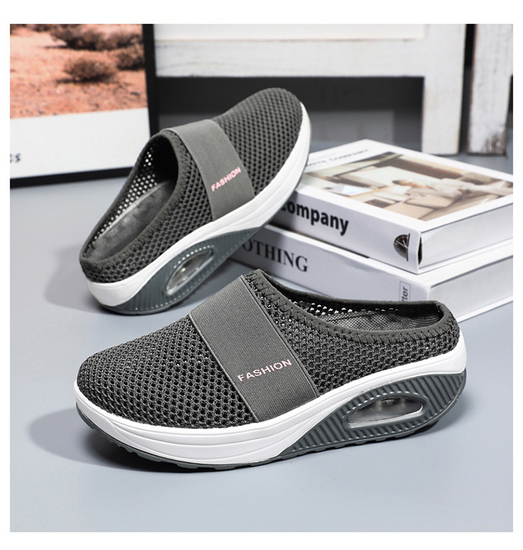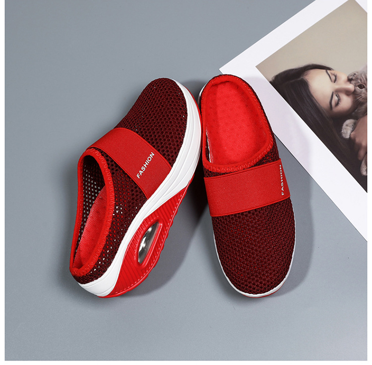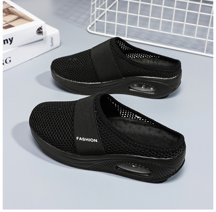 여성을위한 Fujian 제조 업체 크로스 보더 대형 메쉬 슬리퍼 여름 하프 슬리퍼 에어 쿠션 캐주얼 스포츠 신발 플라이 짠 메쉬